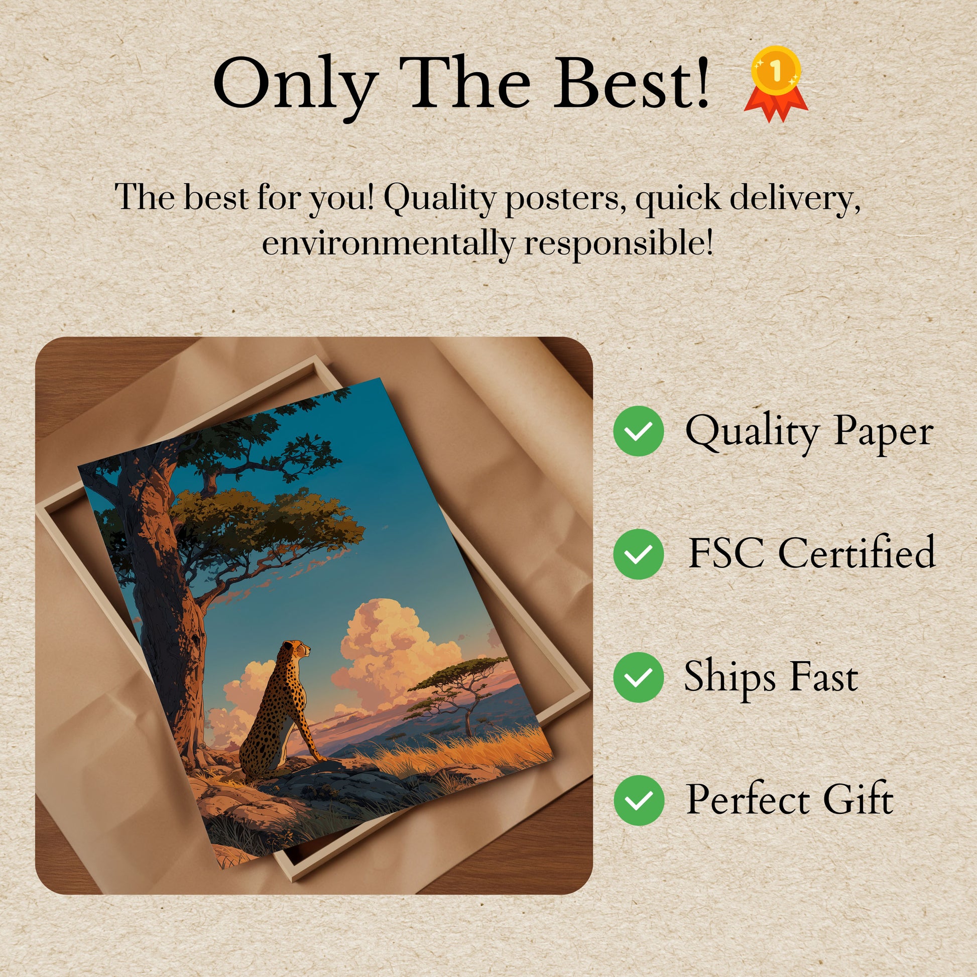 Experience the breathtaking majesty of an African landscape as a solitary cheetah perches atop a rocky outcrop, surveying the golden grasslands and dramatic cloudy sky. This stunning artwork captures the essence of wilderness, with warm orange and deep blue tones creating a mesmerizing visual symphony of nature's grandeur. The cheetah's poised silhouette against the expansive backdrop evokes a sense of quiet strength and untamed beauty.