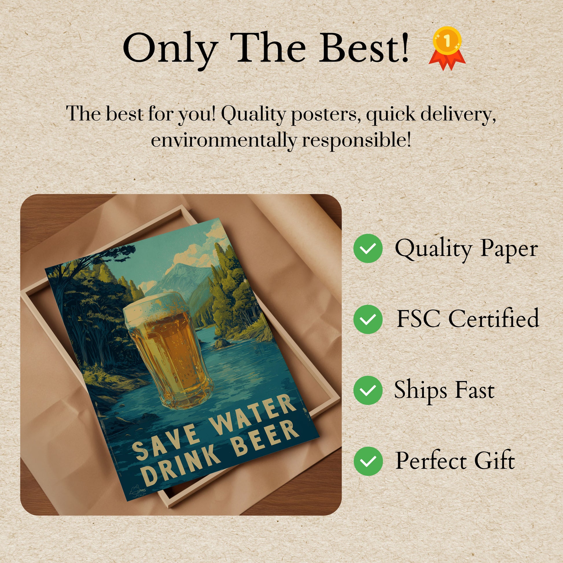 Immerse yourself in this stunning vintage beer poster that transforms a scenic mountain river landscape into a playful environmental statement. The golden beer glass stands proudly in the center, reflecting the lush green forests and majestic mountain backdrop, creating a humorous yet visually captivating artwork that celebrates nature and brewing. With its rich teal and yellow-green color palette, this poster brilliantly combines ecological humor with nostalgic graphic design.