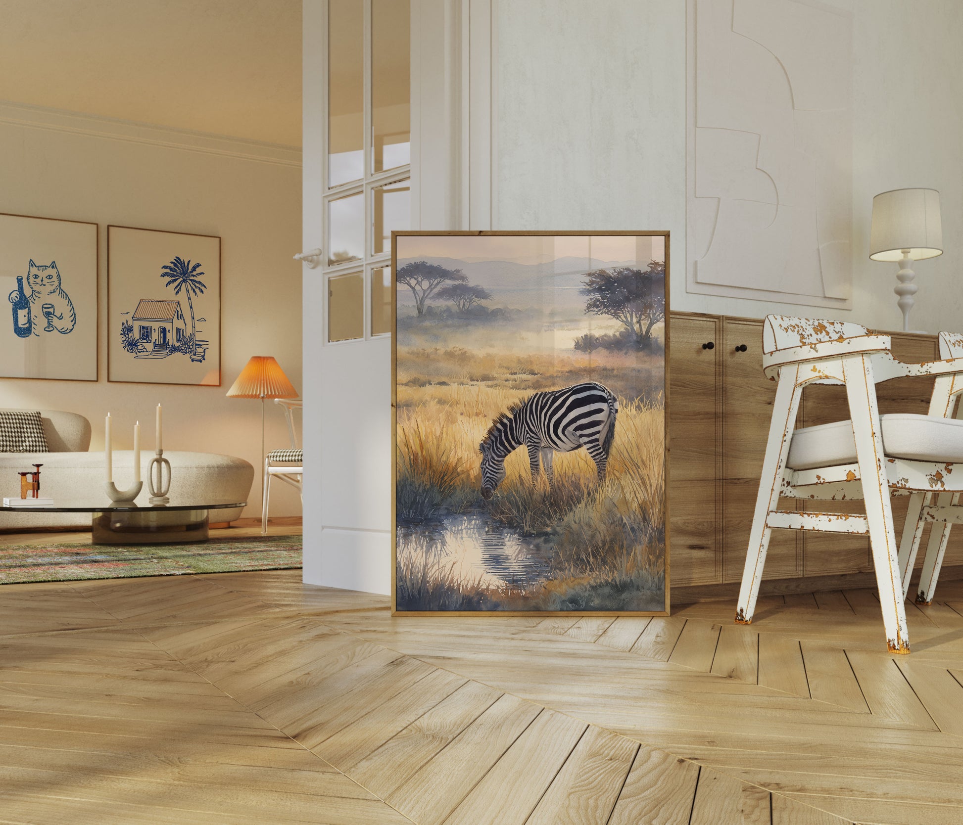 Transport yourself to the golden grasslands of Africa with this breathtaking watercolor artwork featuring a solitary zebra drinking from a misty watering hole. Soft, ethereal hues of amber and dusty blue capture the tranquil early morning light, with acacia trees silhouetted against a dreamy landscape. The intricate black and white stripes of the zebra contrast beautifully with the warm, textured grasses, creating a scene of peaceful wilderness.