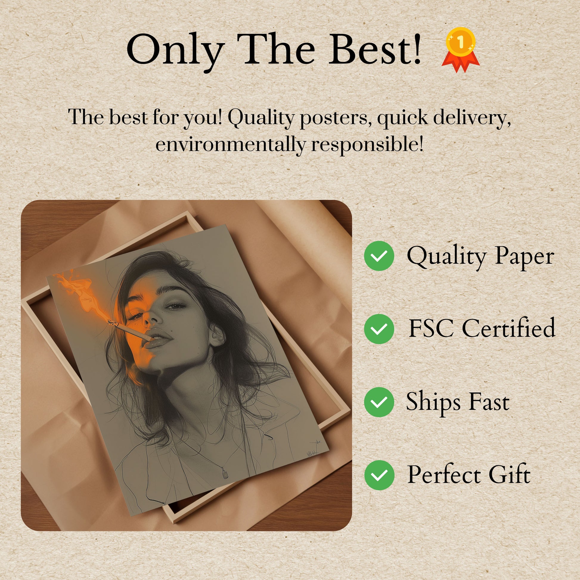 Dive into a mesmerizing black and white portrait with a vibrant orange flame that transforms this artwork into a powerful visual narrative. The subject emerges with intense, contemplative energy, a lit cigarette casting an ethereal orange glow that cuts through the monochromatic sketch. Expertly rendered with delicate pencil lines and dramatic color contrast, this poster captures a moment of raw, introspective emotion that commands attention and sparks imagination.