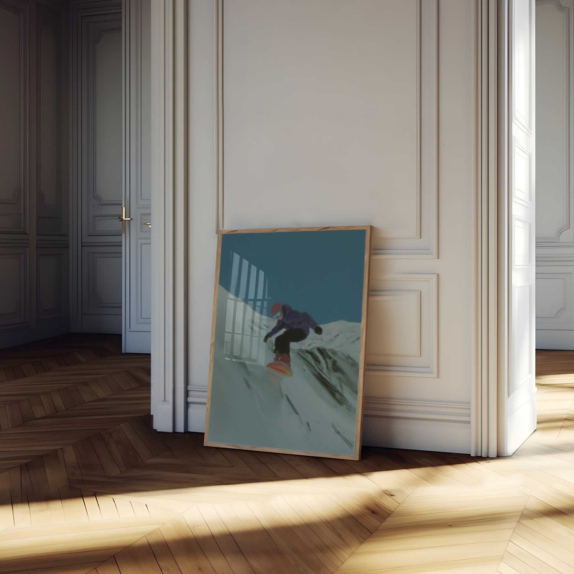 Dive into the exhilarating world of alpine adventure with this stunning snowboarding poster that captures the raw energy of a winter sports descent. Rendered in dreamy, blurred tones of blue and white, the image showcases a snowboarder carving a dynamic path down a pristine snow-covered slope, embodying the pure freedom and adrenaline of mountain exploration. The soft, almost ethereal color palette creates a sense of motion and intensity that will electrify any room.