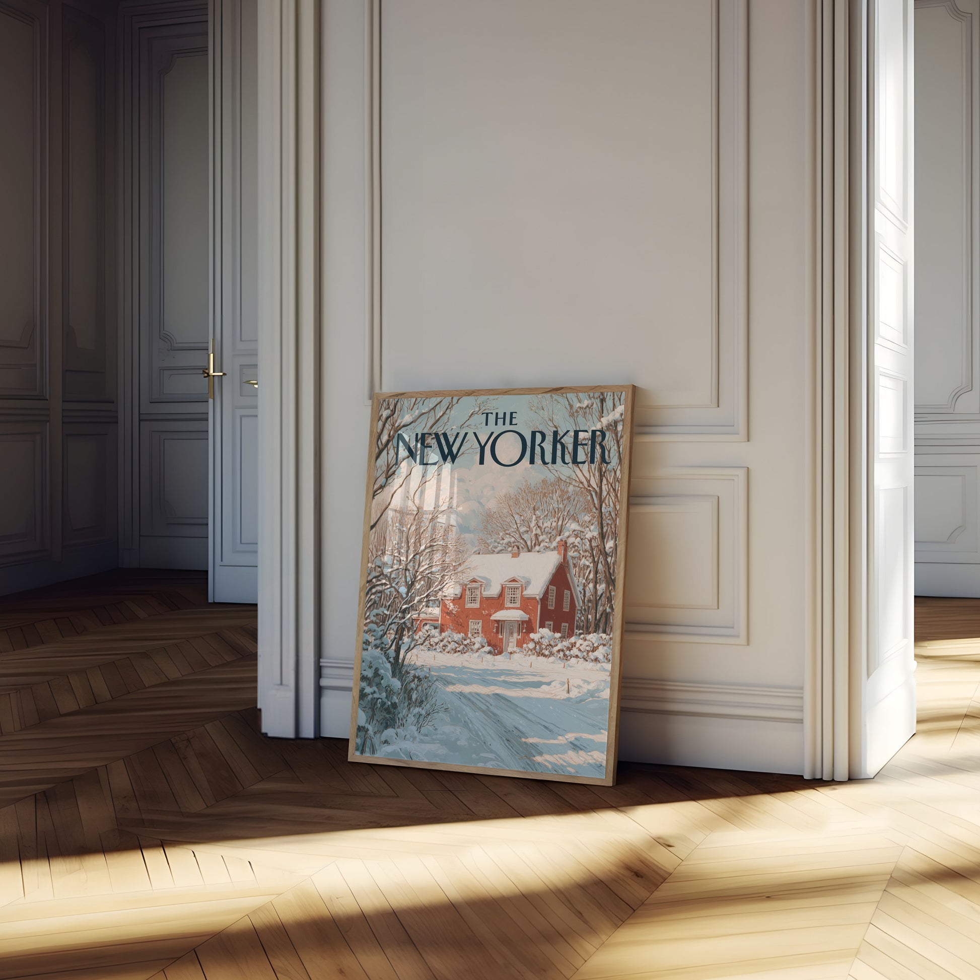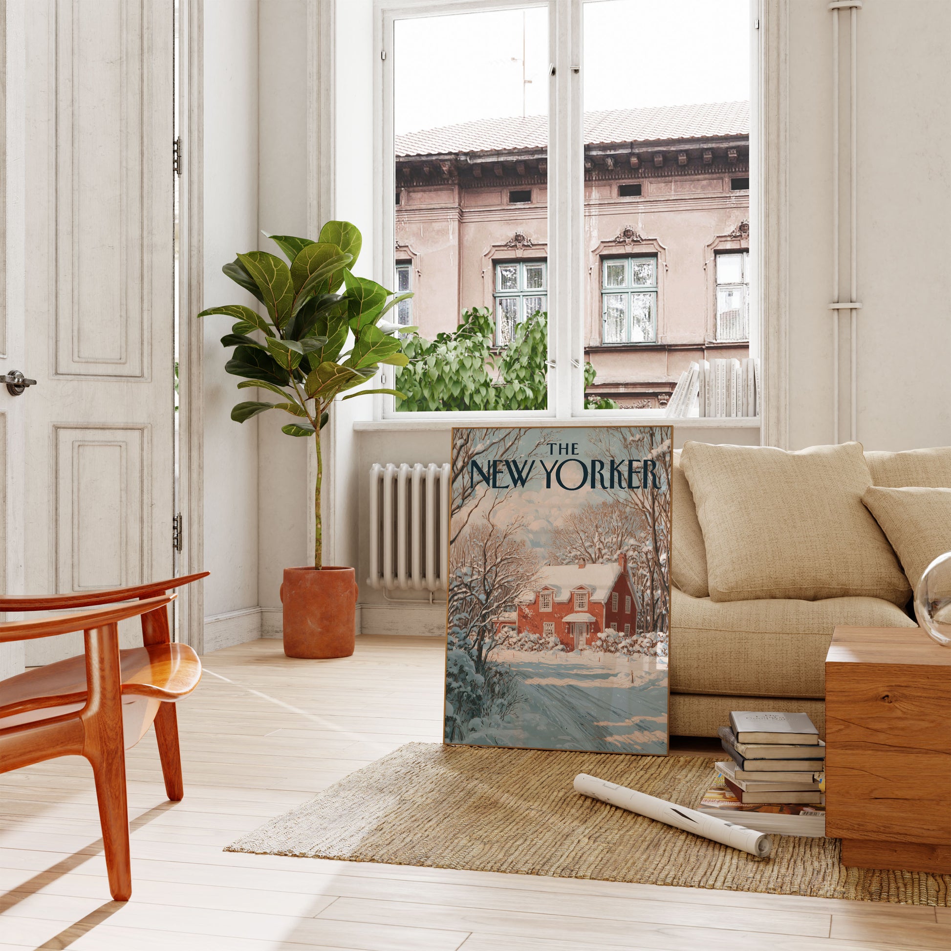 Immerse yourself in the serene beauty of a classic New England winter scene with this enchanting New Yorker magazine cover poster. A charming red brick house nestles among snow-laden trees, creating a tranquil landscape that captures the quiet magic of a cold winter's day. Soft blue and white tones blend with the warm terracotta of the house, evoking a sense of cozy comfort and nostalgic winter tranquility.