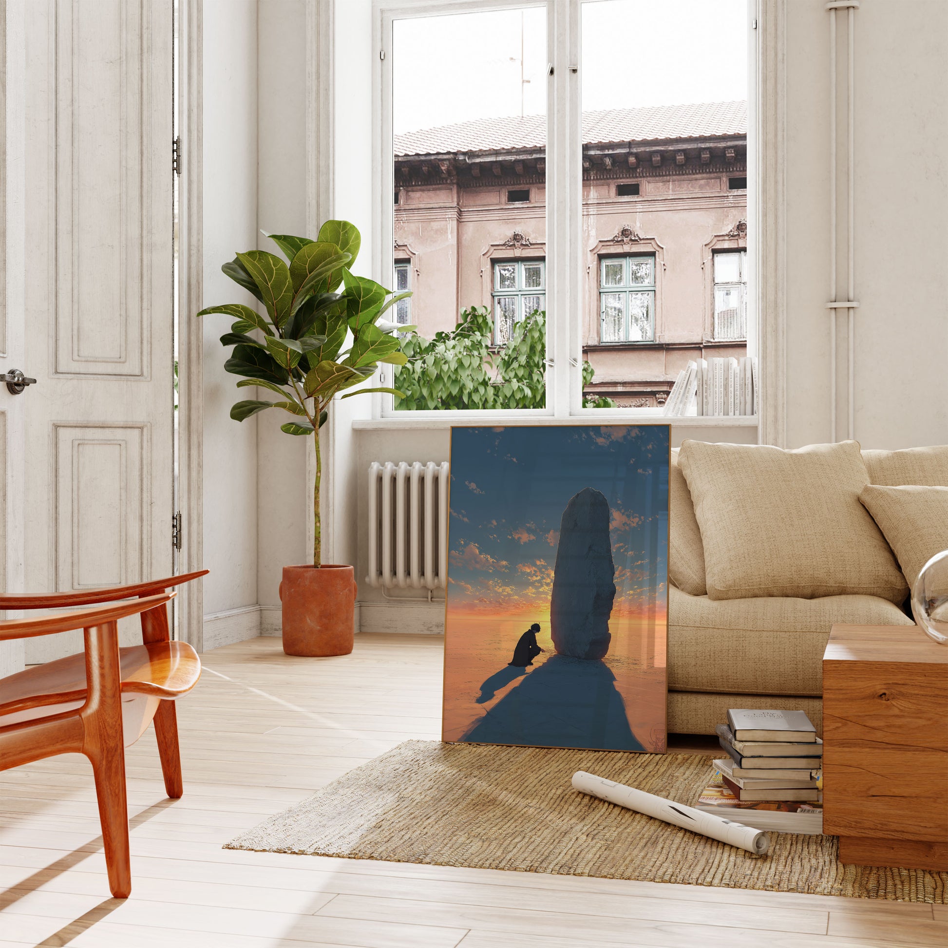 A mesmerizing landscape captures a lone figure kneeling beside a towering monolithic stone, silhouetted against a breathtaking sunset. The image evokes a sense of contemplation and wonder, with warm orange and golden hues blending into a deep blue sky dotted with soft clouds. The massive stone stands as a silent guardian, casting a long shadow across a seemingly endless, smooth surface that could be ice or water.