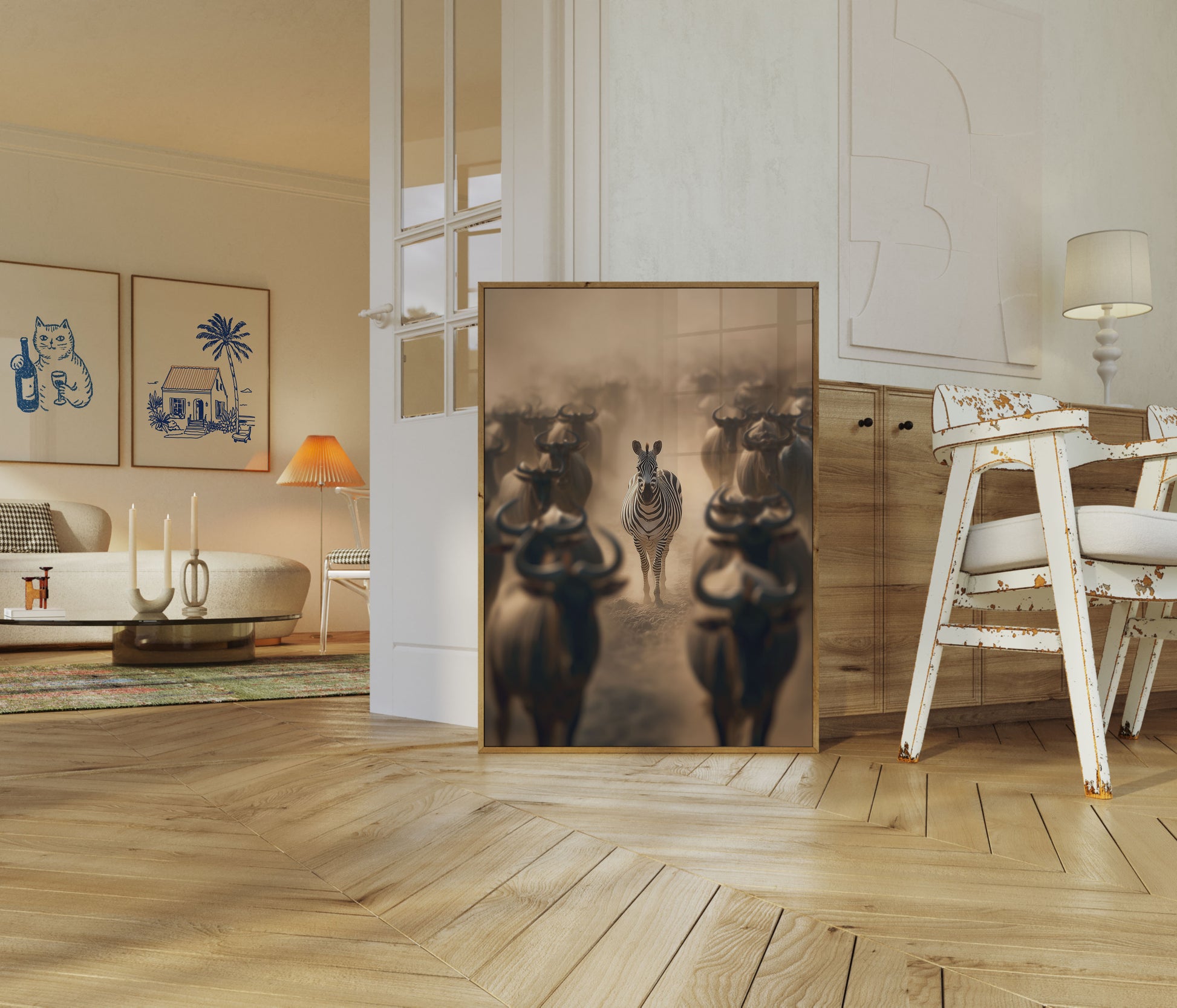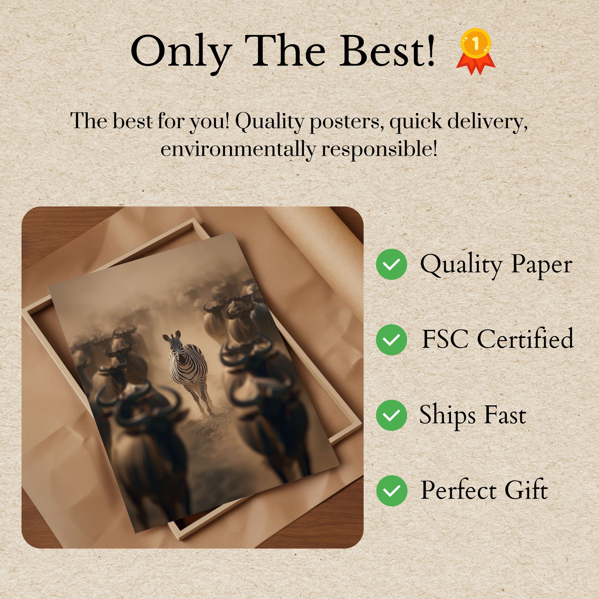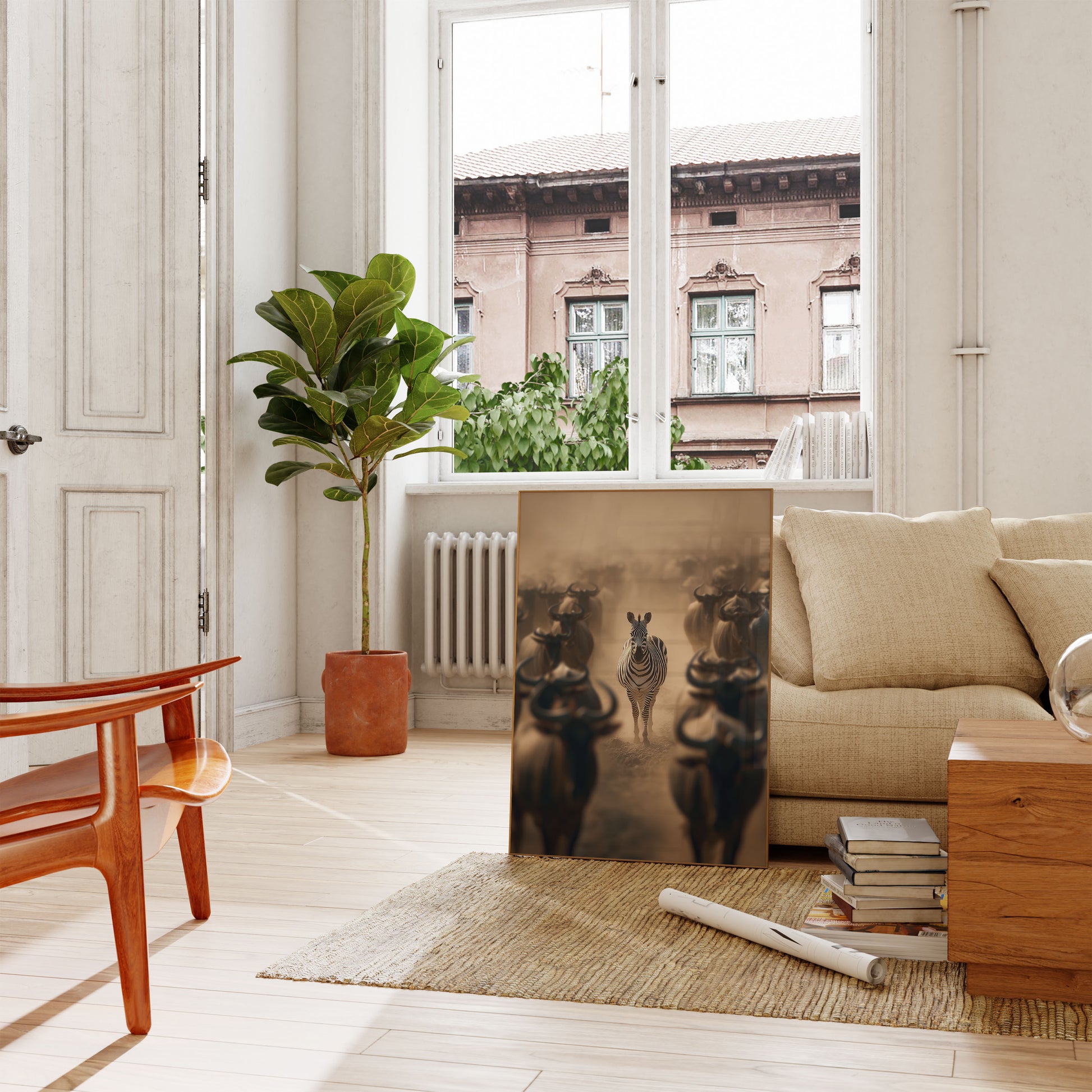A striking visual narrative of resilience and individuality, this dramatic wildlife poster captures a lone zebra standing confidently amidst a herd of blurred wildebeest. The sepia-toned landscape creates a powerful atmosphere of isolation and strength, with the zebra's crisp black and white stripes standing in sharp contrast to the dusty, muted background. The image powerfully symbolizes standing out and maintaining one's unique identity even in the midst of overwhelming conformity.