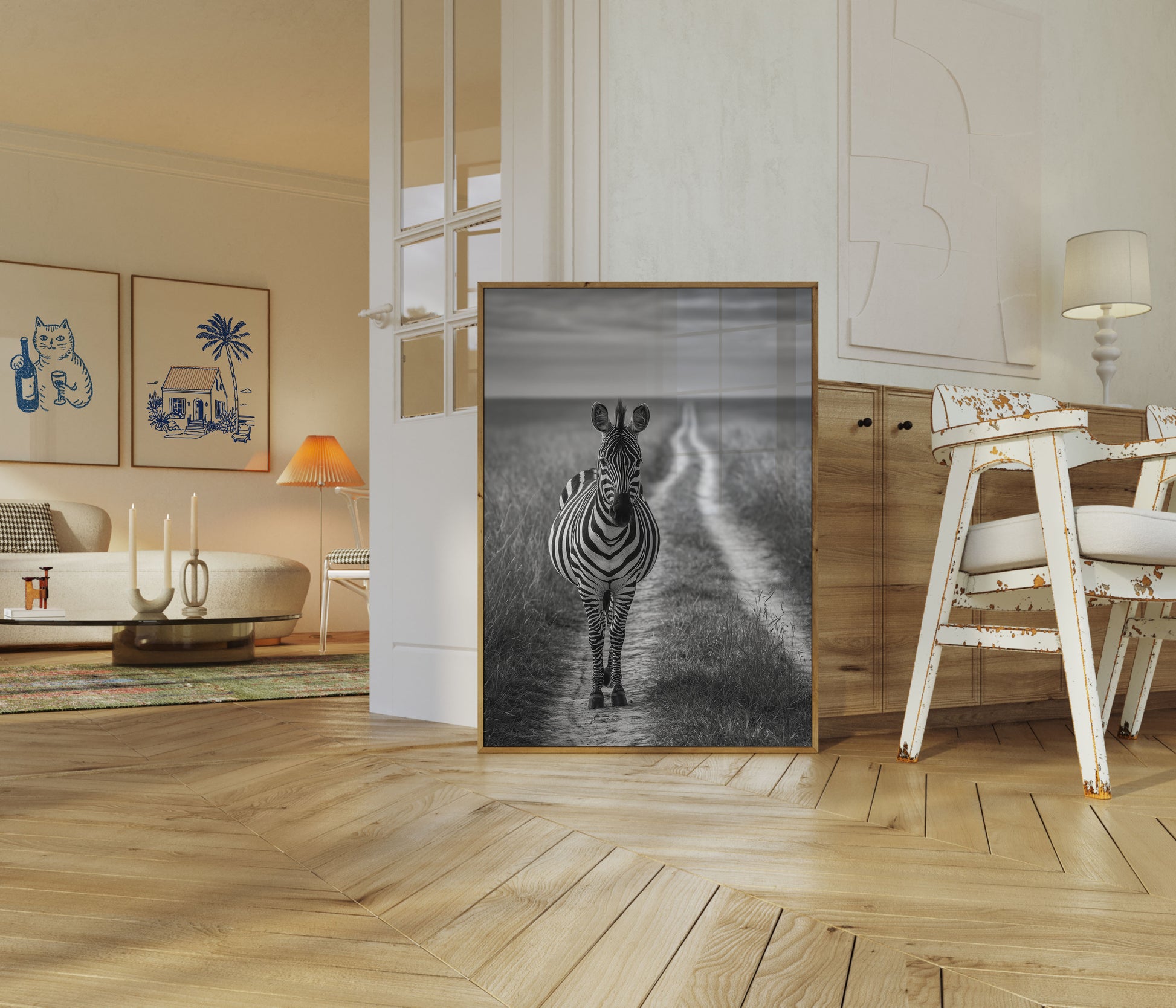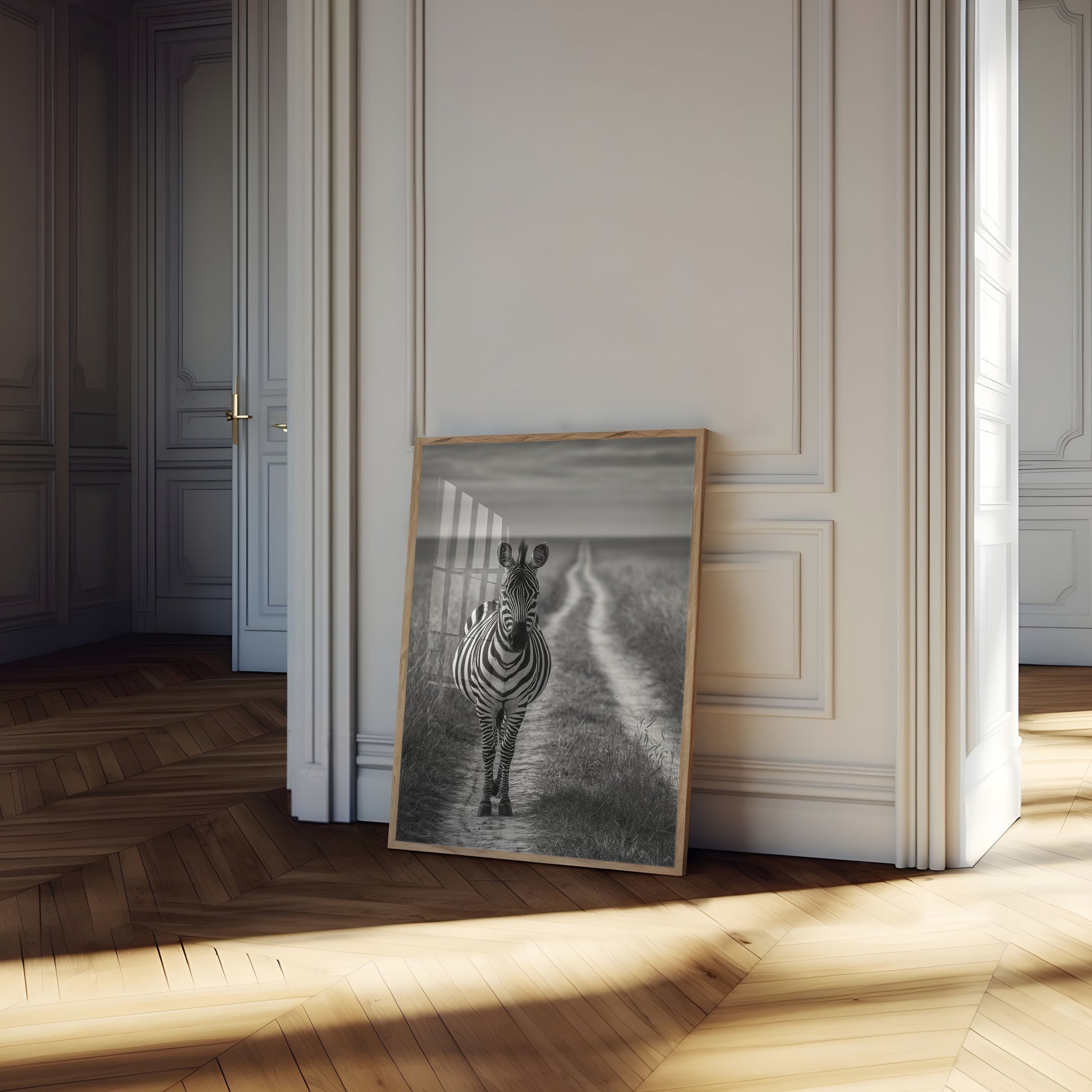 Discover an arresting black and white portrait of a zebra standing boldly on a winding grassland path, where dramatic monochrome tones create an atmosphere of quiet strength and natural beauty. The zebra's iconic stripe pattern stands in stark contrast against the misty, soft-focus landscape, drawing the viewer into a moment of serene contemplation of wildlife's majestic presence. This stunning artwork captures the essence of African savanna solitude, inviting viewers to pause and appreciate the raw elegance of nature.