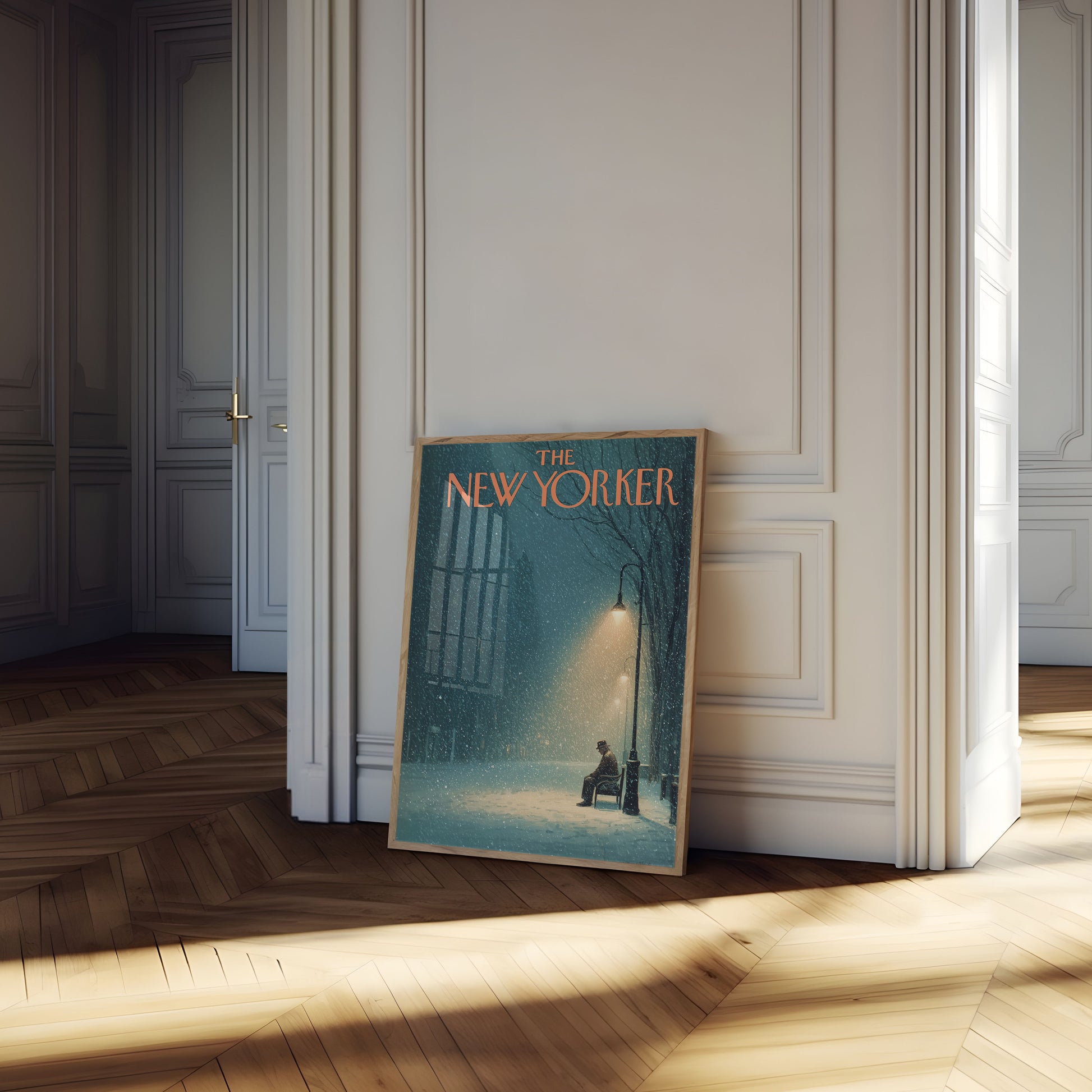 A mesmerizing winter scene captures the essence of urban loneliness from The New Yorker magazine cover. A solitary figure sits on a bench under a softly glowing street lamp, surrounded by a gentle snowfall that transforms the cityscape into a dreamlike, tranquil environment. The deep teal and warm golden hues create a poignant atmosphere of quiet reflection and peaceful isolation.