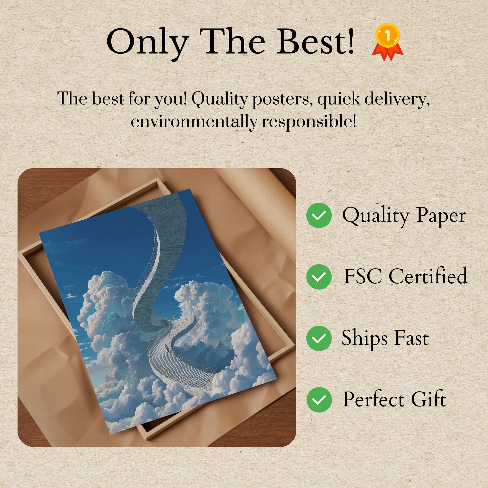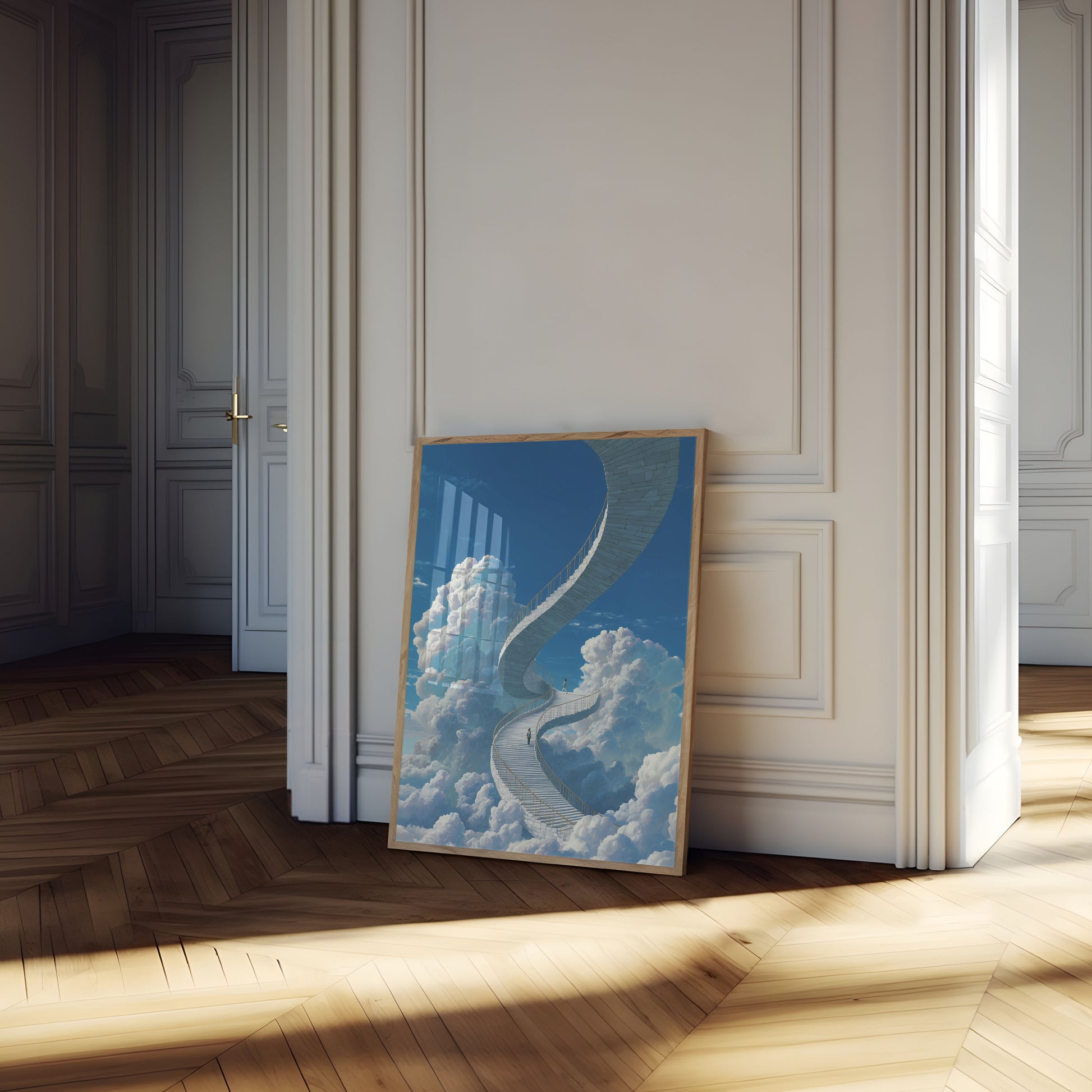 Embark on a breathtaking journey through a dreamlike landscape where a spiraling white staircase winds majestically through towering cumulus clouds. Inspired by Studio Ghibli's ethereal aesthetic, this poster captures a surreal ascent into an endless blue sky, with tiny figures climbing the infinite steps, symbolizing personal growth and spiritual exploration. The soft, luminous clouds and pristine architectural marvel create a sense of wonder and infinite possibility.