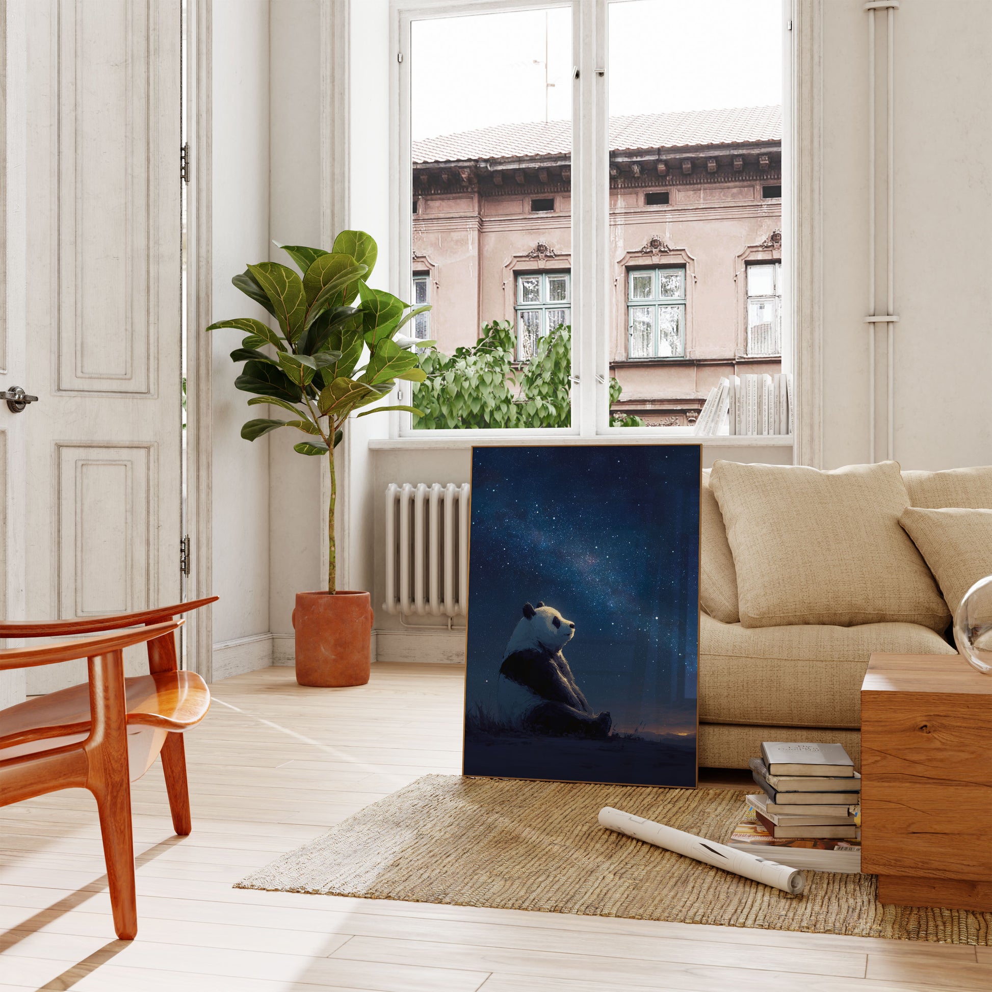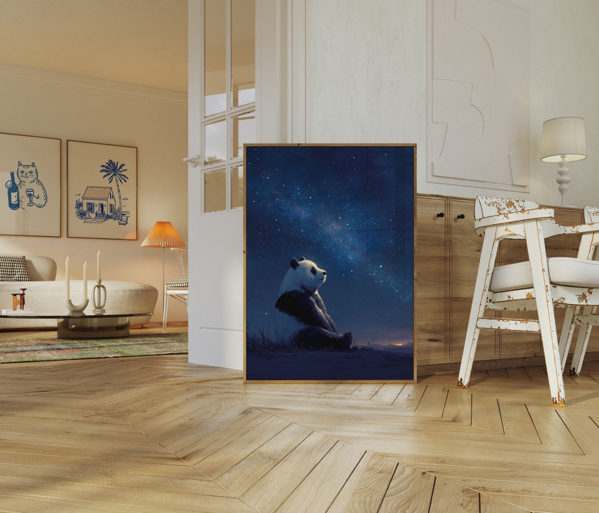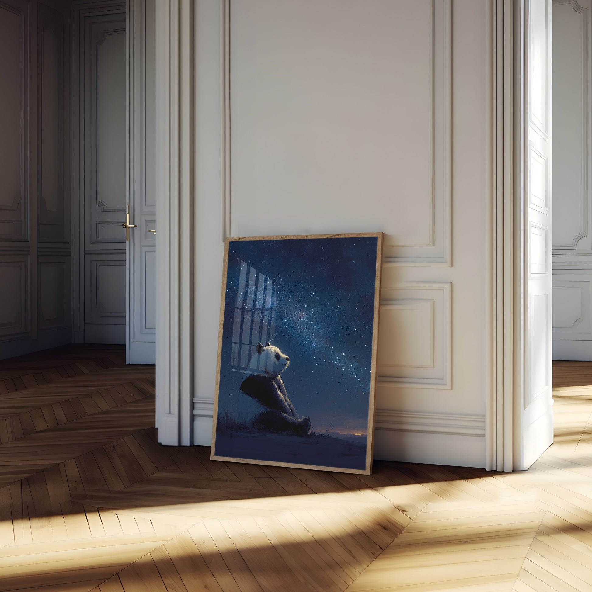Experience the magic of a lone panda contemplating the vast, luminous Milky Way in this breathtaking celestial artwork. Set against a deep blue night sky filled with sparkling stars, the panda sits peacefully on the ground, its silhouette a stark contrast to the infinite cosmic beauty above. The image captures a serene moment of quiet reflection, where the beauty of nature and the universe merge into a single, awe-inspiring scene.