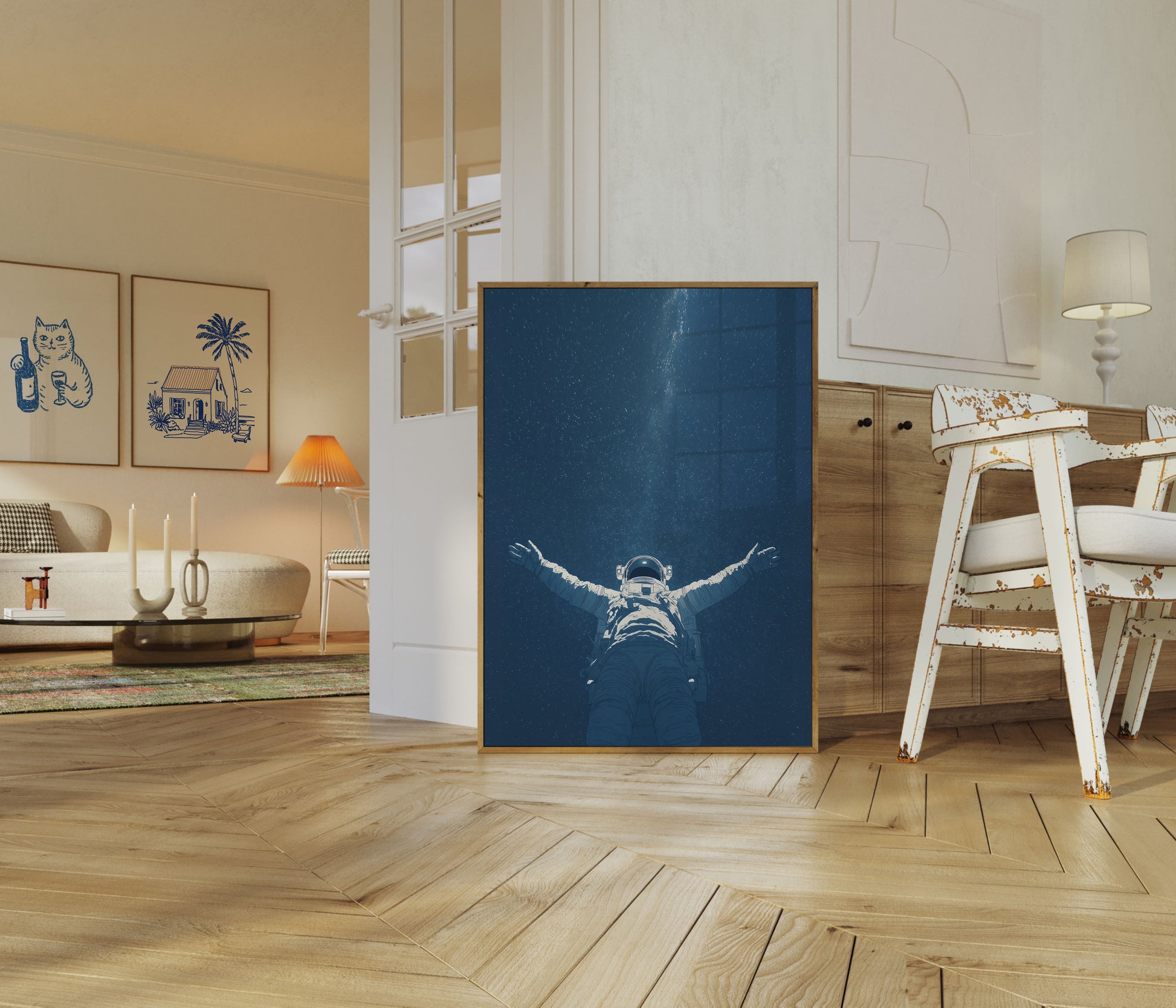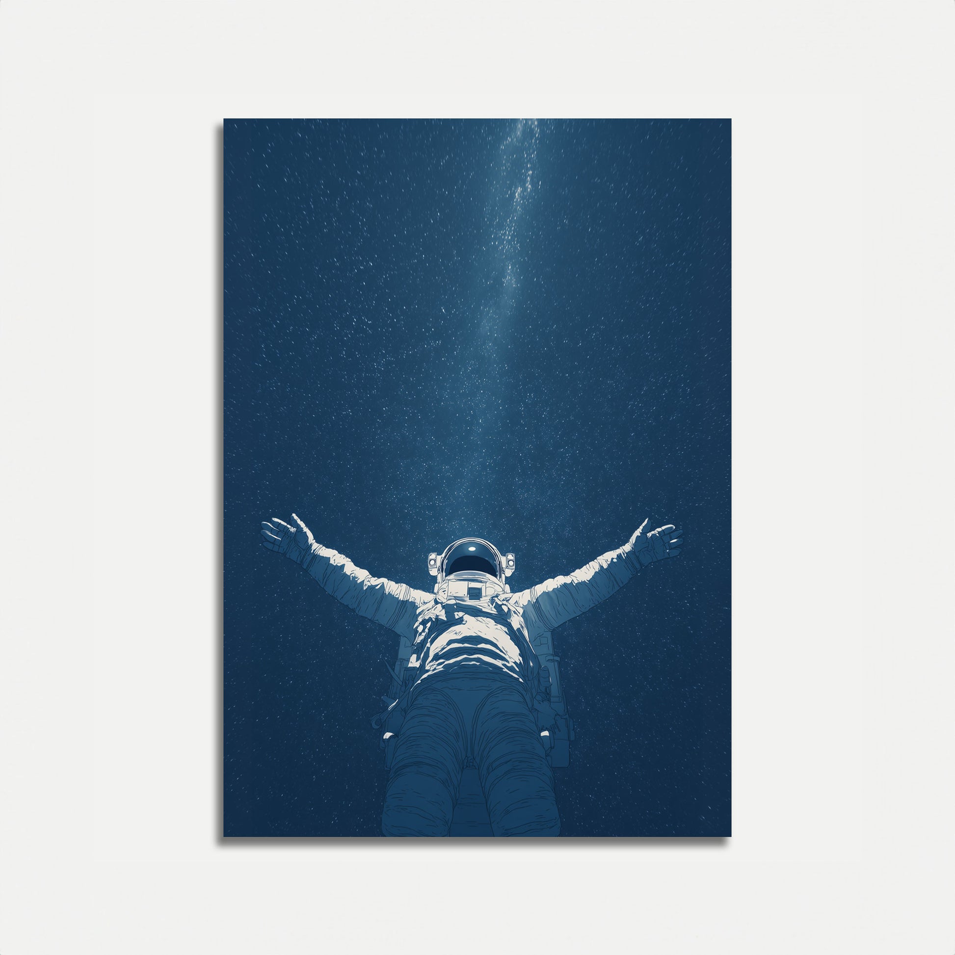 Drift into the infinite wonder of the cosmos with this breathtaking astronaut poster. Capturing a solitary figure suspended against a deep blue starfield, the image evokes a sense of profound solitude and boundless exploration. The astronaut's outstretched arms create a powerful silhouette, inviting viewers to feel the immense beauty and isolation of space.