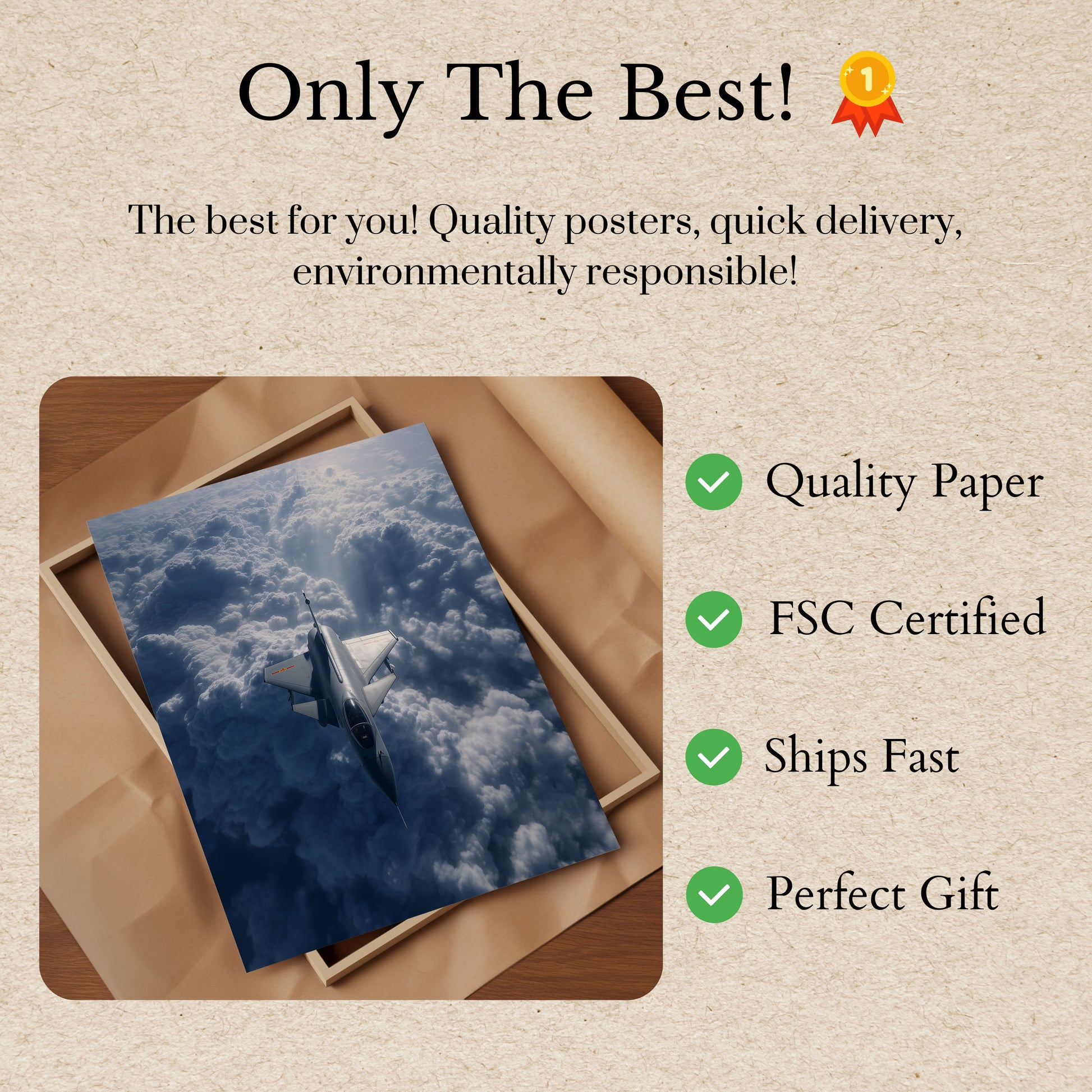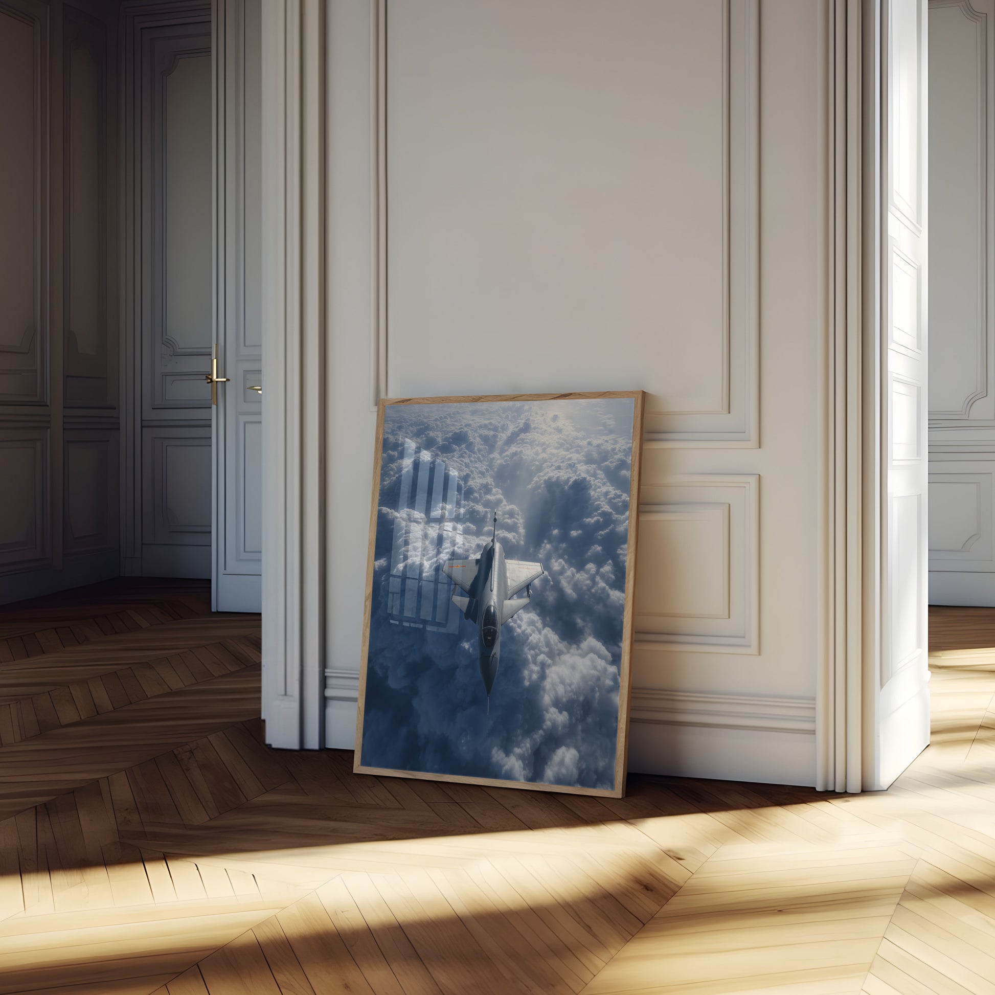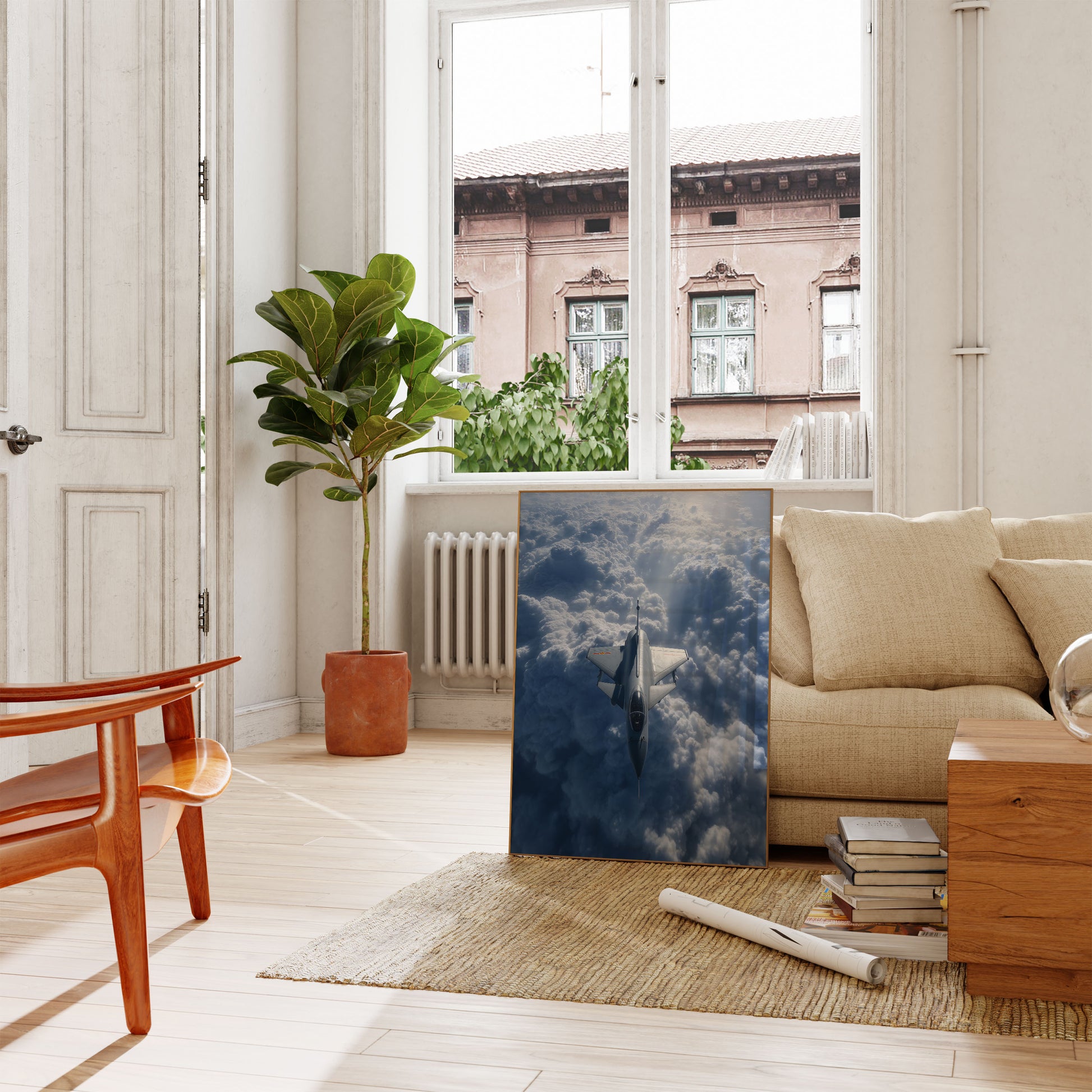 Soar through a dramatic cloudscape with this breathtaking jet fighter poster that captures the raw power and precision of aerial engineering. The sleek fighter aircraft cuts a sharp silhouette against a billowing, monochromatic cloud formation, creating a stunning visual that embodies speed, technology, and the ethereal beauty of flight. Cool blue tones and intricate cloud textures provide a mesmerizing backdrop that elevates this image from a simple photograph to a powerful artistic statement.