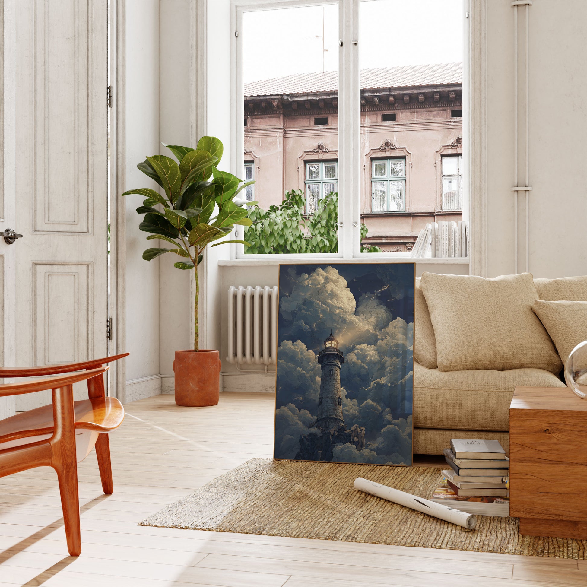 A mesmerizing artwork that captures the raw power and ethereal beauty of a lone lighthouse standing resolute amidst towering, lightning-infused storm clouds. The stone lighthouse glows with an inner light, piercing through the dramatic blue-gray cloudscape, symbolizing hope and resilience in the face of nature's most intense moments. Delicate lightning threads weave through billowing clouds, creating a breathtaking scene of atmospheric drama and quiet strength.