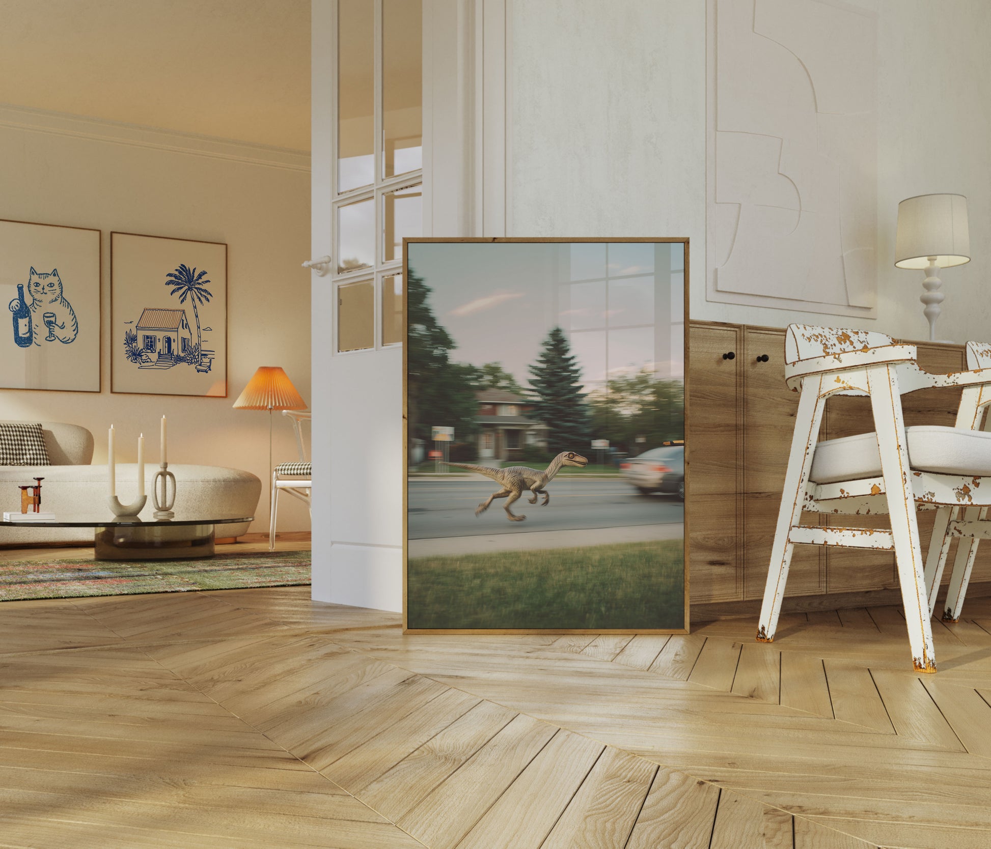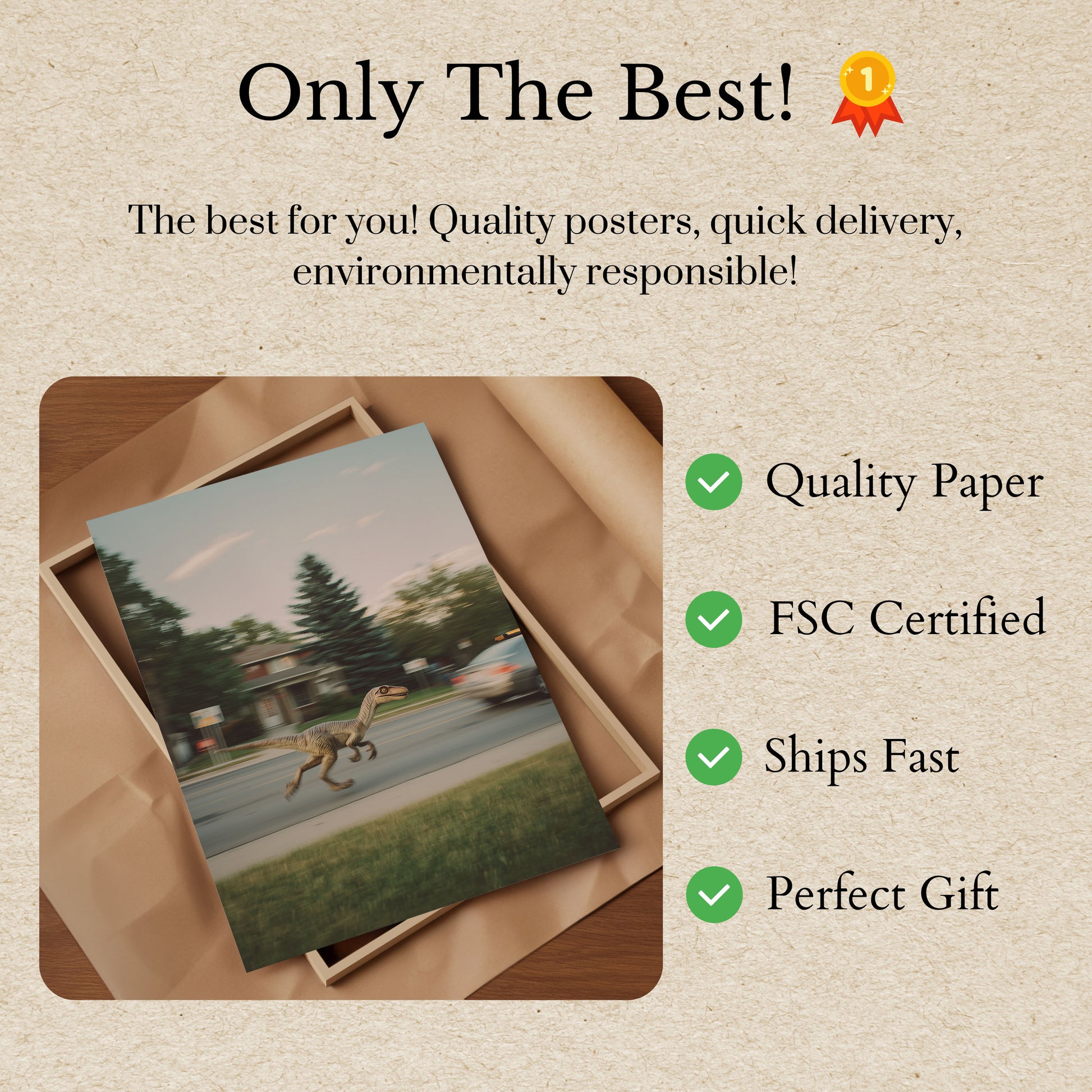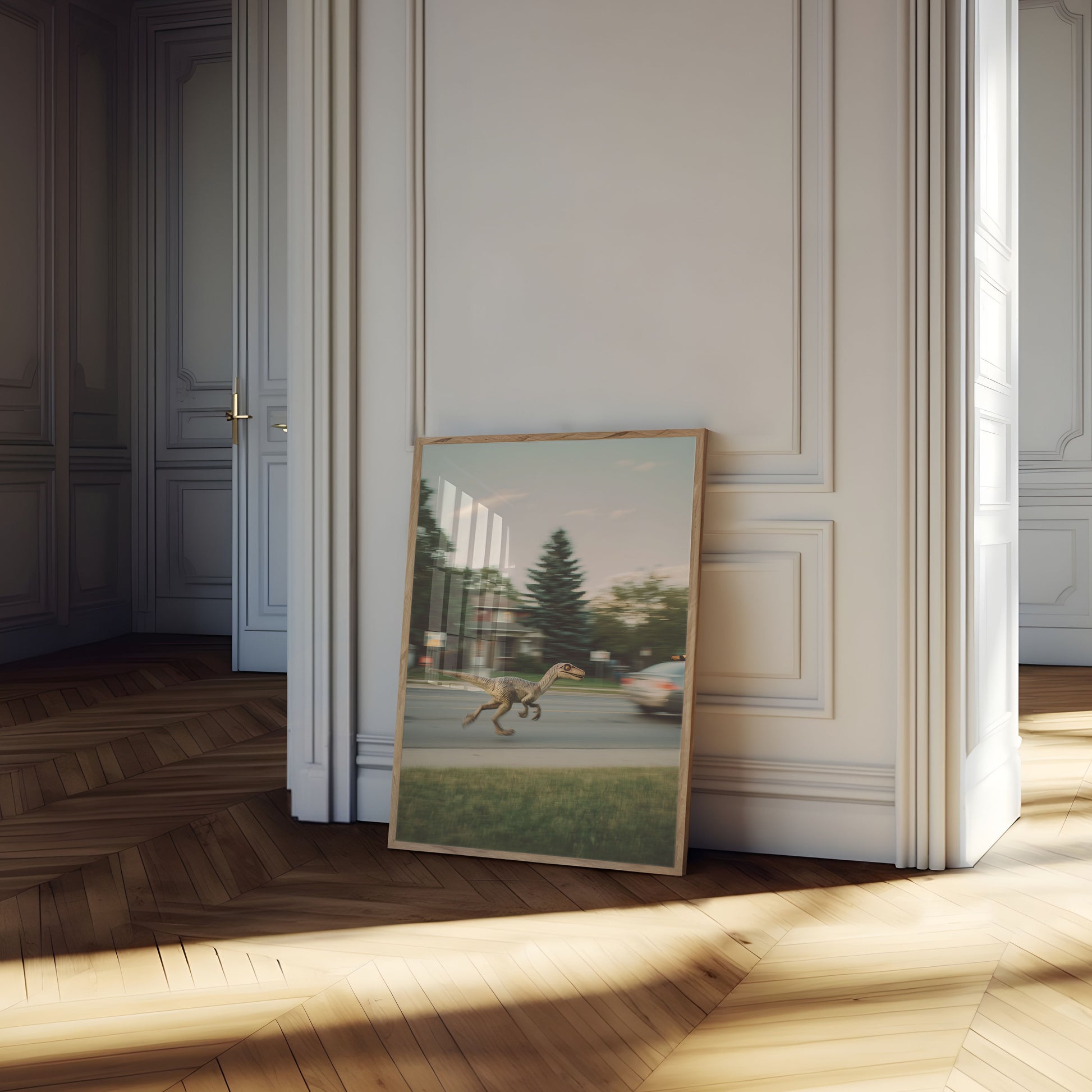 Imagine a surreal moment where a prehistoric predator unexpectedly races down a quiet suburban street, blurring the lines between prehistoric wilderness and modern neighborhood. This dynamic poster captures a lifelike velociraptor mid-sprint, with blurred houses and trees creating a sense of motion and unexpected adventure. The soft pastel sky and green grass contrast brilliantly with the dinosaur's intense movement, creating a playful yet slightly unsettling scene that will spark conversations and imaginations.