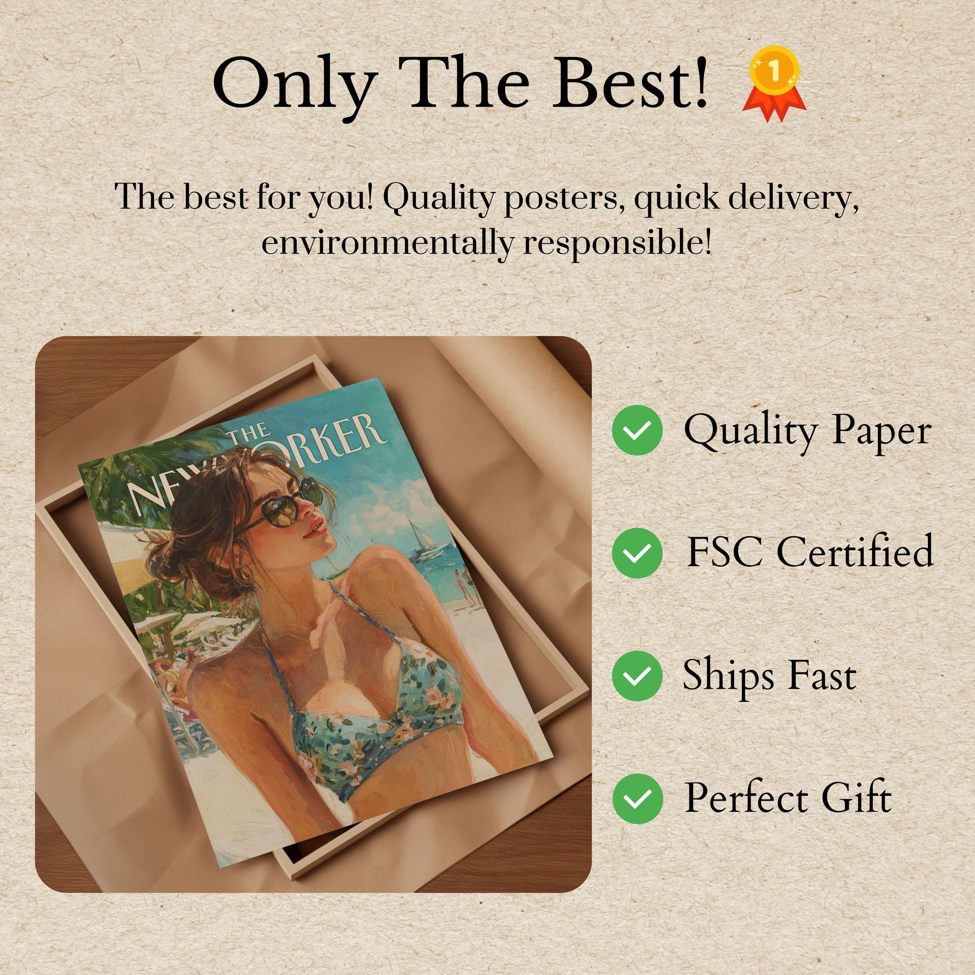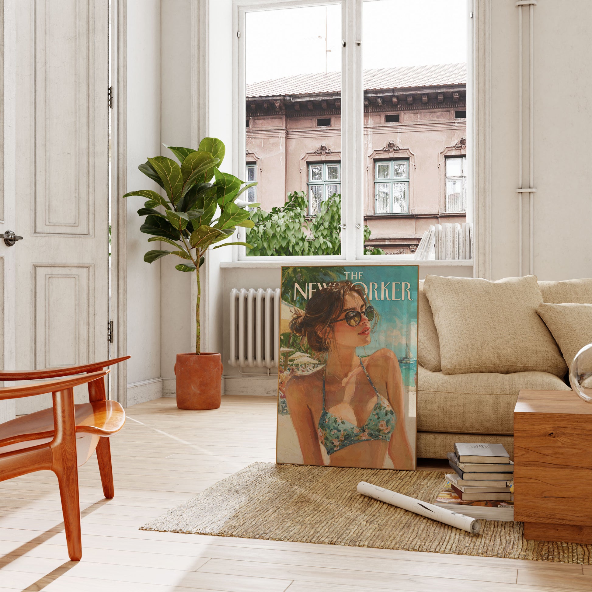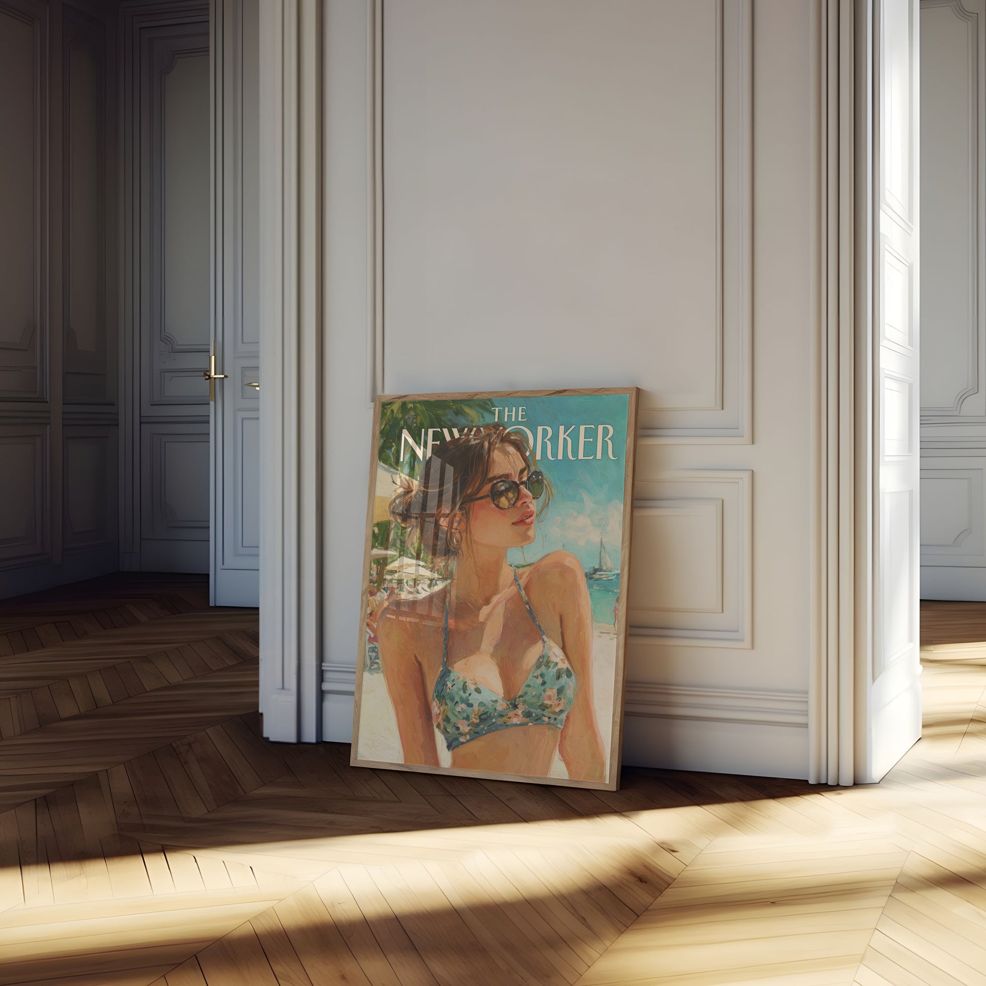 Transport yourself to a sun-drenched coastal paradise with this stunning New Yorker magazine-inspired artwork. The image captures a stylish woman in a floral bikini, wearing chic sunglasses and looking off into the distance, embodying the essence of summer relaxation. Soft blues, warm oranges, and delicate floral patterns create a dreamy, nostalgic atmosphere that evokes memories of perfect beach days and leisurely vacation moments.