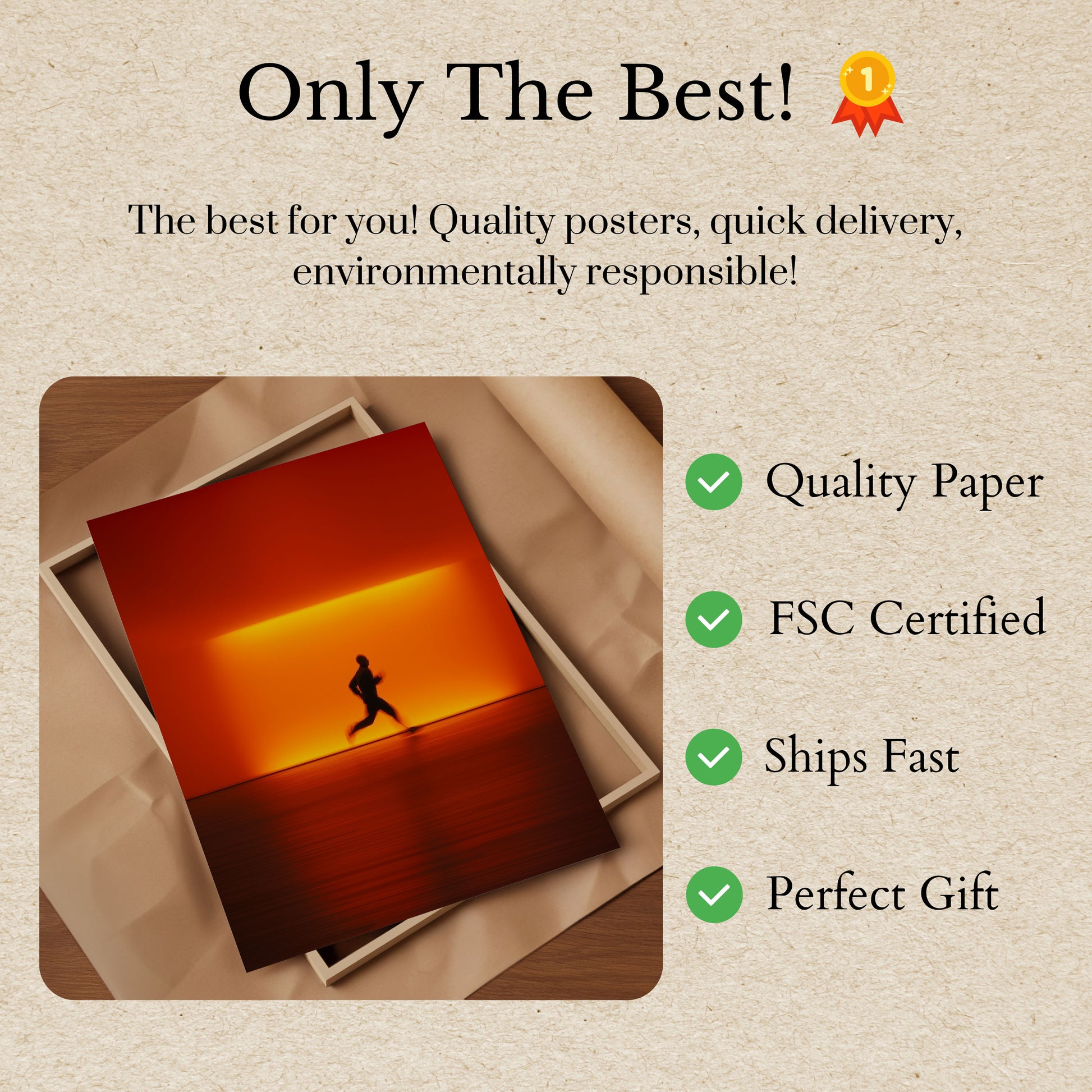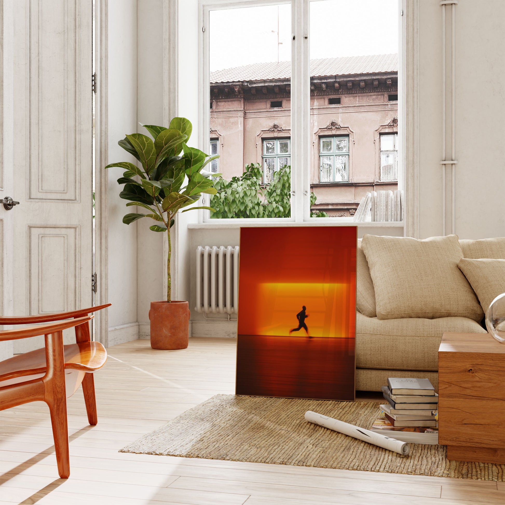 Experience the pure energy of movement captured in a stunning orange-gradient landscape. This electrifying image showcases a silhouetted runner in mid-stride against a blazing sunset backdrop, creating a powerful visual metaphor of determination and momentum. The warm, intense color palette and blurred motion transform an ordinary running scene into an extraordinary artistic statement of human potential and dynamism.
