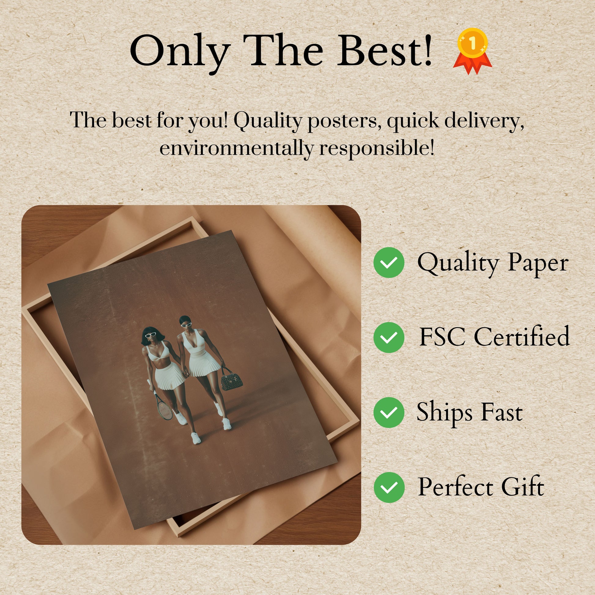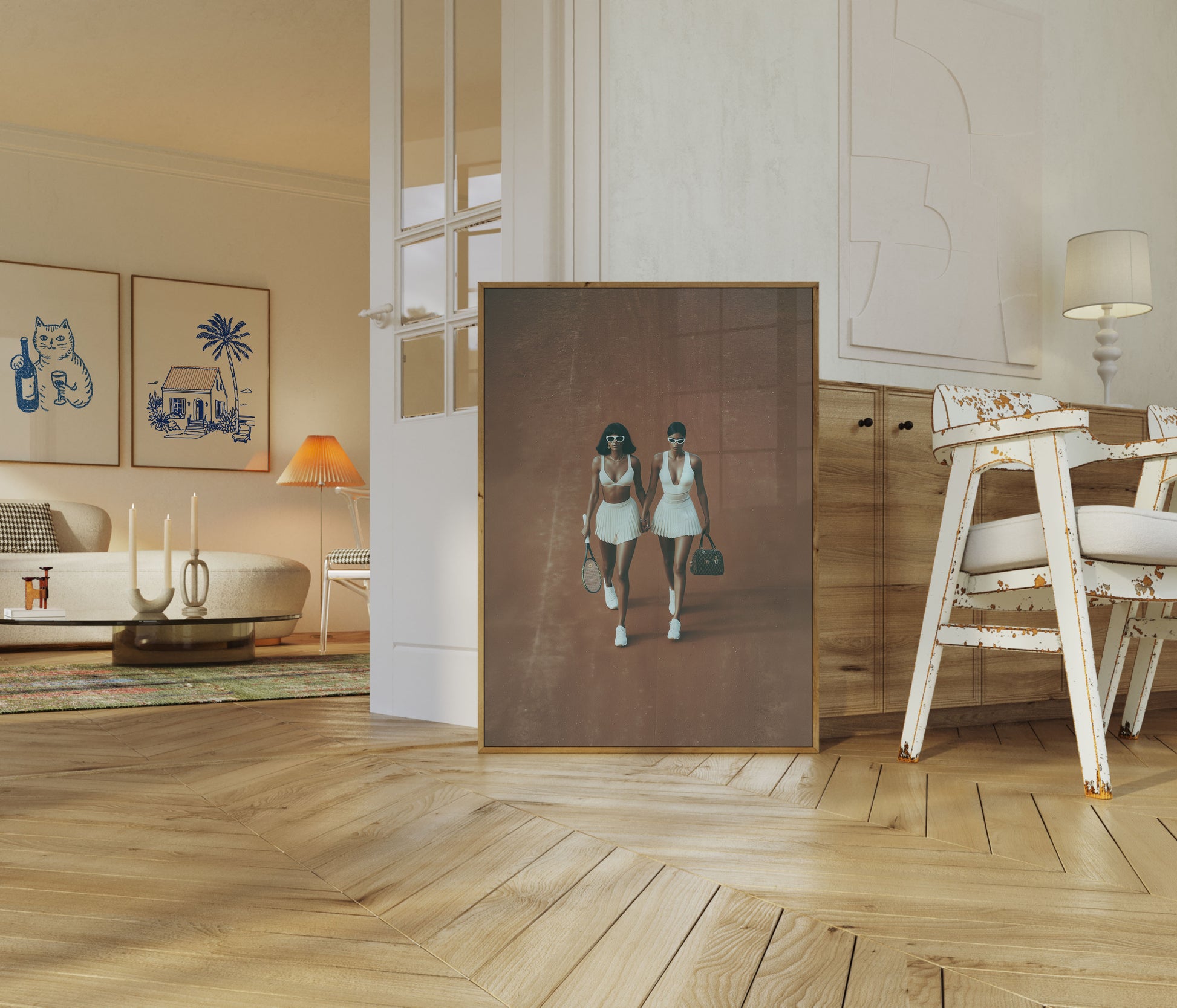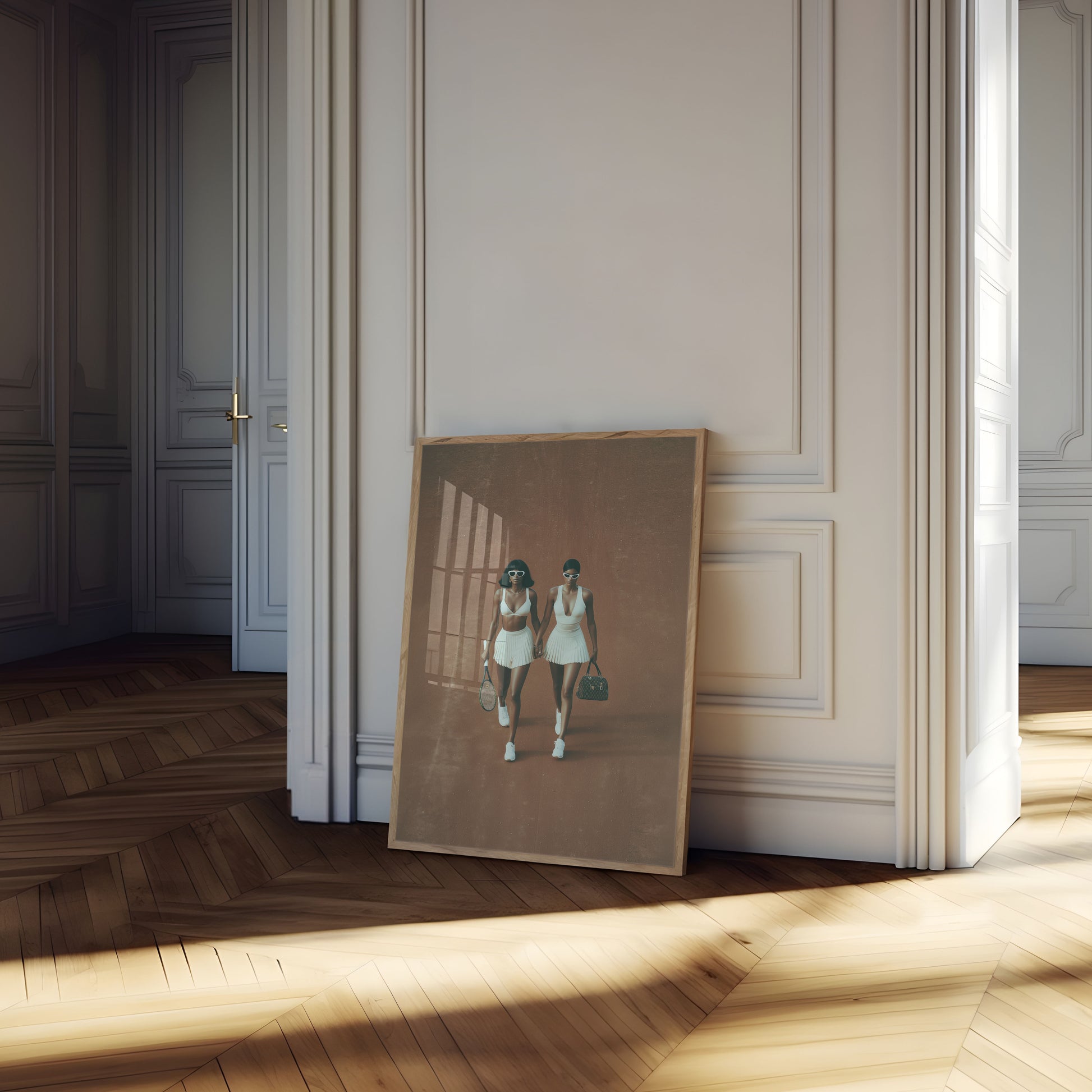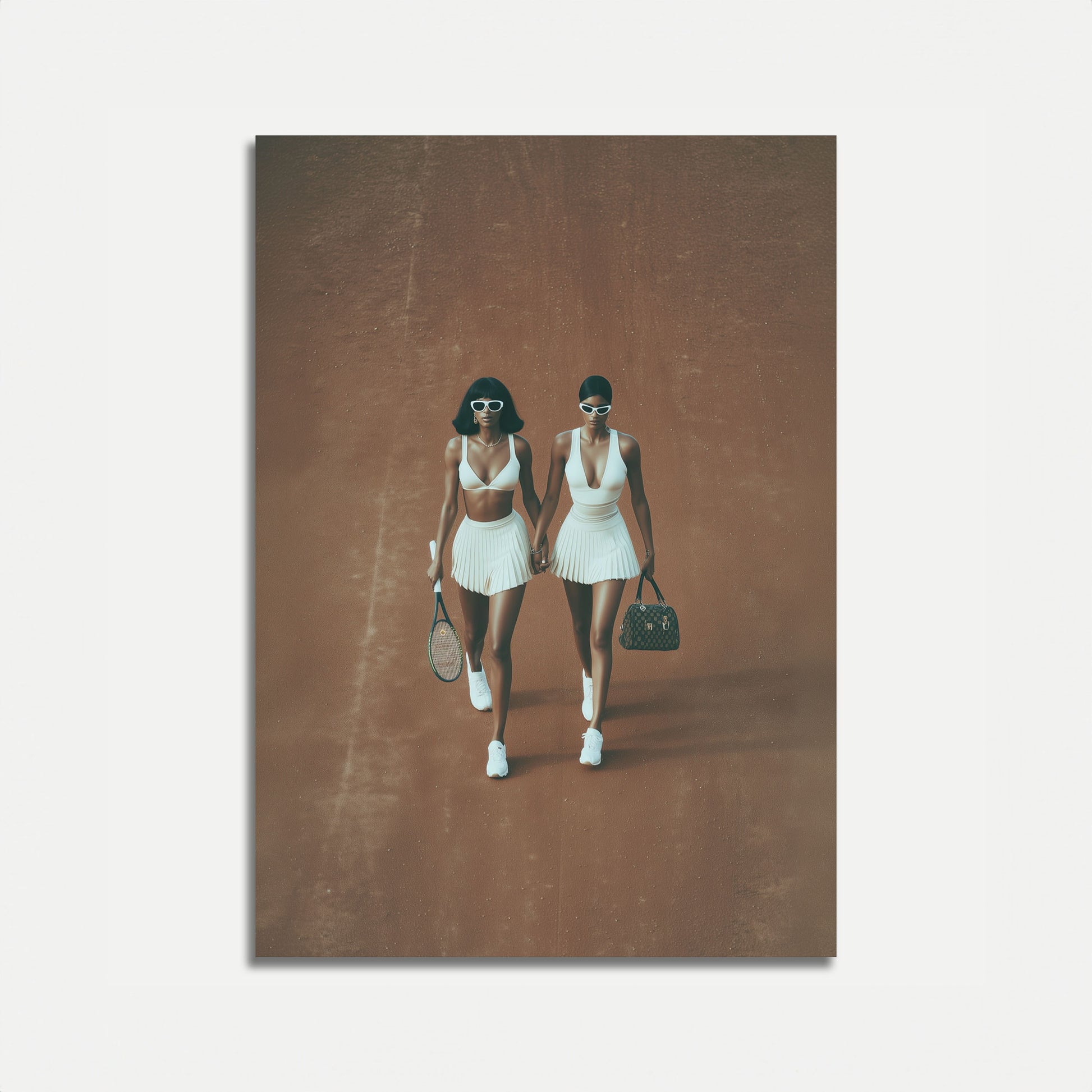 Step into a world of sophisticated athleticism with this striking image of two women in pristine white tennis attire, walking in perfect symmetry across a warm, textured background. Dressed in matching pleated skirts, crop tops, and white sneakers, they exude confidence and style, one carrying a tennis racket and the other a designer handbag. The monochromatic palette and their synchronized pose create a mesmerizing visual narrative of strength, fashion, and sisterhood.