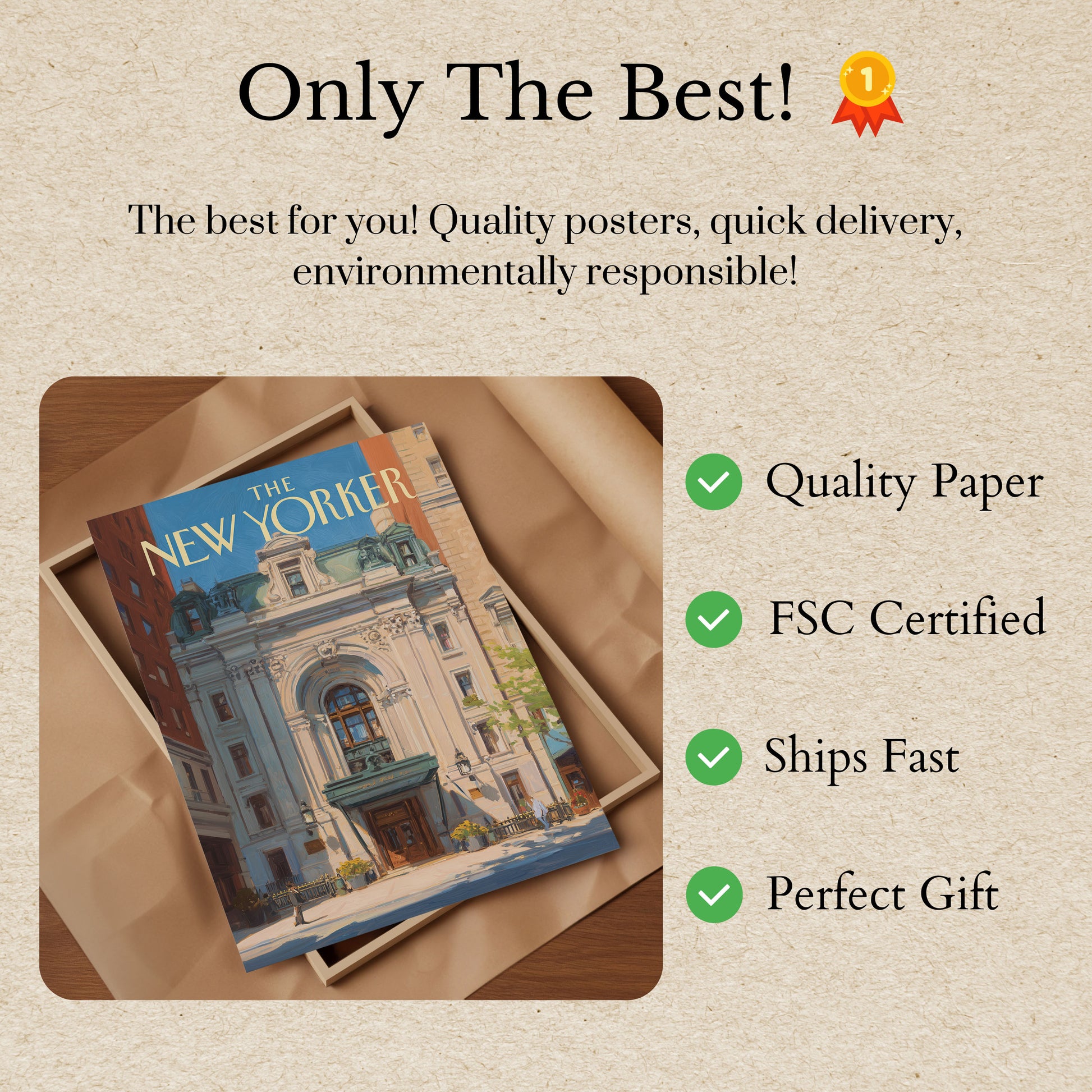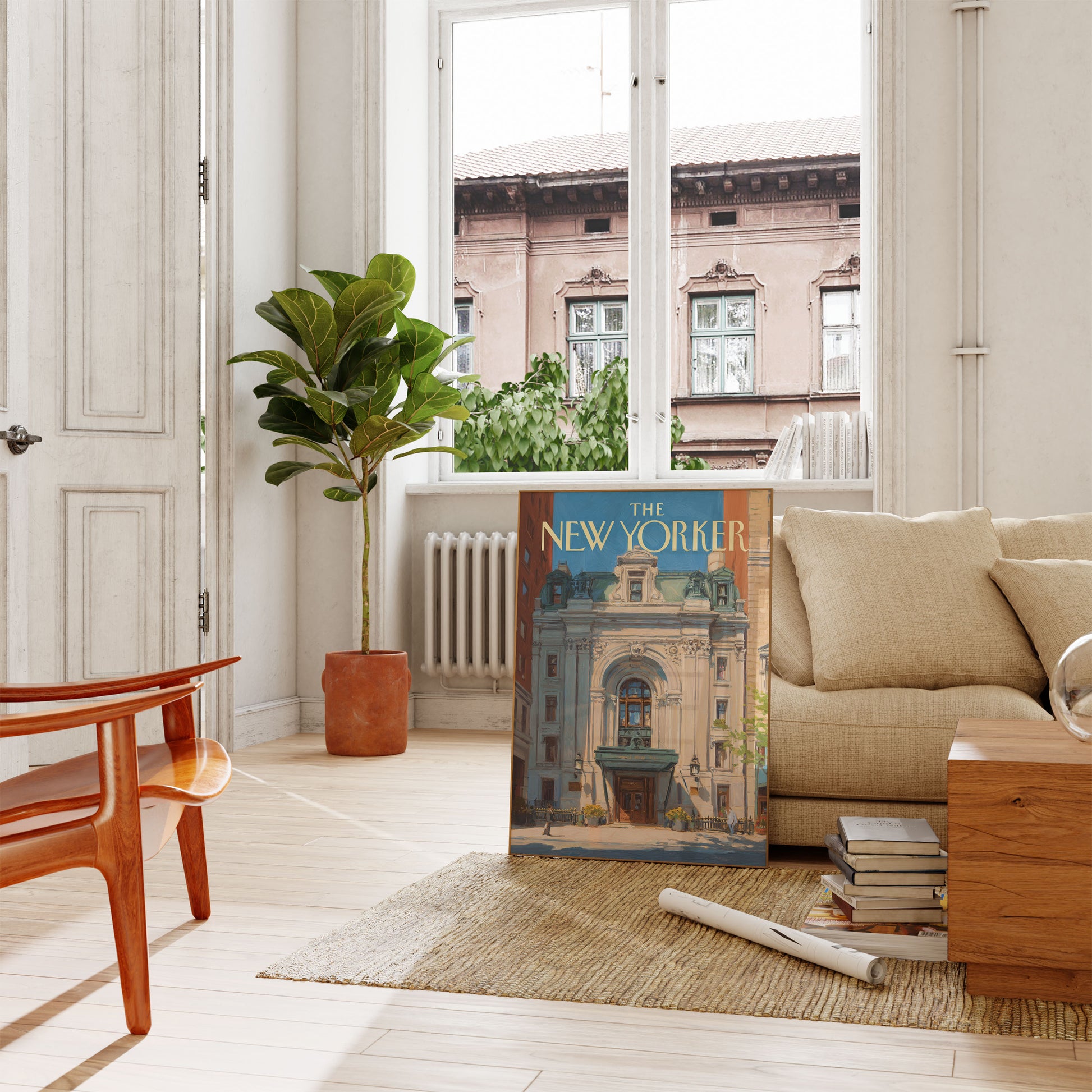 Immerse yourself in the timeless beauty of New York City's architectural splendor with this stunning illustrated poster of The New Yorker magazine's iconic building. Bathed in soft, luminous sunlight, the grand white facade showcases intricate Beaux-Arts details, capturing the elegant urban landscape with remarkable depth and warmth. The painting beautifully renders the classic building's ornate windows, sculptural elements, and serene street scene, inviting viewers to pause and appreciate the architectural heritage of the city.