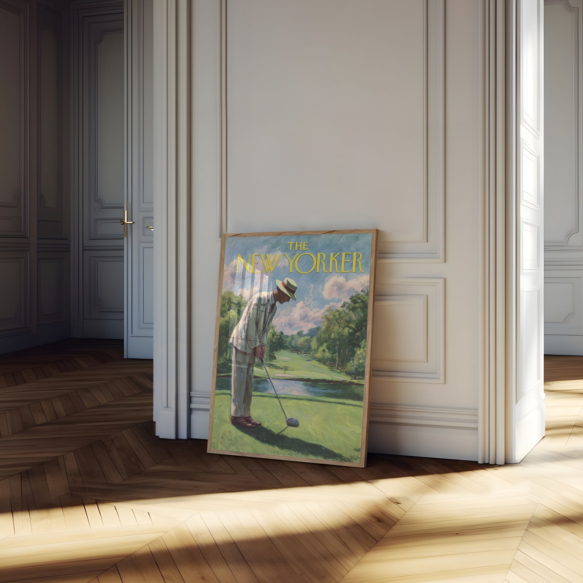 Step into a serene golfing moment captured in this stunning vintage-inspired illustration from The New Yorker magazine. The poster features an elegantly dressed golfer preparing to swing on a lush green course, with soft pastel clouds and verdant trees creating a tranquil backdrop that evokes the golden age of golf. Rich in nostalgic charm, this artistic rendition celebrates the timeless grace of the sport against a dreamy landscape.