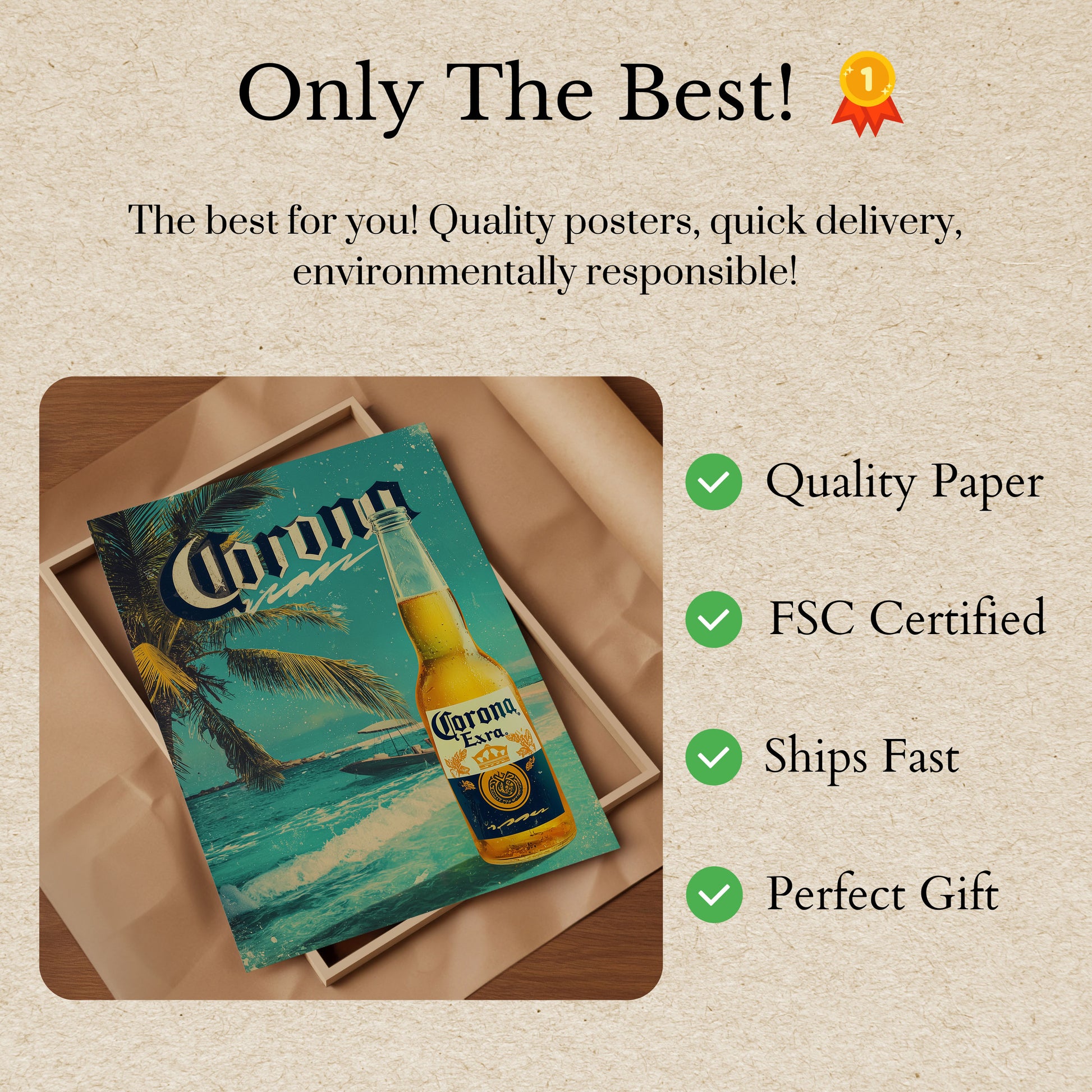 Dive into the ultimate summer escape with this vibrant vintage Corona Extra poster. Capturing the essence of tropical paradise, the image transports you to a serene turquoise beach scene with palm trees swaying and a crisp, cold beer promising refreshment. The stunning teal background and golden beer bottle create a nostalgic marketing artwork that epitomizes beach relaxation and leisure.