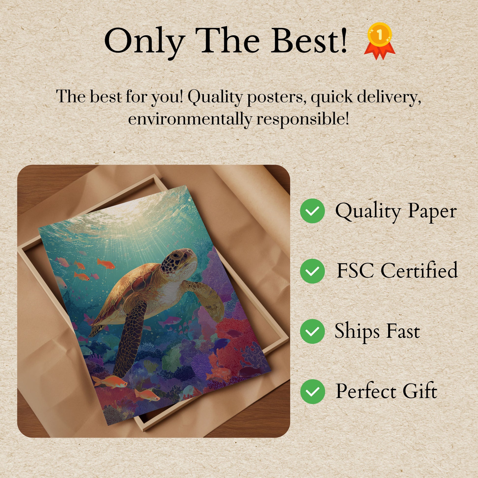 Dive into a mesmerizing underwater world where a majestic sea turtle glides through a vibrant coral landscape. Soft turquoise light streams from above, illuminating the golden-shelled turtle surrounded by a kaleidoscope of colorful fish and coral in rich purples, reds, and blues. This stunning art piece captures the serene beauty and delicate ecosystem of marine life, inviting viewers to explore the magical depths of the ocean.