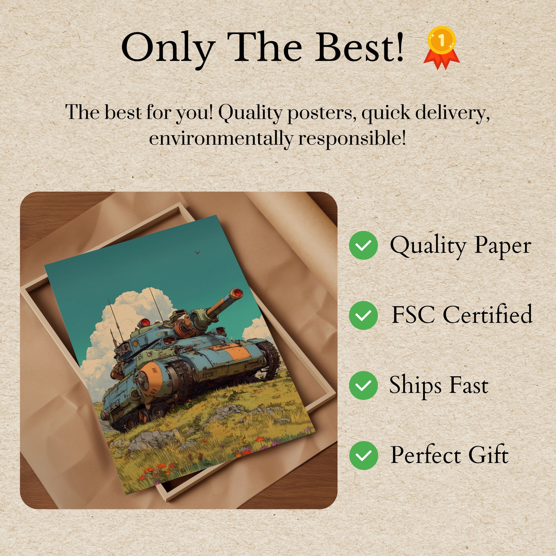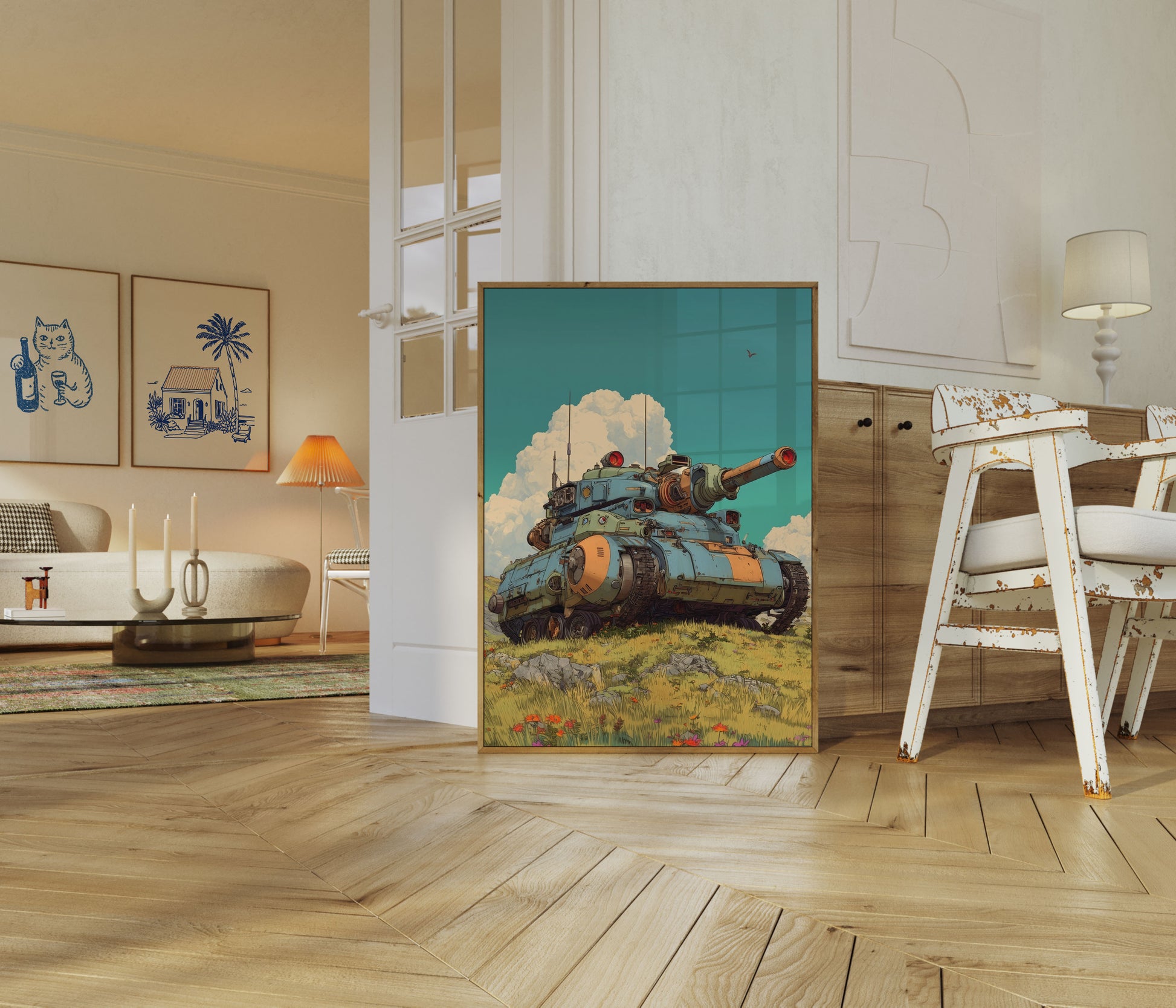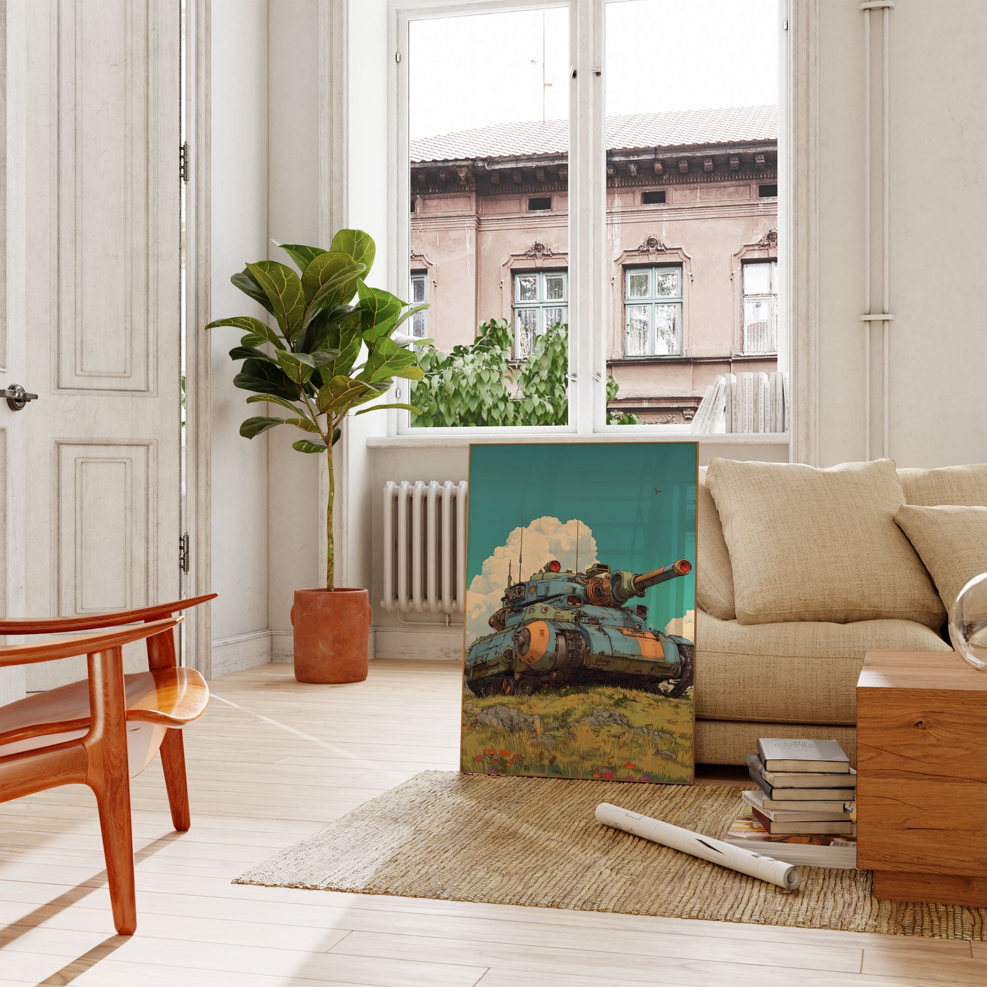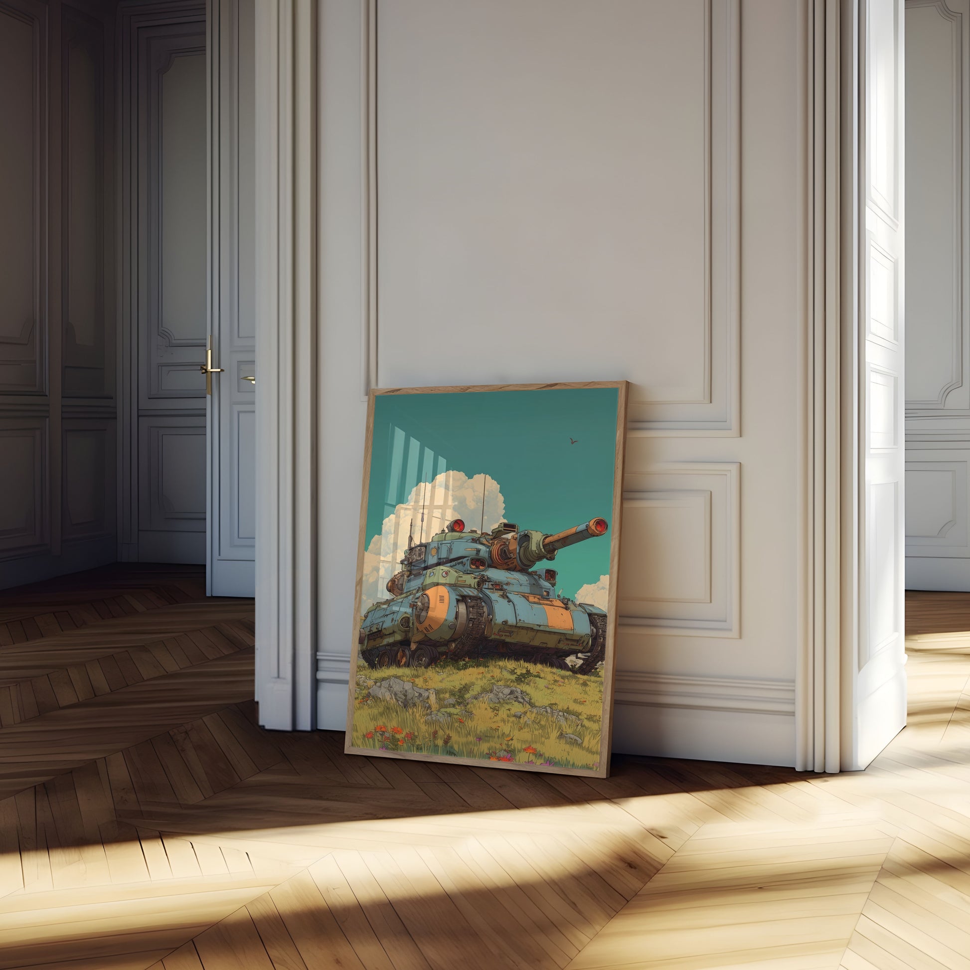 Transport yourself into a mesmerizing world where mechanical might meets serene landscape in this stunning illustration of a futuristic battle tank. Set against a dreamy teal sky with billowing cumulus clouds, this meticulously detailed tank sits amidst a golden grassland scattered with vibrant wildflowers, creating a striking contrast between industrial power and natural beauty. The artwork masterfully blends soft, nostalgic color tones with intricate mechanical details, evoking a sense of wonder and alternative technological storytelling.