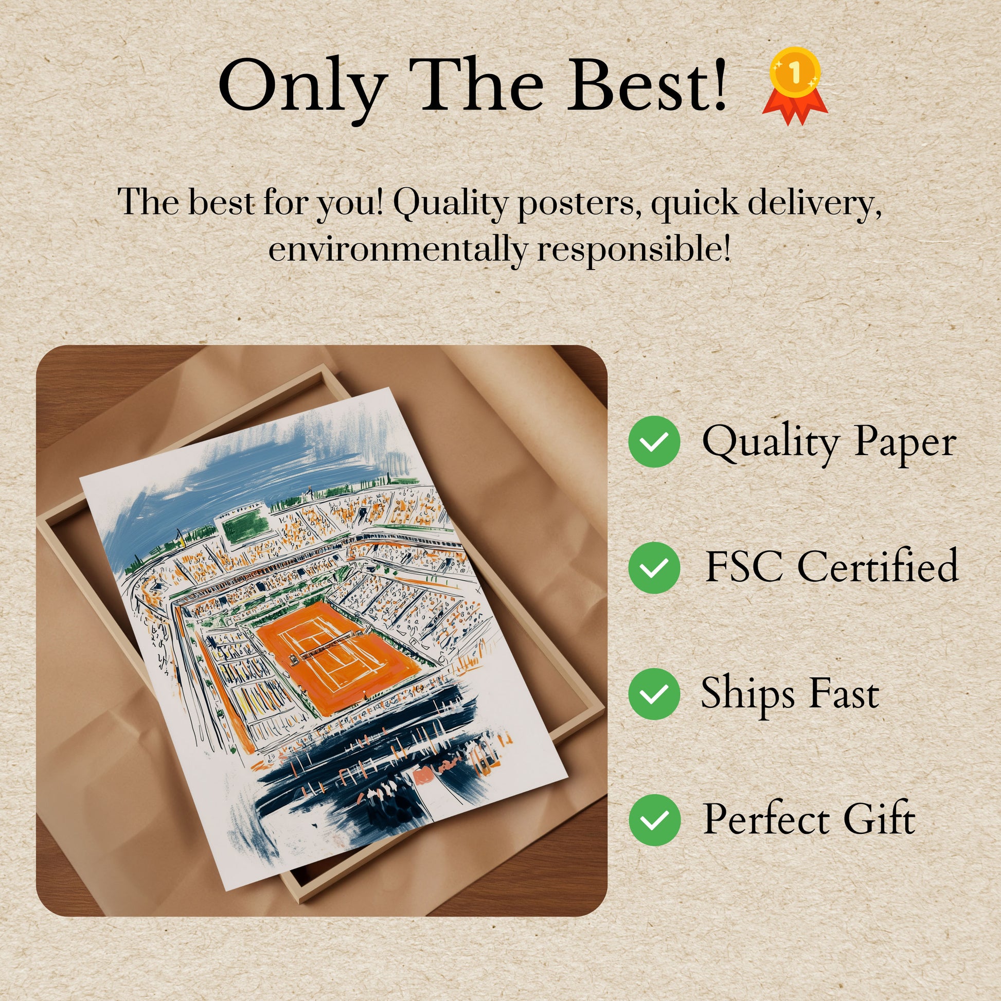Dive into the electrifying atmosphere of a grand tennis stadium with this vibrant artistic rendering. The orange clay court takes center stage, surrounded by densely packed stadium seating that captures the energy and excitement of a major tennis tournament. Loose, expressive brushstrokes in blues, oranges, and greens bring the scene to life with dynamic movement and passion.