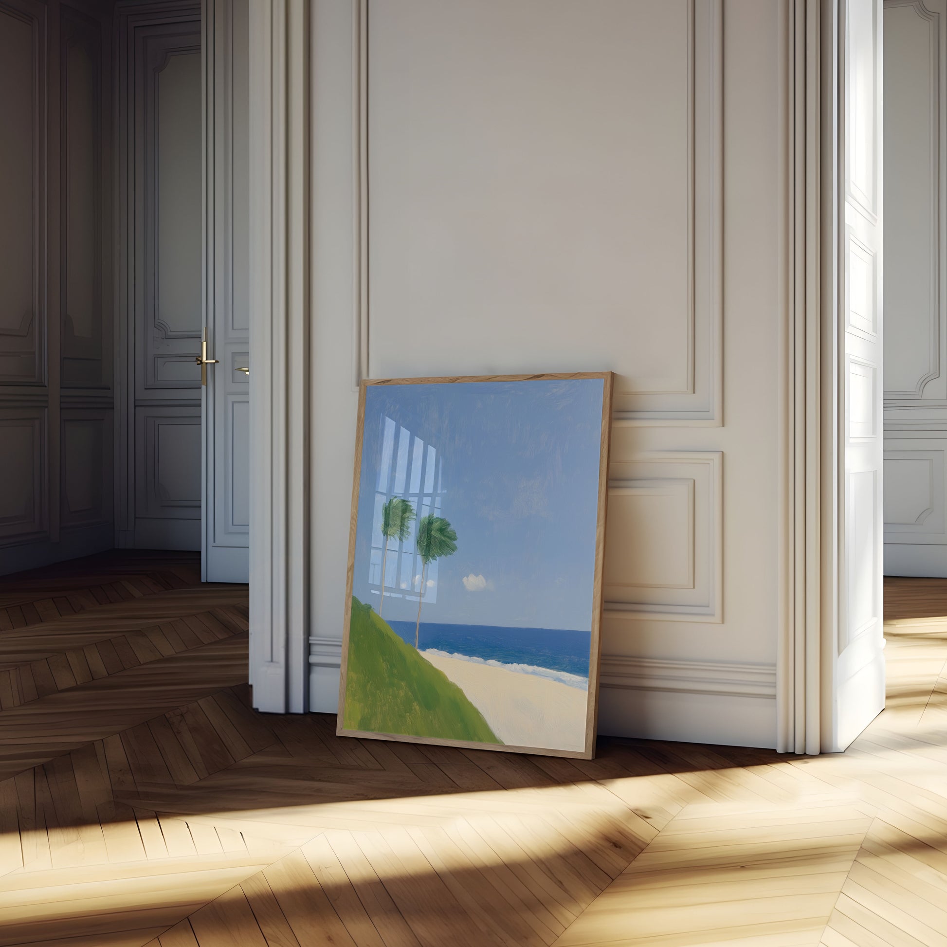 Escape into a serene coastal landscape where two slender palm trees dance against a brilliant blue sky. The painting captures a moment of tranquil beauty, with a lush green cliff overlooking a pristine sandy beach and the deep blue ocean. Soft white clouds drift lazily, creating a sense of peaceful isolation and natural harmony.