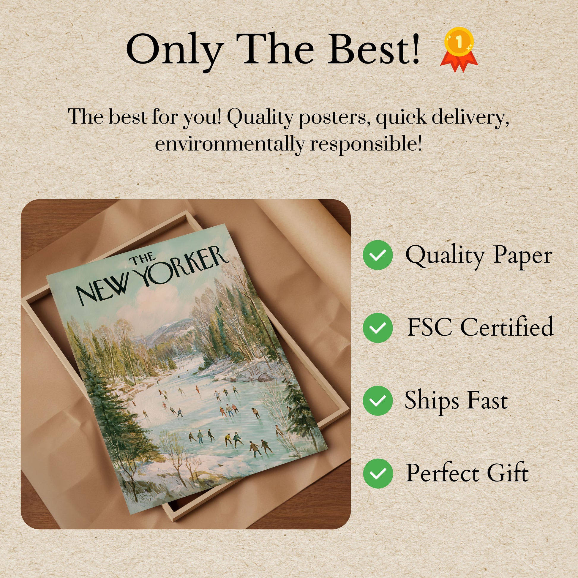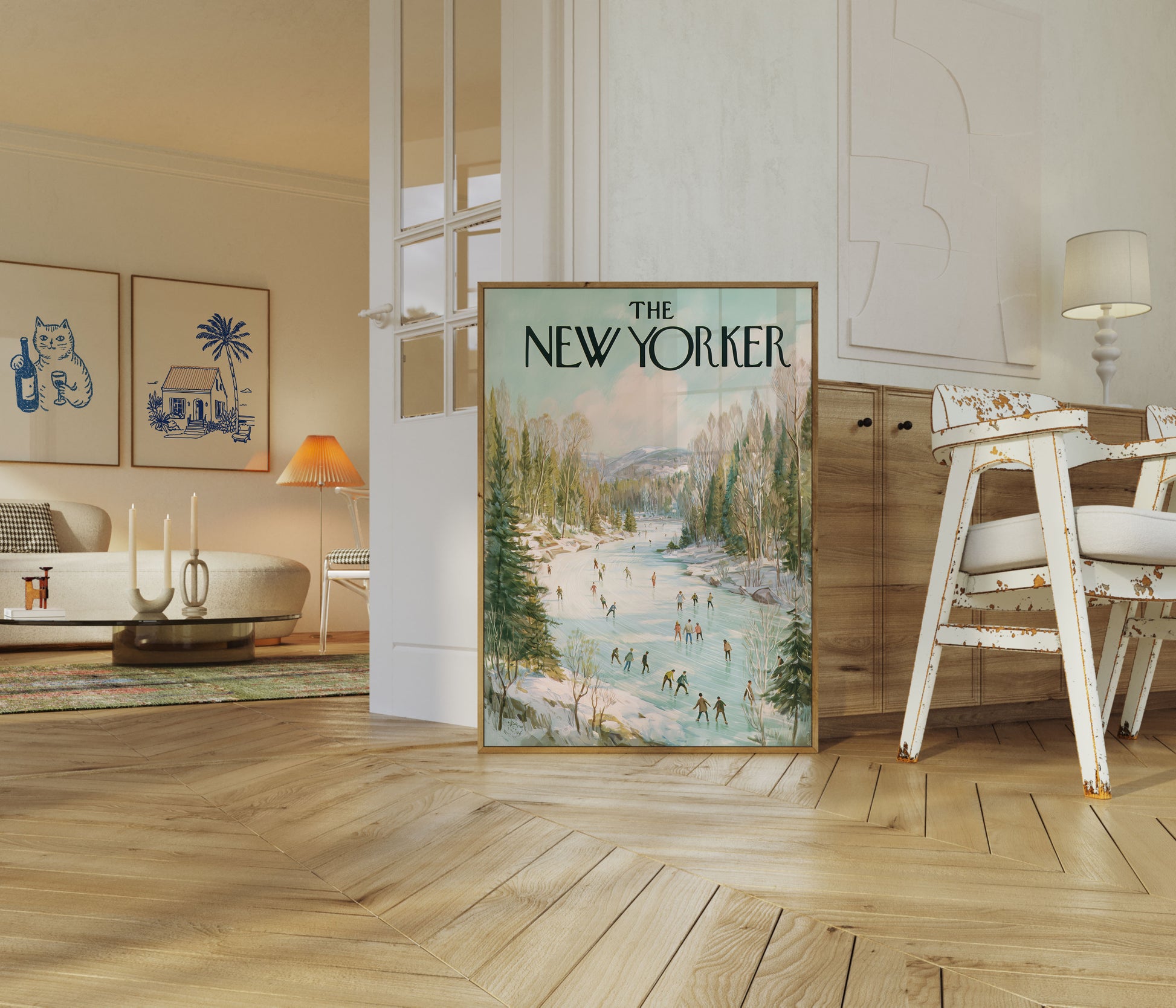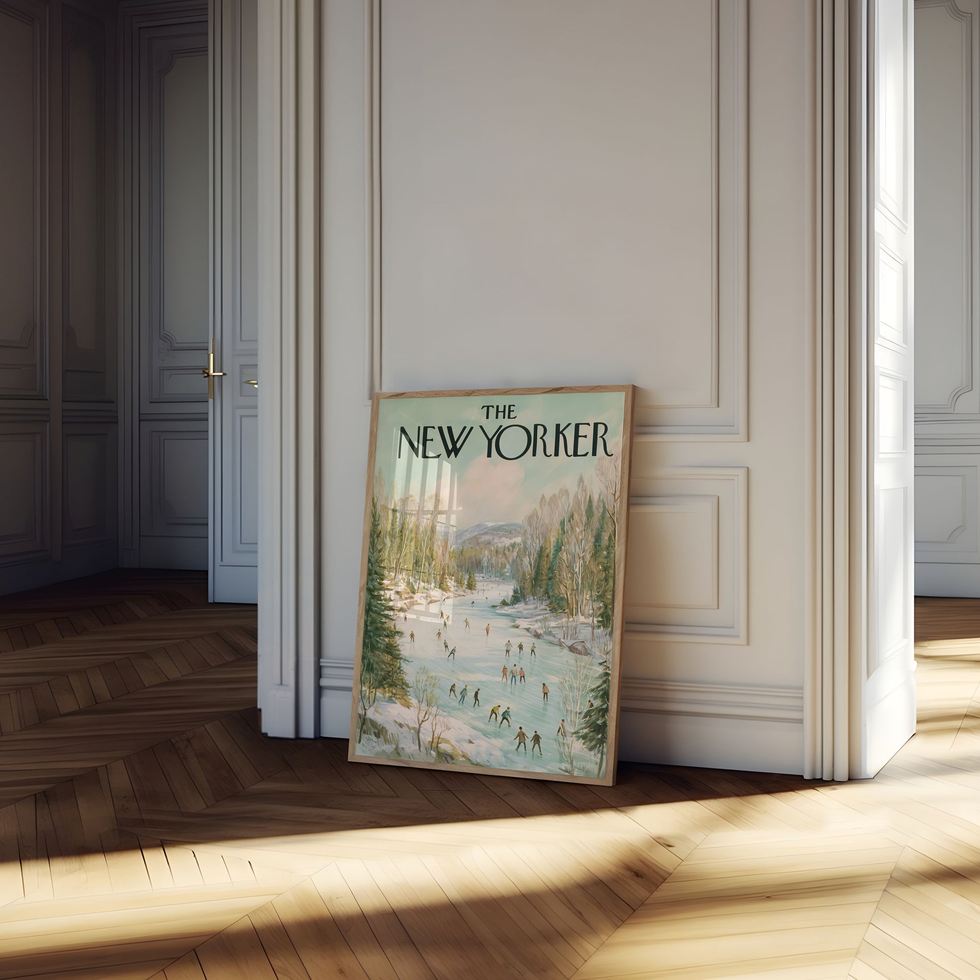 Immerse yourself in this enchanting vintage New Yorker cover depicting a serene winter landscape filled with skaters gliding across a frozen river. Surrounded by evergreen and birch trees, with misty mountains in the background, this artistic poster captures the tranquil joy of winter recreation. Soft pastel colors and delicate brushstrokes create a nostalgic scene that transports viewers to a peaceful winter wonderland.
