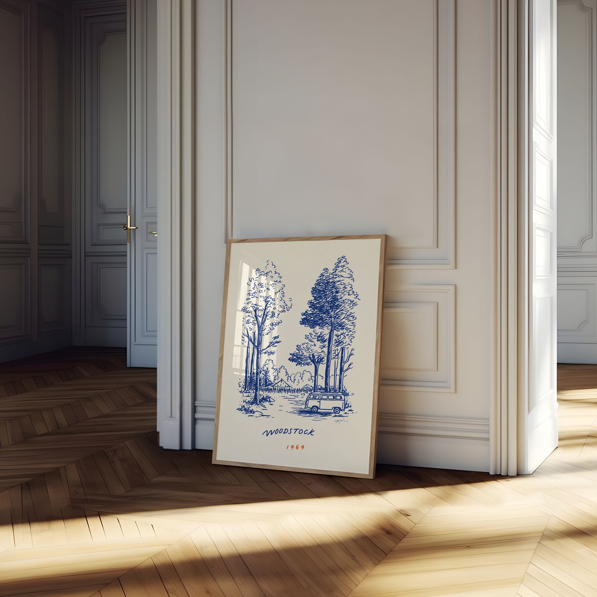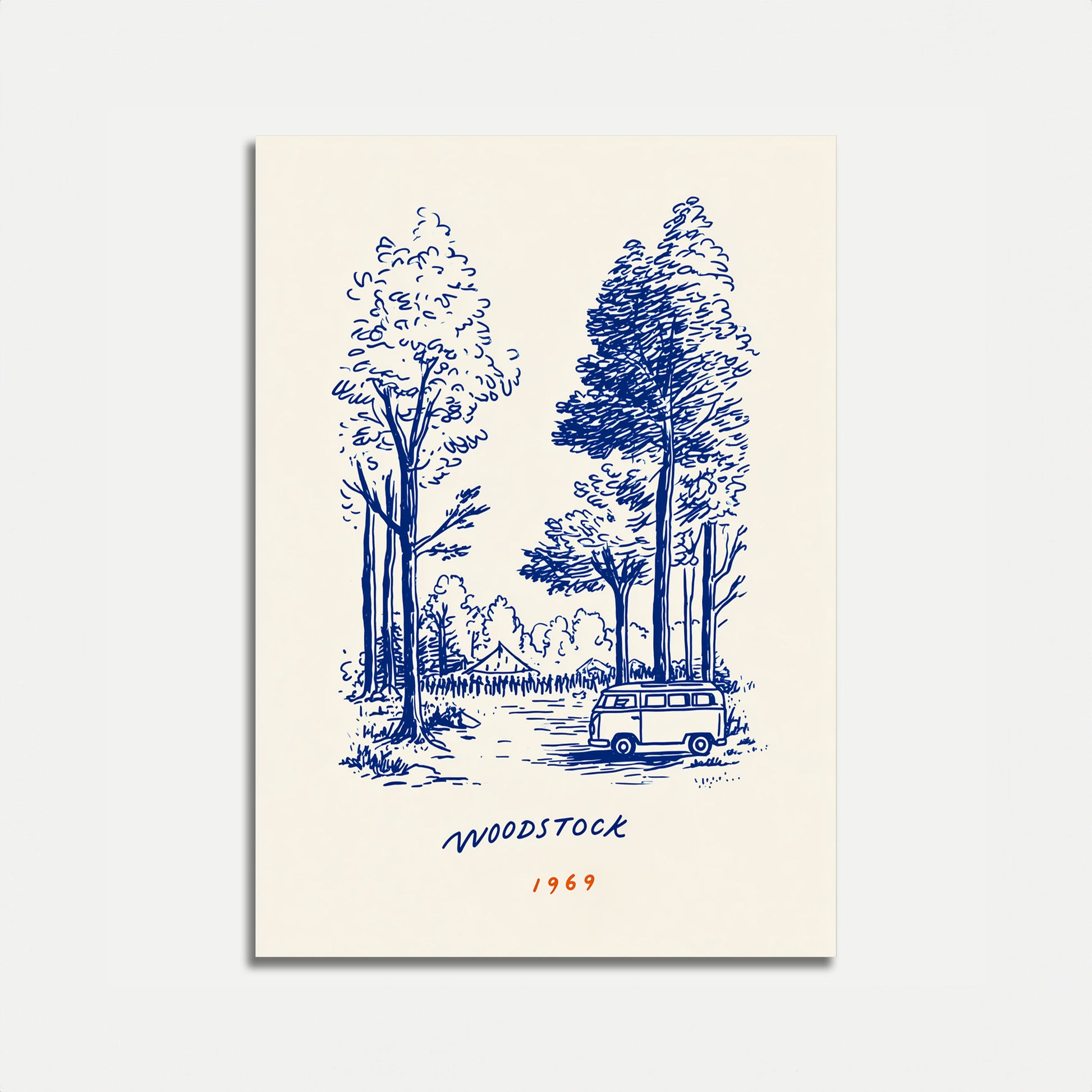 Capture the iconic spirit of the legendary Woodstock music festival with this stunning blue-toned vintage art print. The illustration beautifully captures a classic VW van nestled among towering trees, evoking the peaceful, nature-connected essence of the most famous music gathering in history. Reminiscent of a nostalgic sketch, this poster transports you back to the summer of love and musical revolution.