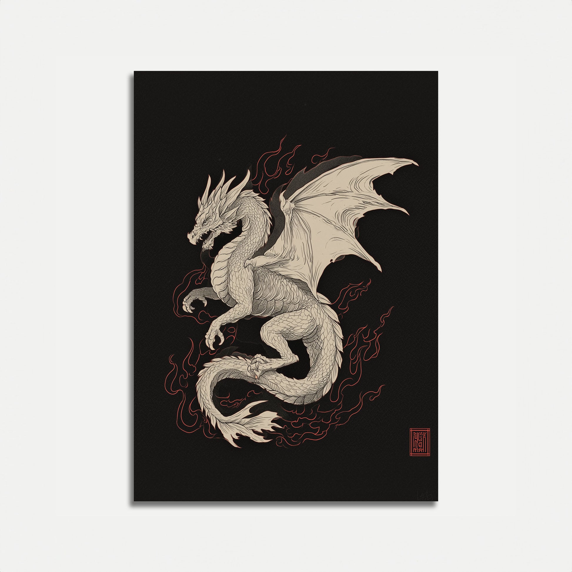 Immerse yourself in the intense, mystical world of this stunning dragon illustration, where intricate scales, powerful wings, and swirling crimson flames create an electrifying visual narrative. The monochromatic design captures the dragon's fierce energy against a dramatic black background, with delicate red flame accents highlighting its mythical essence and otherworldly power.