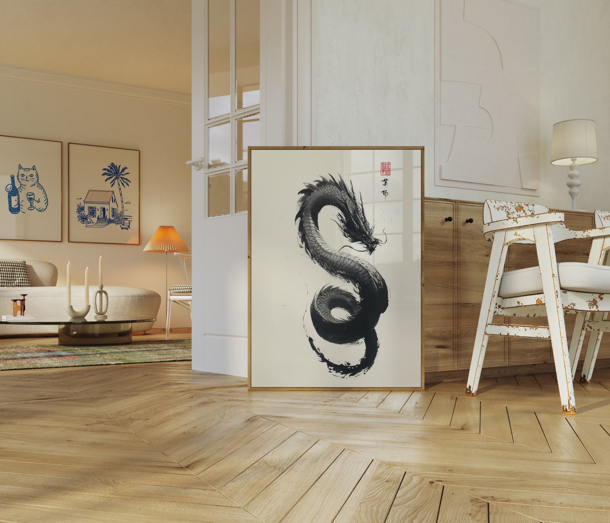 Discover the mesmerizing power of this traditional Chinese ink dragon artwork, where fluid brushstrokes capture the mythical creature's sinuous form and fierce spirit. The monochromatic design flows with dynamic energy, revealing intricate scale details and a sense of mystical movement that seems to breathe life into the paper.