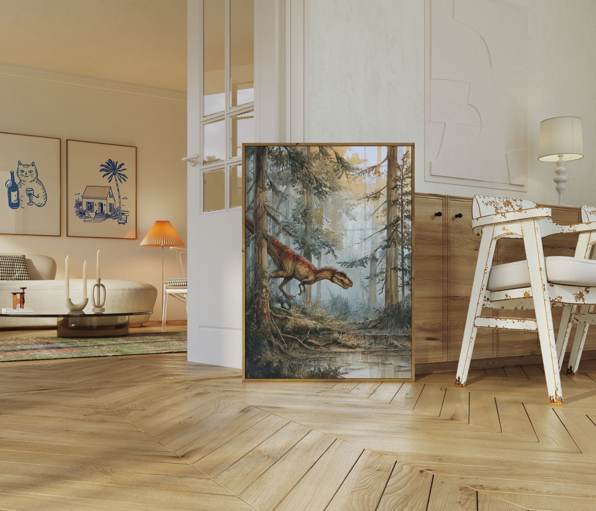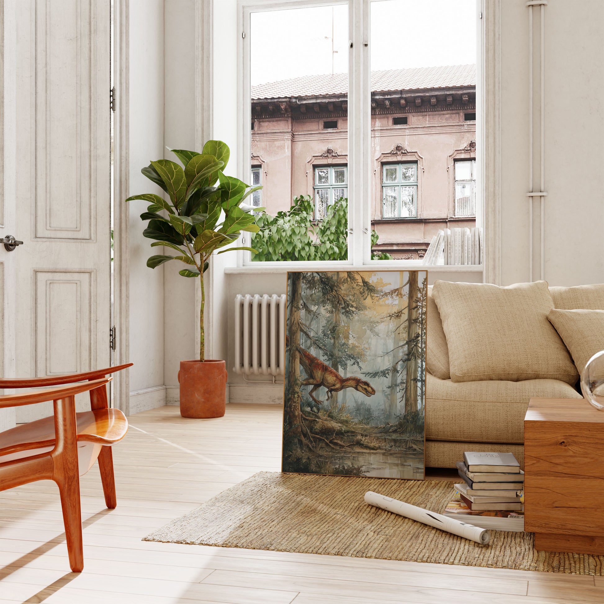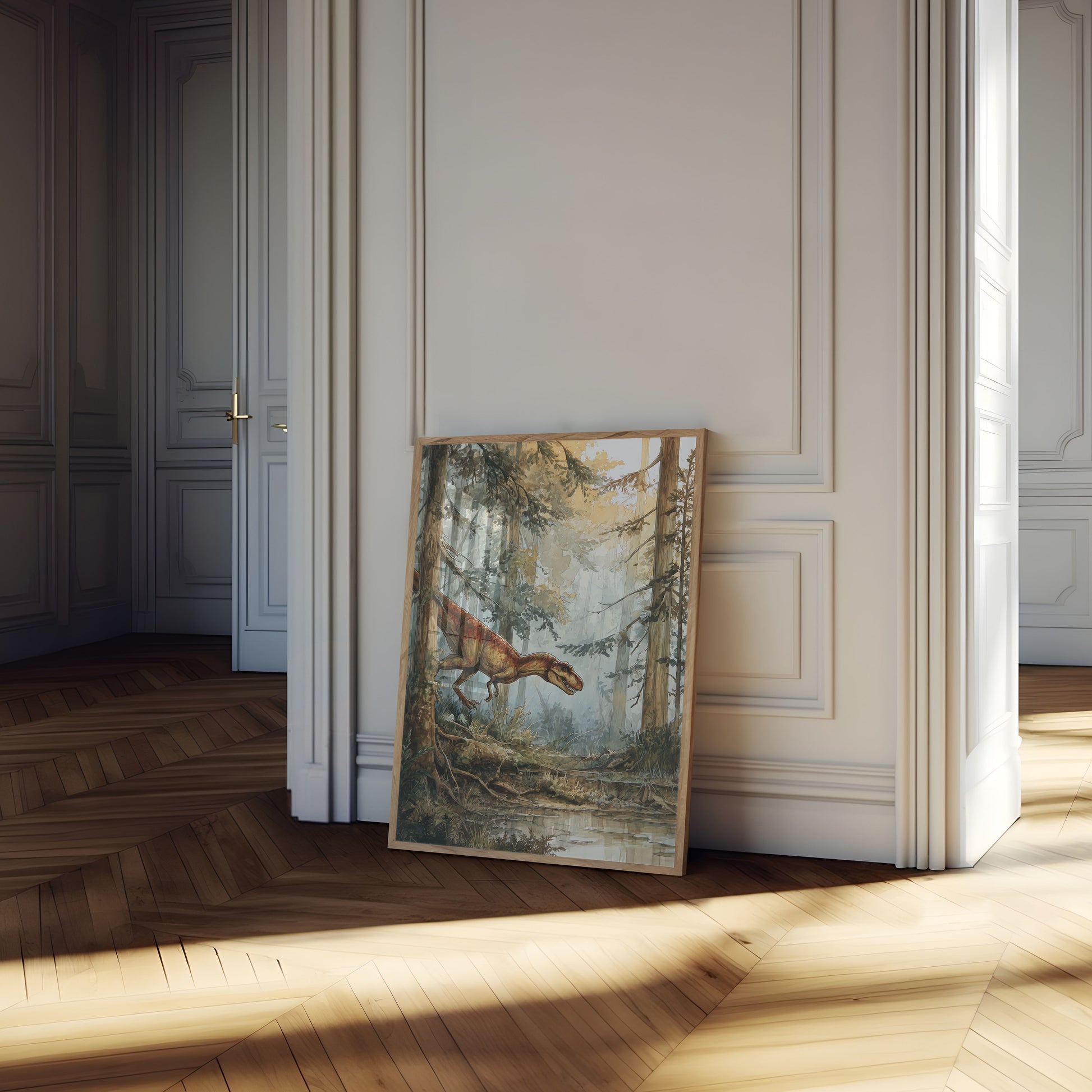 Step into a mesmerizing prehistoric world where a vibrant orange-red dinosaur prowls through a misty, ethereal forest. This stunning watercolor illustration captures the raw power and primal beauty of a carnivorous dinosaur navigating a lush, primordial landscape, with soft golden light filtering through ancient trees and a tranquil stream reflecting the scene's mysterious atmosphere. The detailed artwork brings the prehistoric era to life with breathtaking realism and emotional depth.