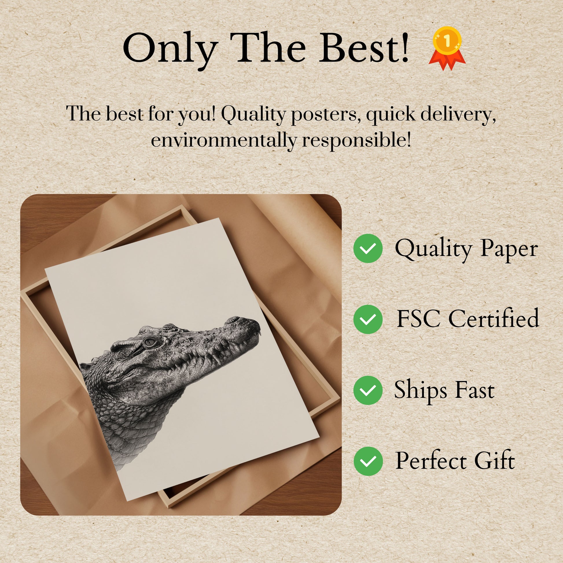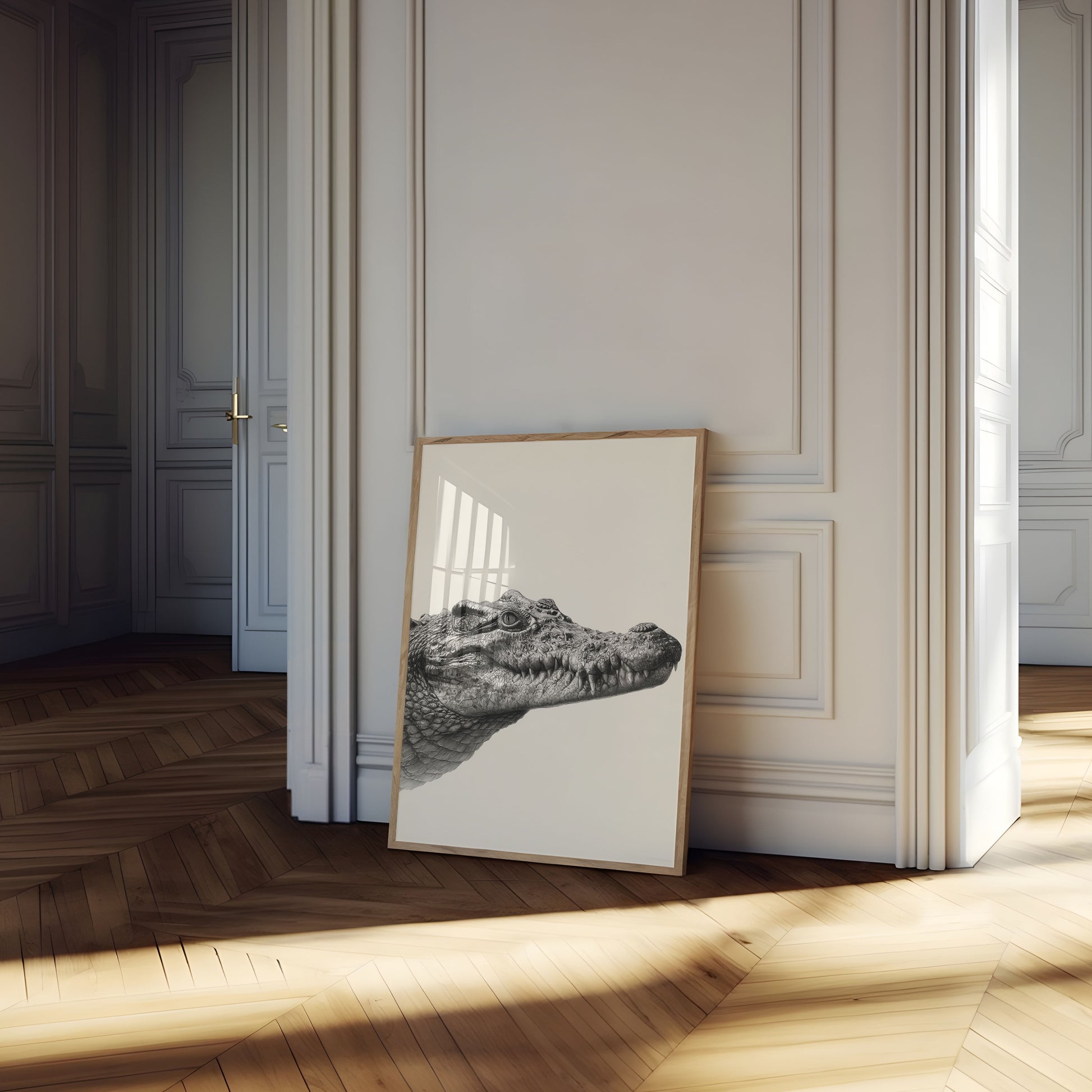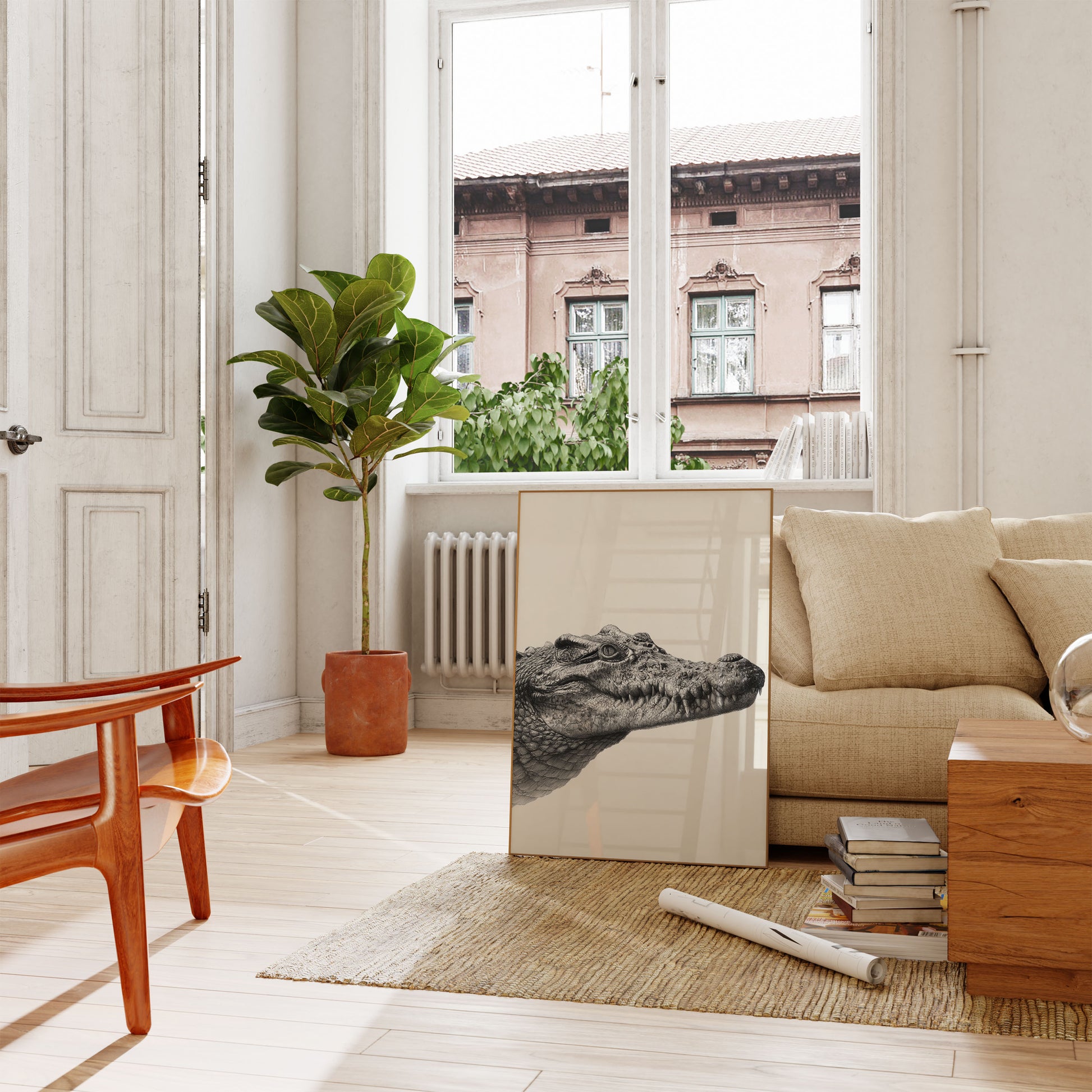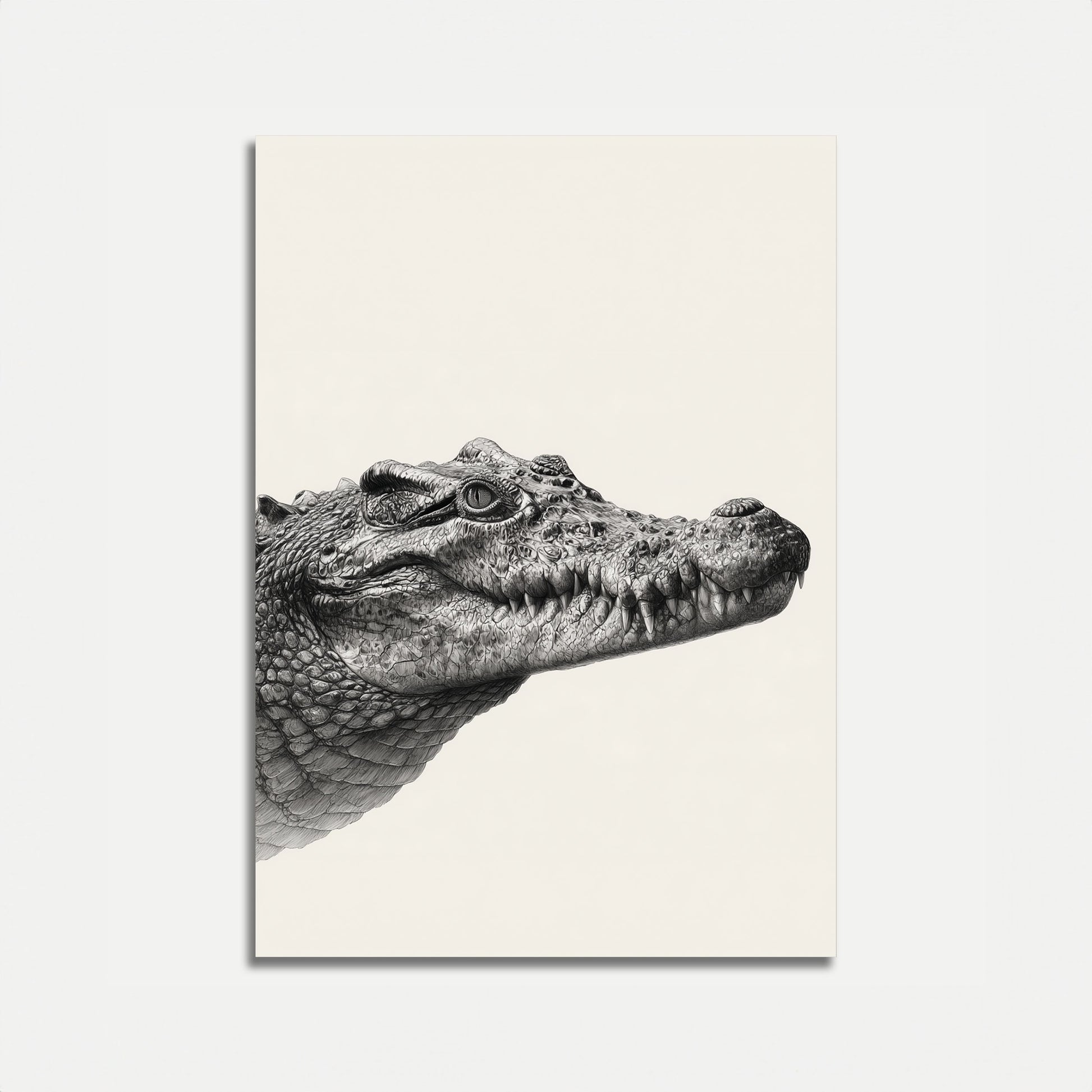 Immerse yourself in the intense detail of this hyper-realistic crocodile portrait, capturing the prehistoric essence of nature's most enduring hunter. The intricate black and white rendering reveals every textured scale and piercing eye with breathtaking precision, showcasing the raw power and primordial beauty of this remarkable reptile. Each line and contour tells a story of survival, drawing viewers into the mesmerizing world of this ancient creature.