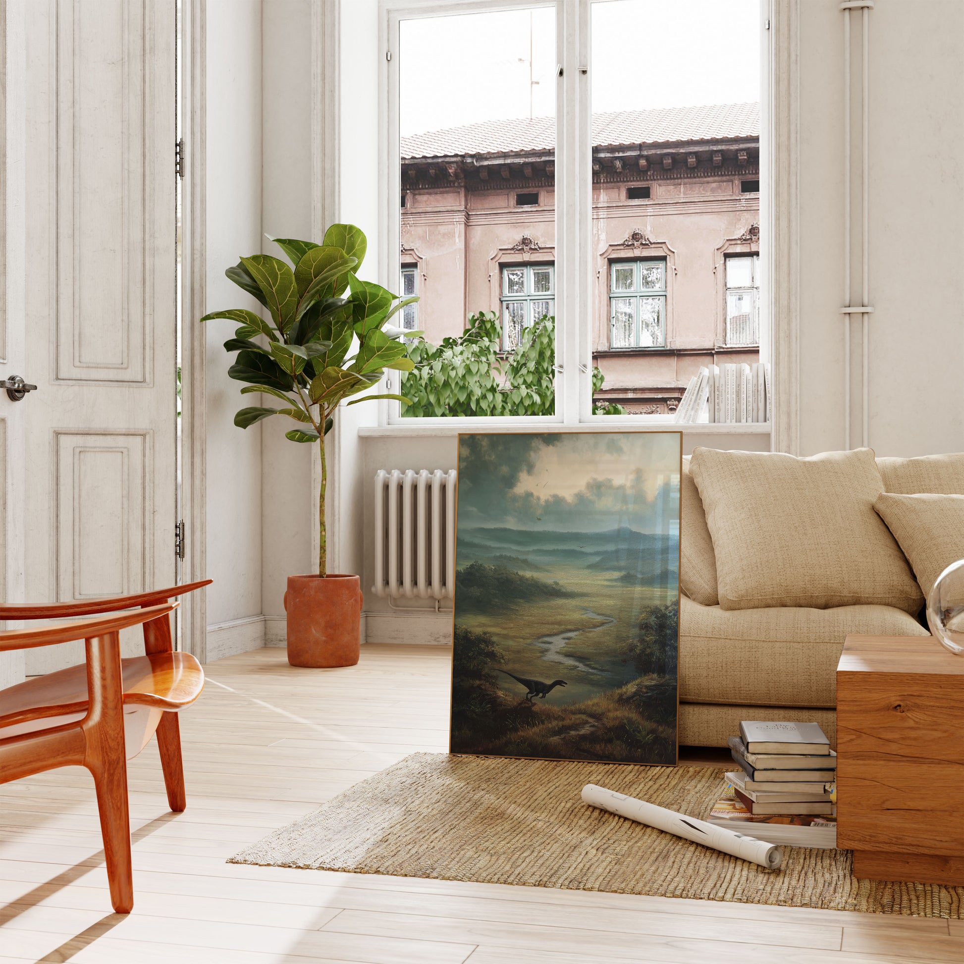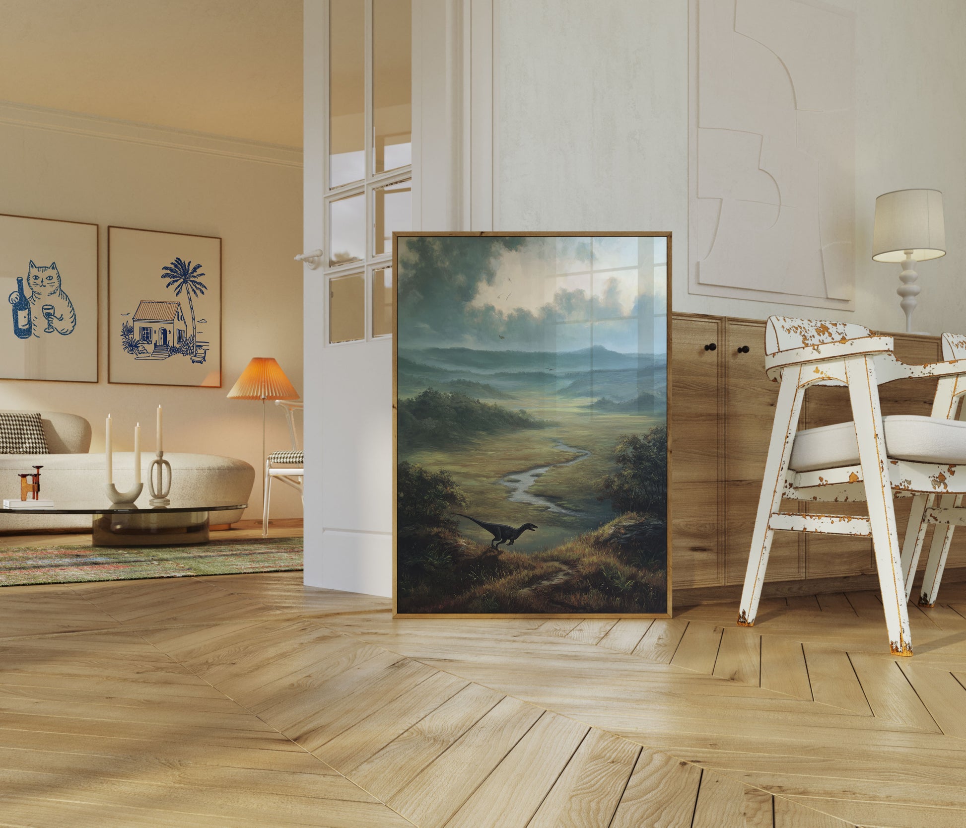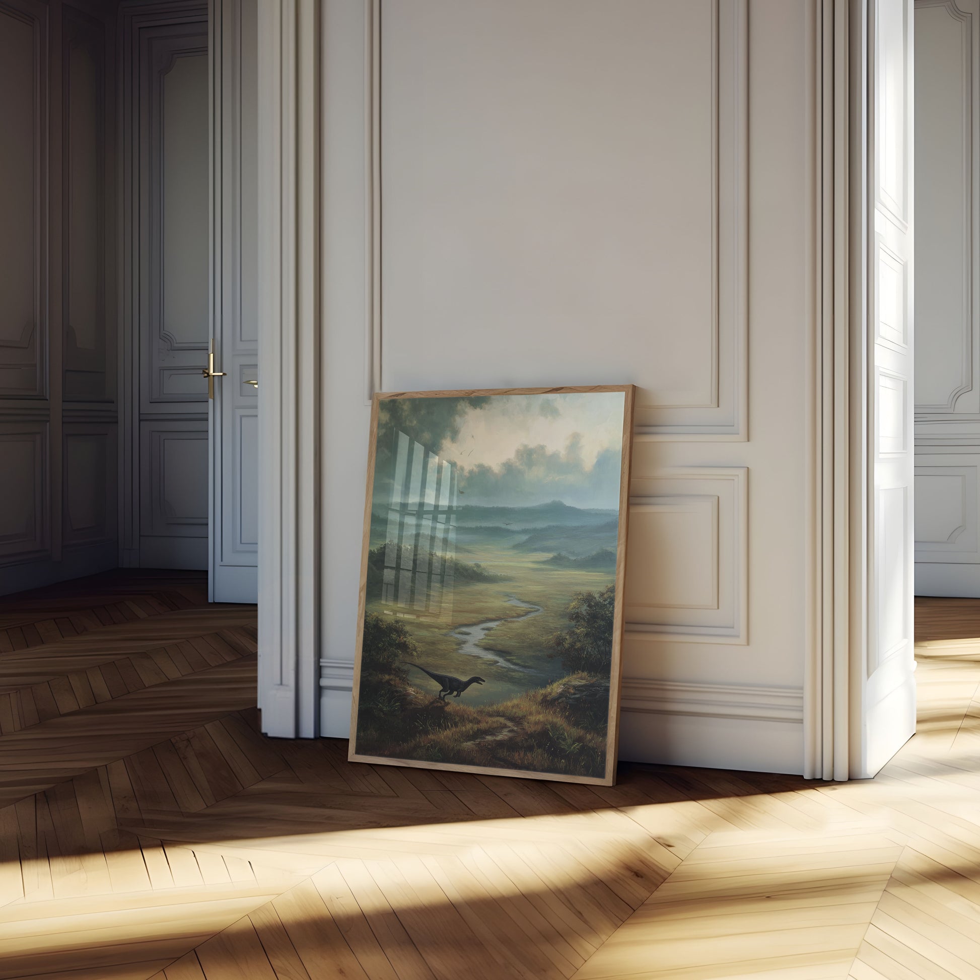 Journey back to the prehistoric era with this breathtaking landscape featuring a solitary dinosaur overlooking a misty river valley. Soft blue-green hues and dramatic cloudy skies create an ethereal atmosphere that transports viewers to a primordial world of natural wonder. The winding river cuts through rolling grasslands, while a lone dinosaur silhouette stands sentinel against the sweeping, layered terrain.