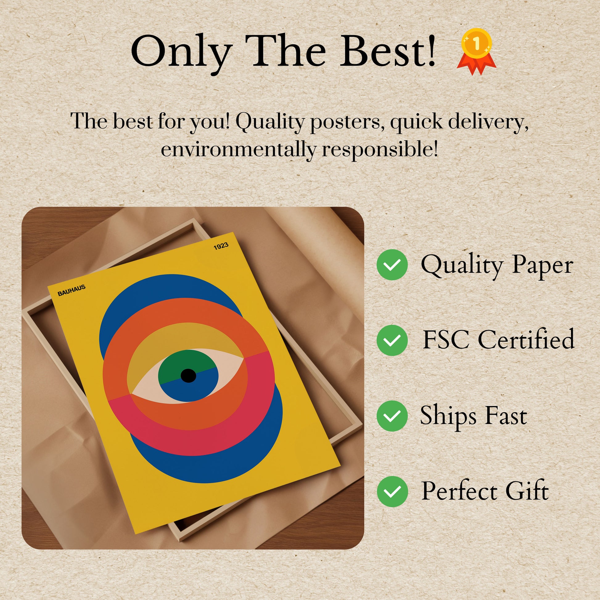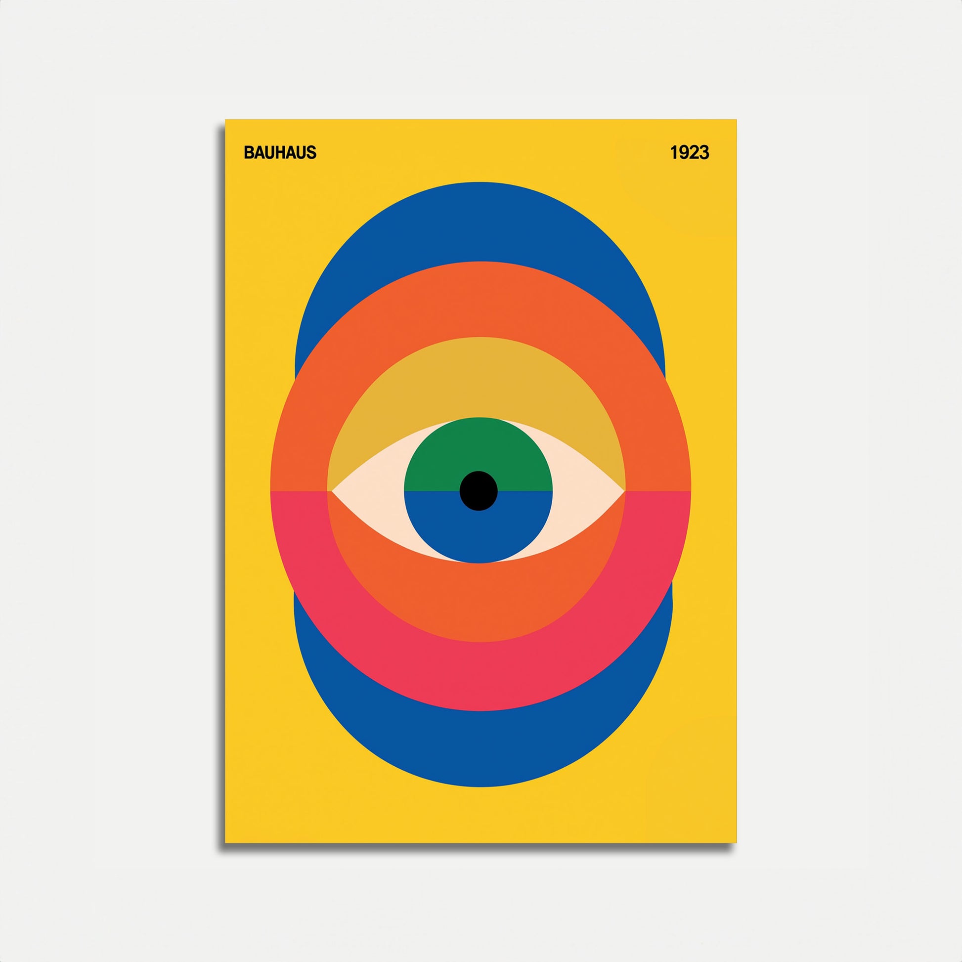 A mesmerizing vintage Bauhaus poster from 1923 that captures the essence of modernist design with its concentric circles and stylized eye. Vibrant colors ranging from deep blue to bright yellow create a hypnotic visual experience that draws the viewer into a world of geometric precision and artistic innovation. The abstract composition celebrates the Bauhaus movement's revolutionary approach to art and design.
