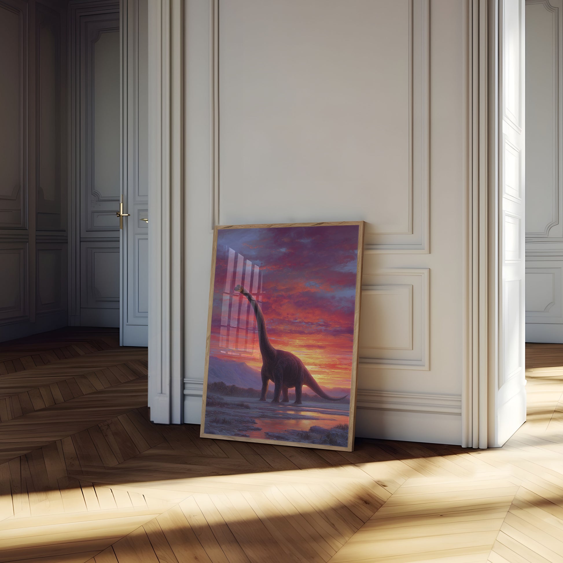 Journey into a breathtaking prehistoric landscape where a majestic brontosaurus stands silhouetted against a stunning canvas of fiery sunset colors. The dinosaur's massive form rises against an epic sky painted in vibrant oranges, deep purples, and radiant yellows, creating an awe-inspiring scene of primordial beauty and tranquility. Soft mist hovers around rocky terrain and shallow waters, reflecting the dramatic sky and lending an ethereal quality to this magnificent prehistoric moment.