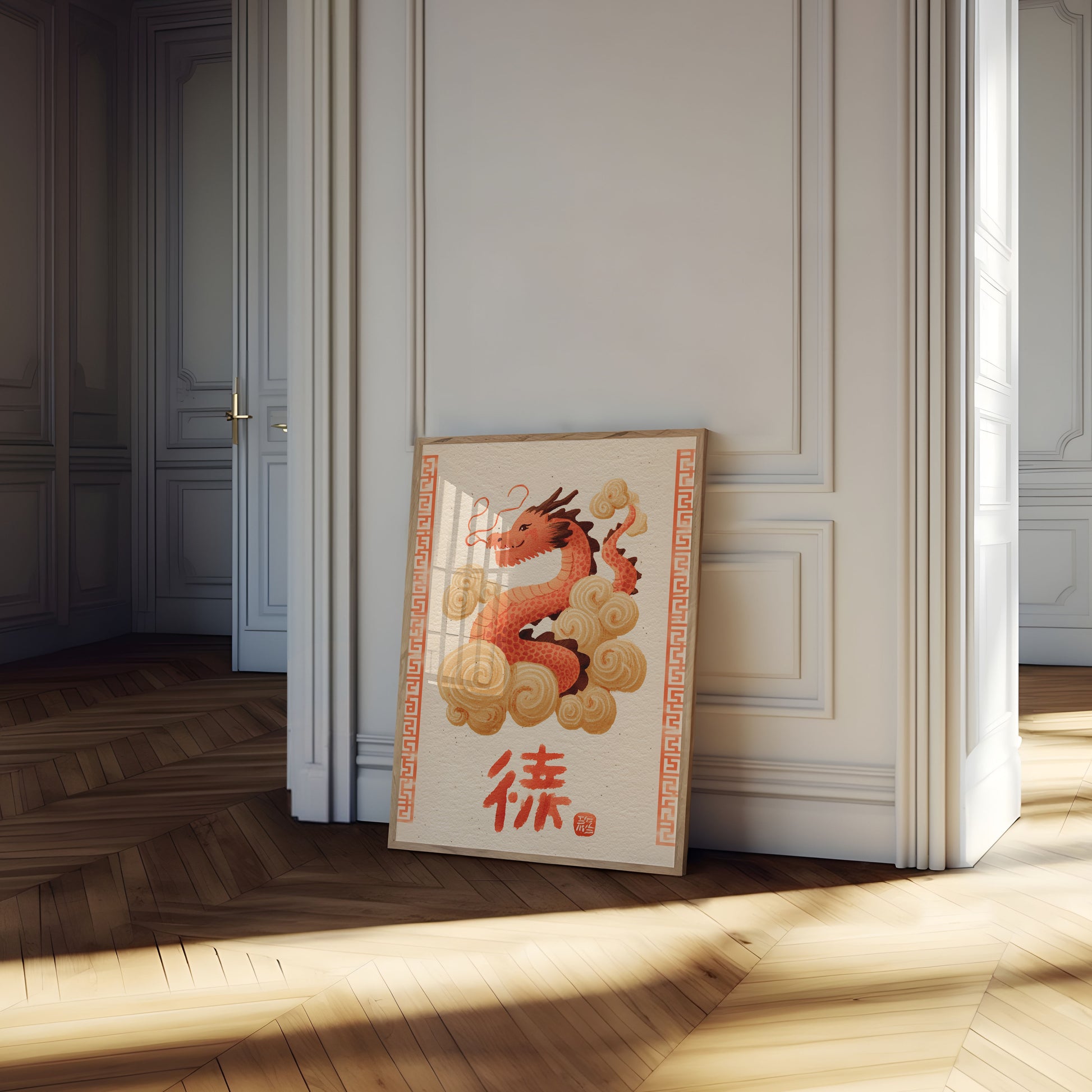 Dive into a mesmerizing world of mythical wonder with this enchanting Chinese-style dragon illustration. Rendered in warm oranges and golden yellows, the stylized dragon emerges from swirling cloud formations, creating a sense of dynamic movement and ethereal energy. Framed by an intricate geometric border, this artistic representation captures the mystical spirit of traditional Asian art with a modern, elegant twist.
