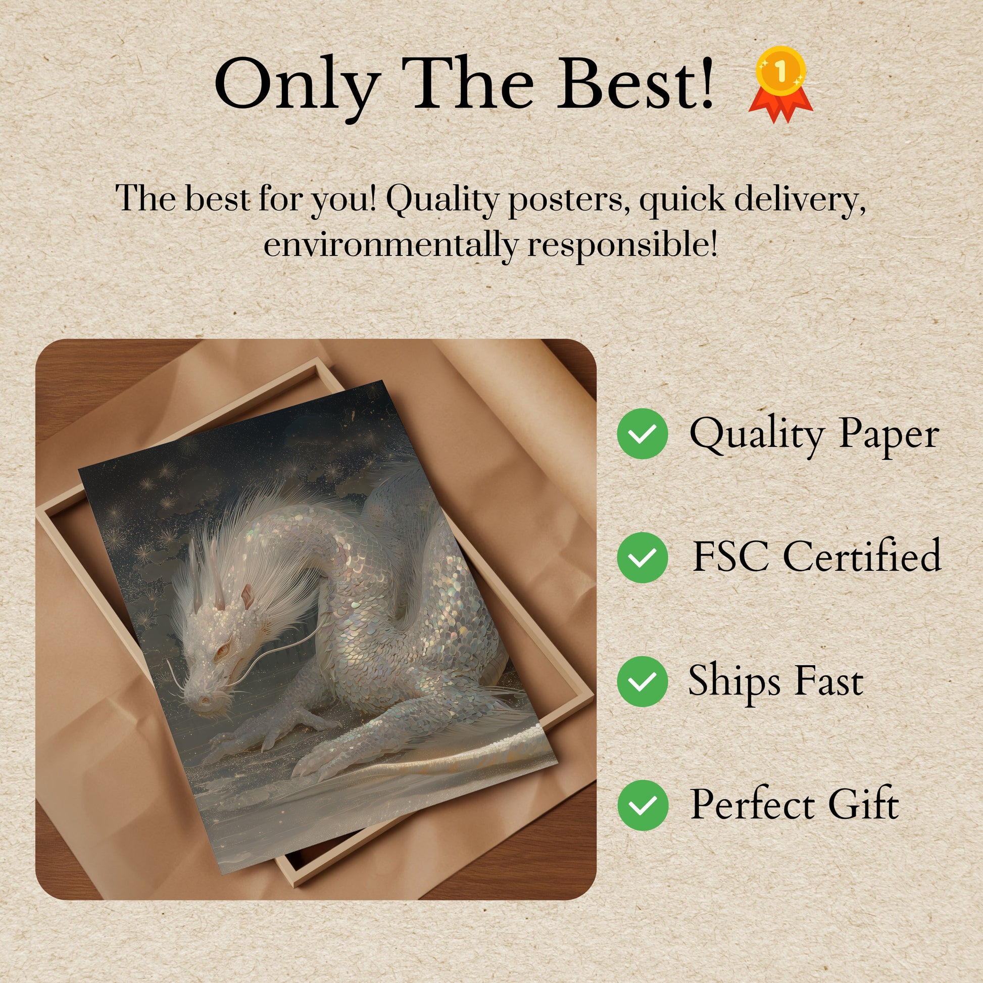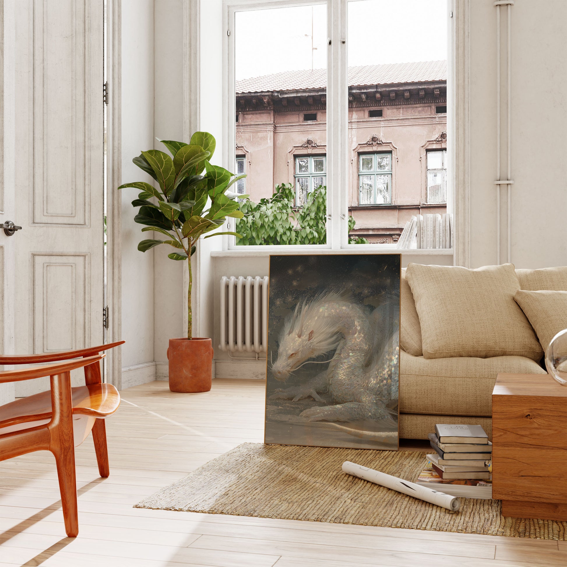 Enter a mesmerizing realm of ethereal beauty with this stunning dragon artwork, where iridescent scales shimmer like starlight and delicate feathered textures blend into a cosmic background. The luminescent creature emerges from a dreamy, silvery landscape, its pearl-like scales capturing every nuance of light and magic in a breathtaking display of mythical elegance.