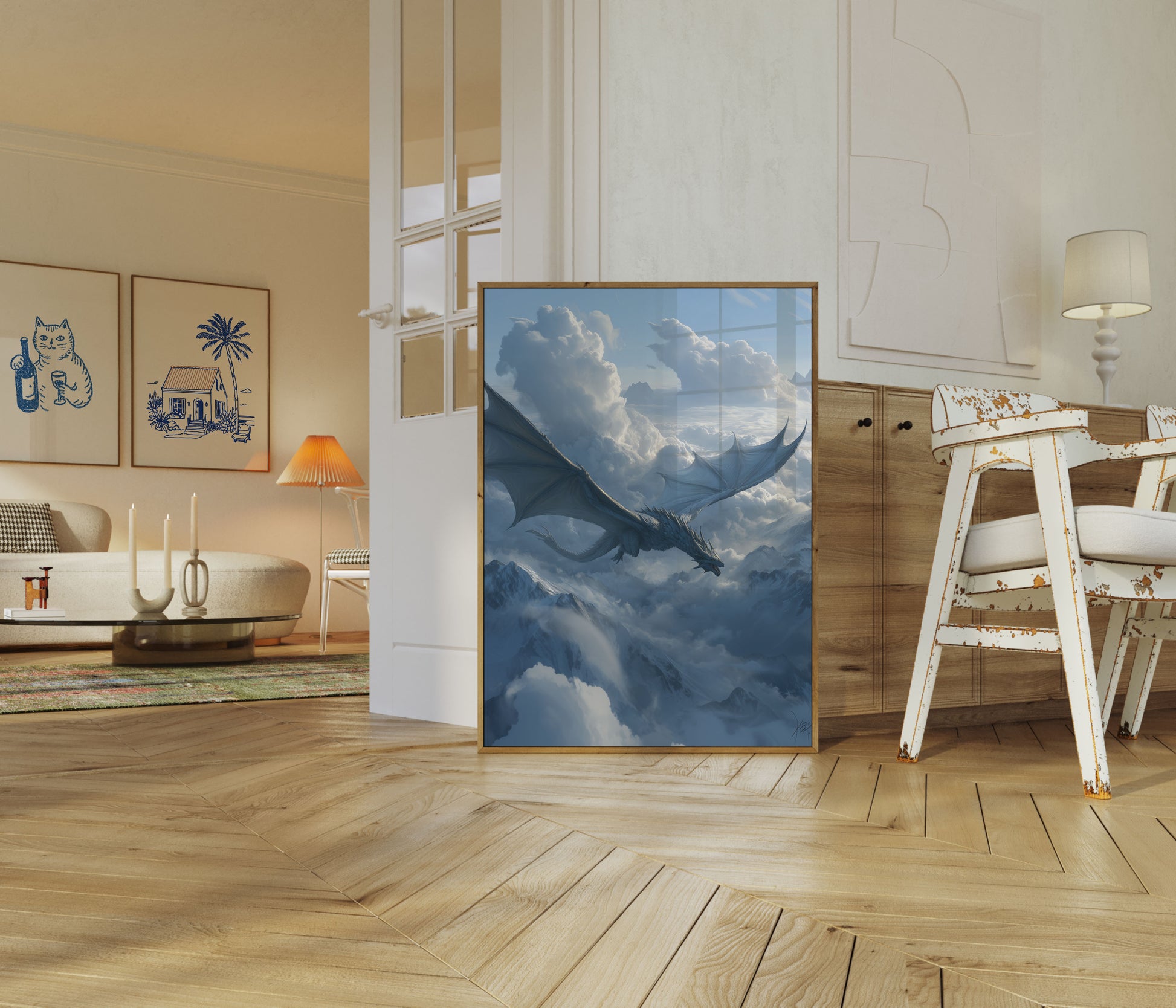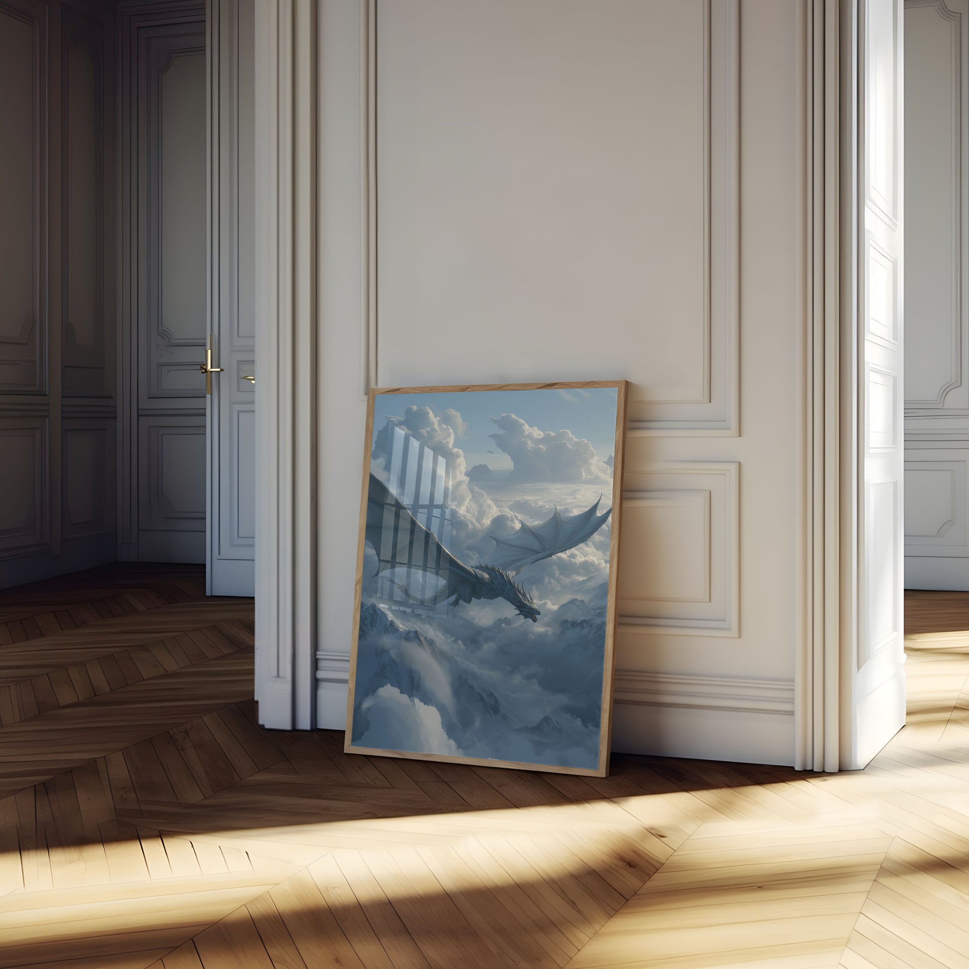 Soar through misty mountain peaks with this breathtaking dragon artwork that captures the ethereal beauty of a majestic winged creature gliding above cloud-laden alpine landscapes. The cool blue tones and dramatic cloudy atmosphere create a sense of serene yet powerful motion, with the dragon's outstretched wings perfectly silhouetted against massive cumulus formations and snow-capped mountain ranges. This stunning piece evokes a sense of mythical freedom and untamed wilderness.