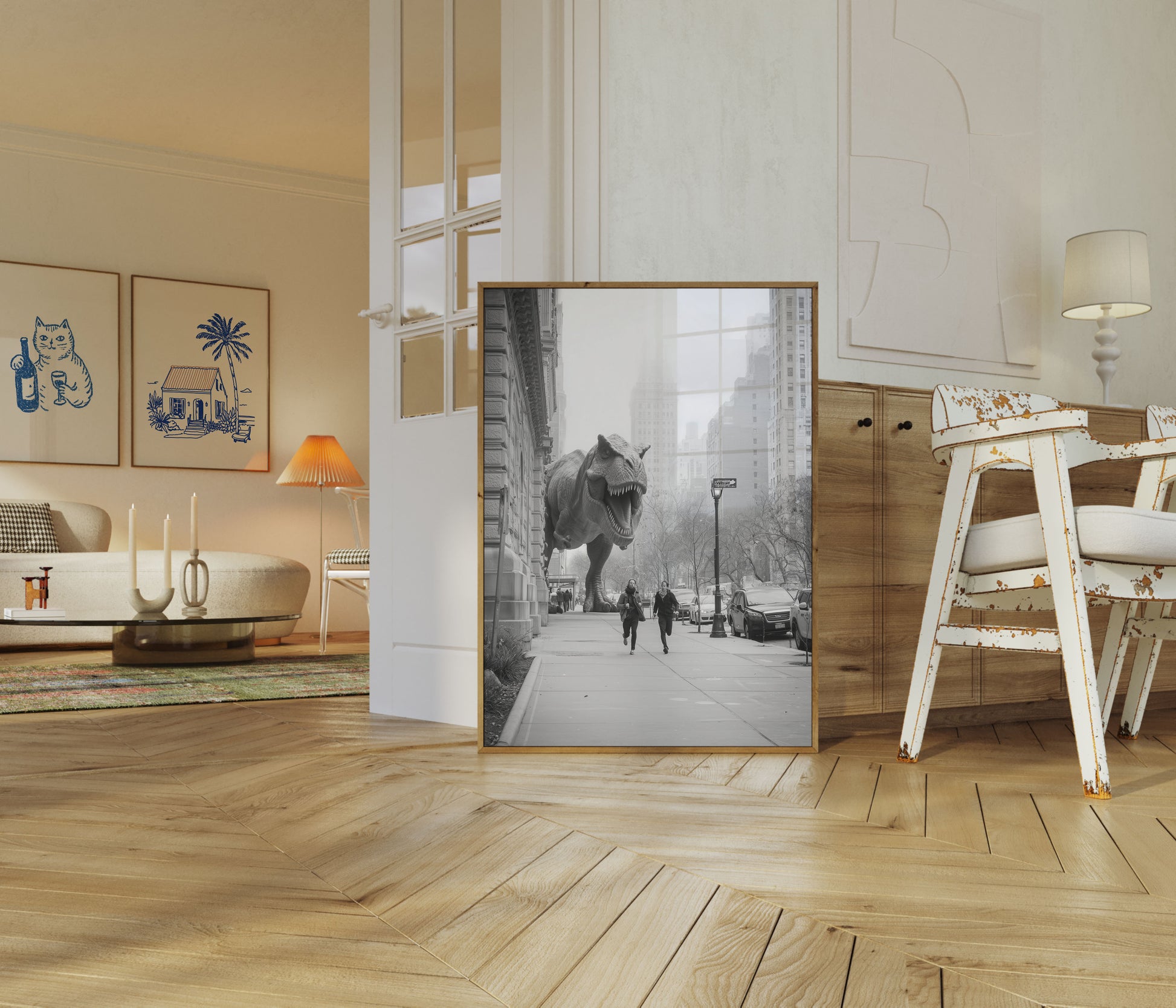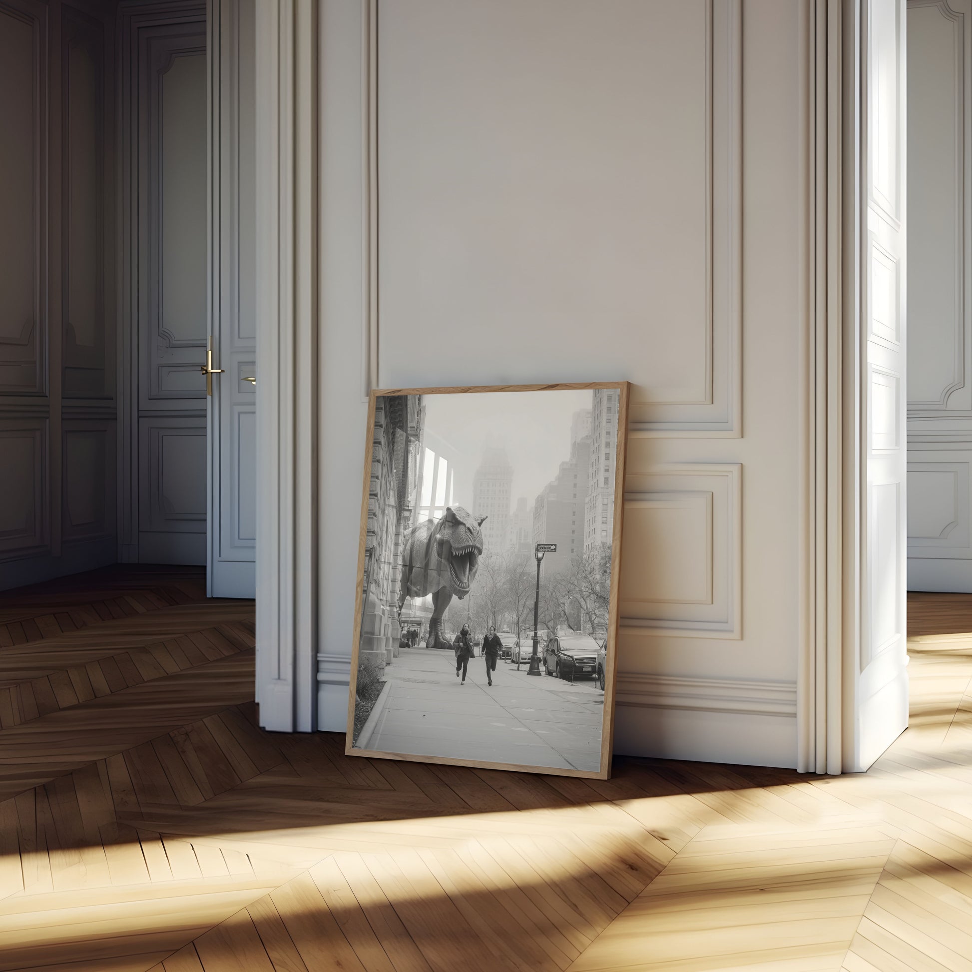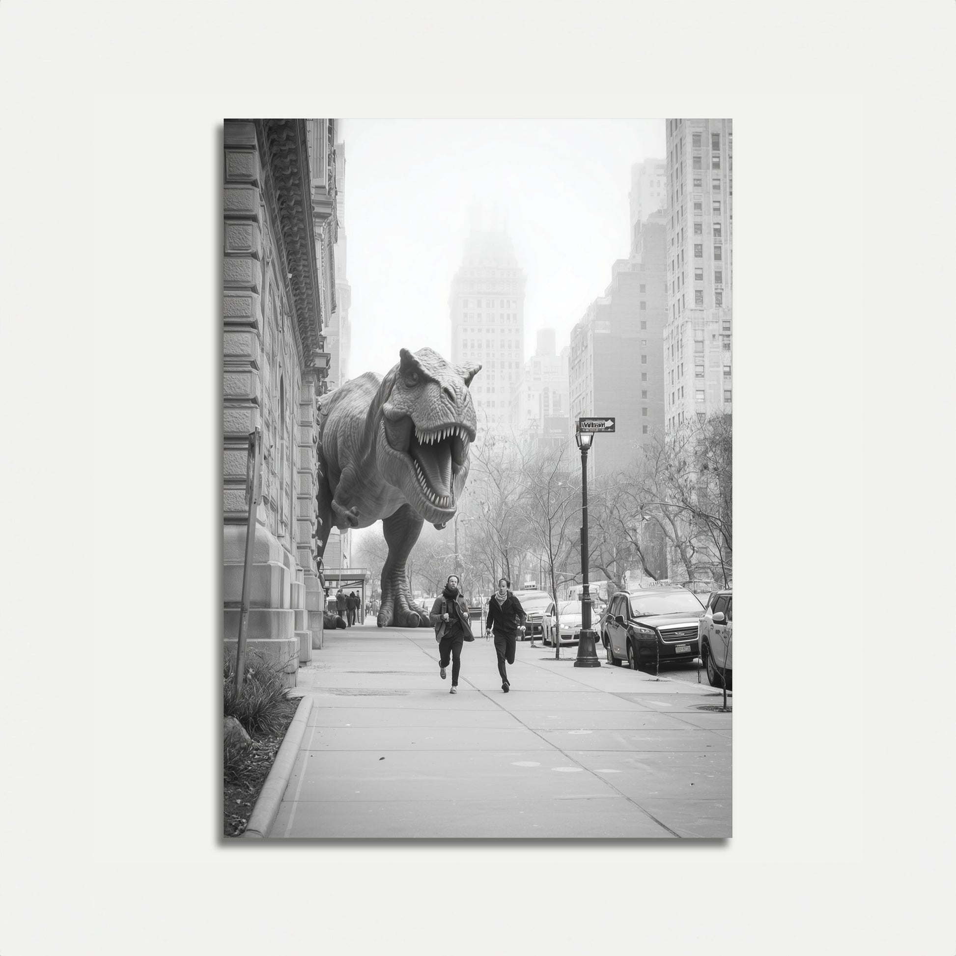 An extraordinary black and white urban fantasy where a massive T-Rex prowls the misty streets of a metropolitan landscape, chasing two running figures through a surreal cityscape. The juxtaposition of prehistoric predator against modern architecture creates a thrilling, cinematic moment that blends science fiction with everyday city life. Dynamic and unexpected, this poster captures an impossible moment of urban adventure.