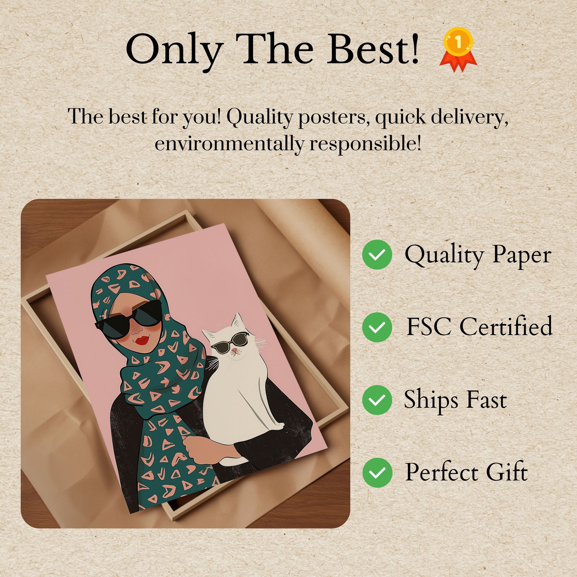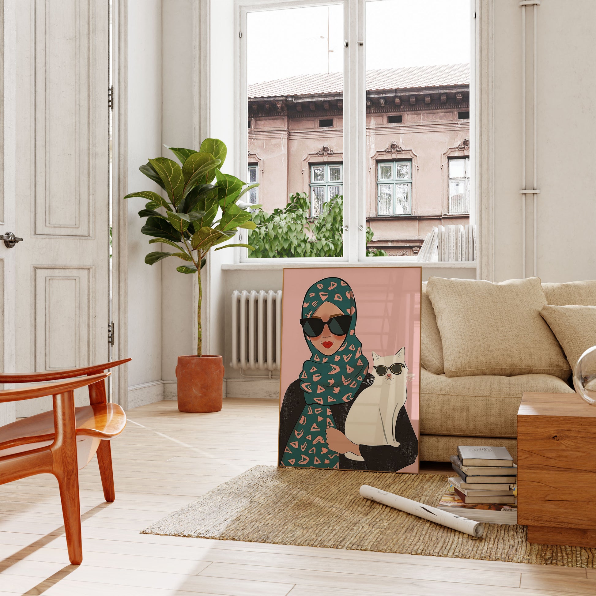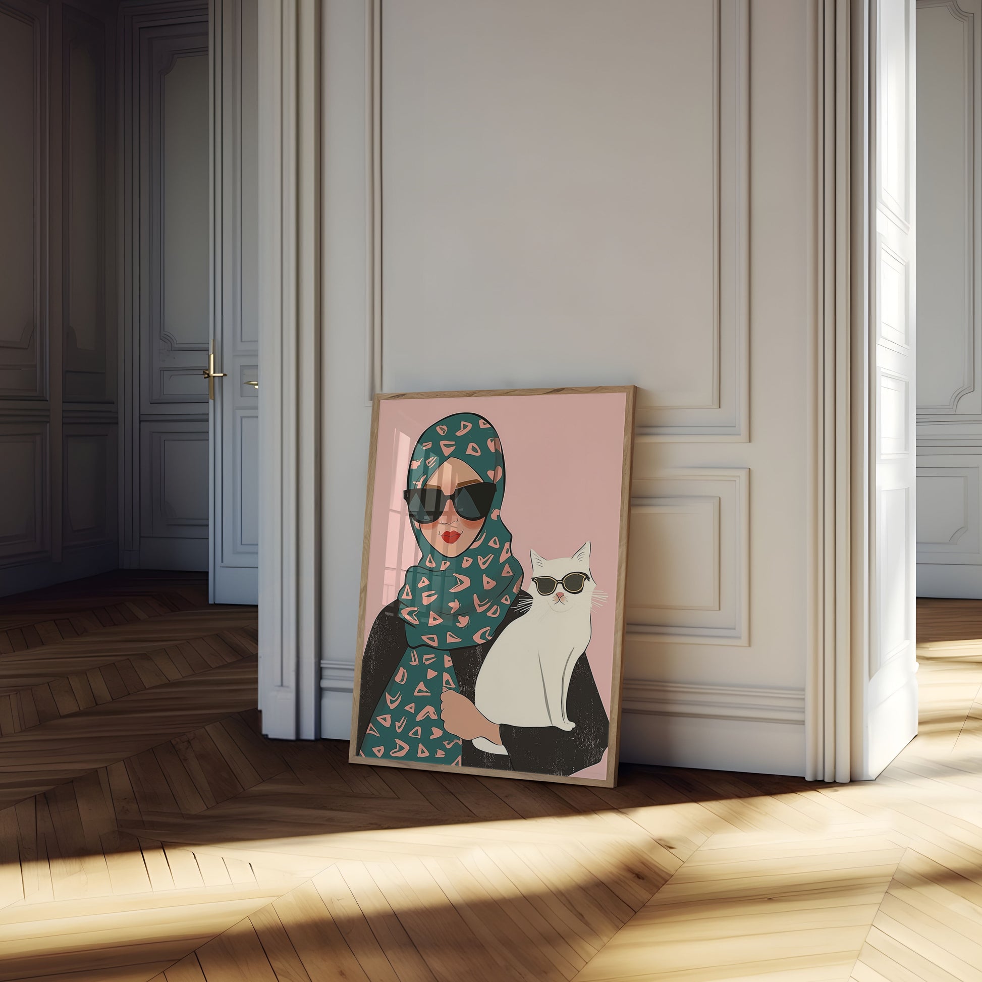 Step into a world of chic style with this trendy illustration featuring a fashionable figure in a teal geometric-print hijab and sleek black sunglasses, perfectly matched by an equally cool white cat sporting its own shades. The soft pink background adds a playful, modern touch to this eye-catching graphic that celebrates individual expression and feline swagger. With its bold geometric patterns, vibrant colors, and quirky companionship, this poster captures a moment of effortless cool.