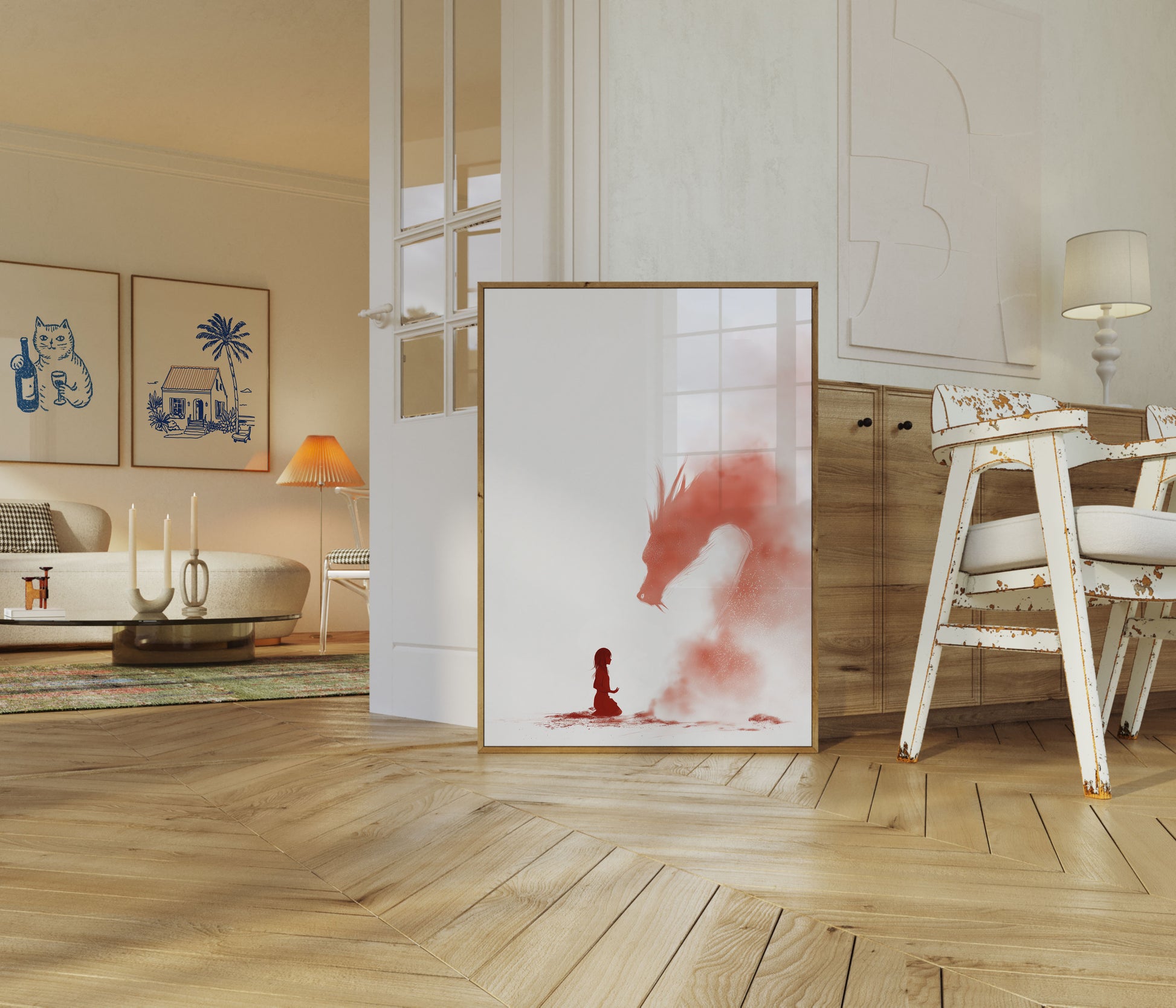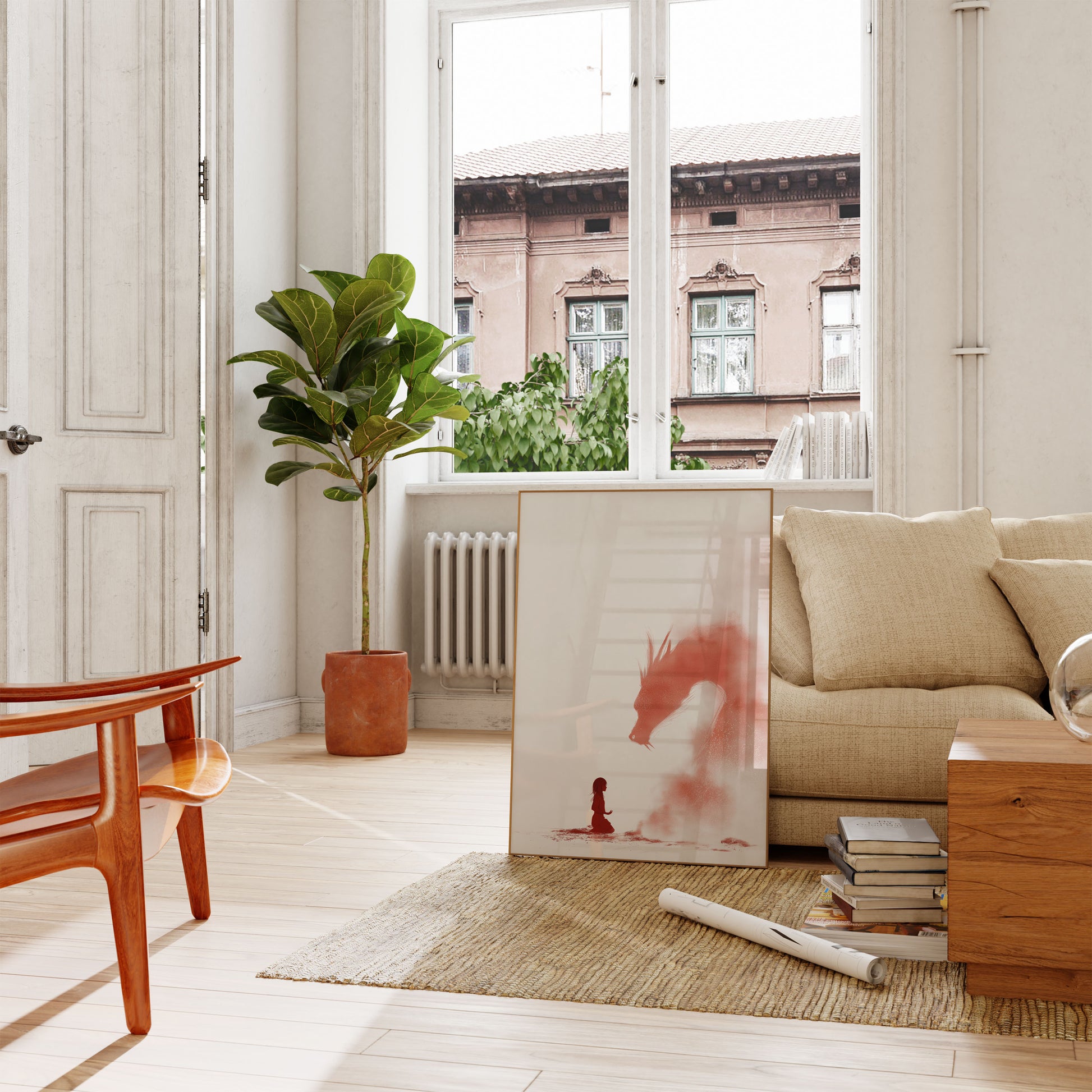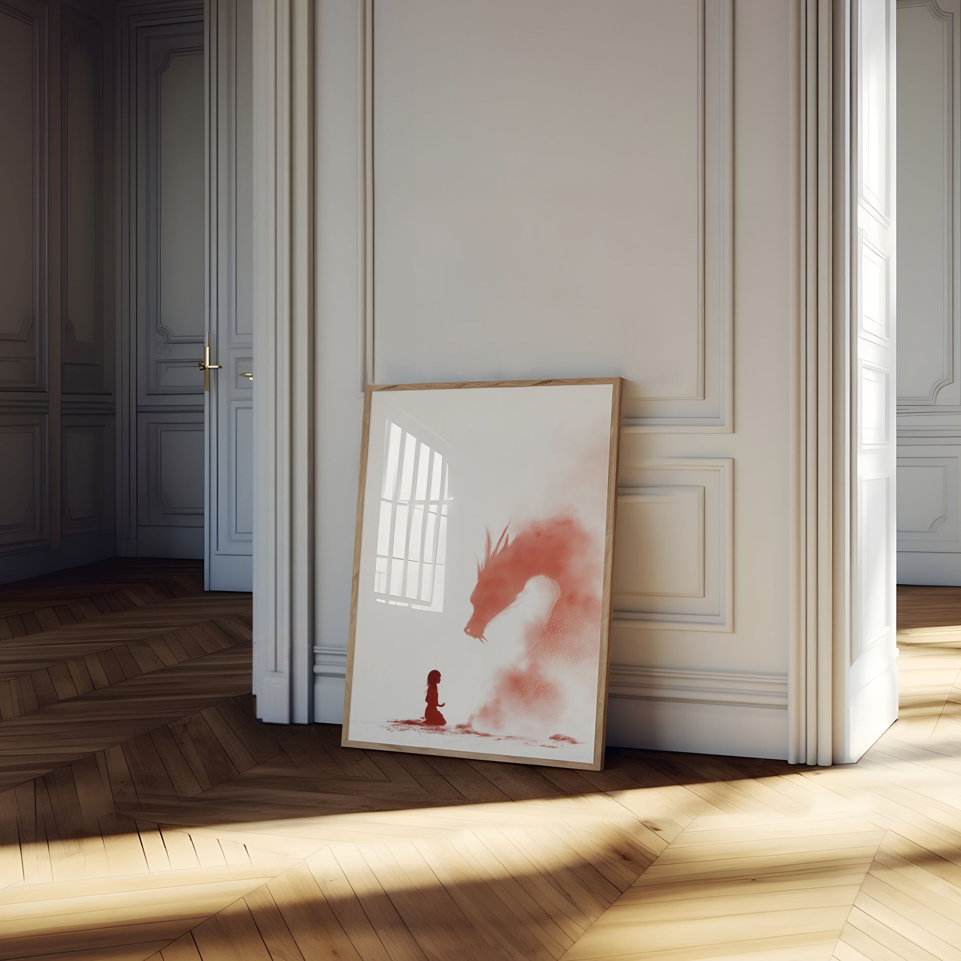 A haunting and ethereal artwork depicting a small silhouetted figure kneeling before a towering, spectral red dragon emerging from misty smoke. The monochromatic red palette creates an intense, dreamlike atmosphere of vulnerability and mystical confrontation. Delicate particles and soft edges give the image a sense of magical transformation and emotional depth.