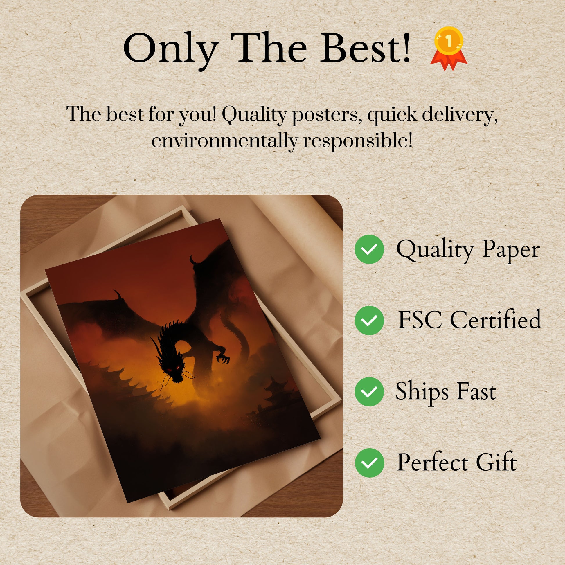 Immerse yourself in the intense, fiery world of this epic dragon artwork, where a menacing silhouette emerges against a blazing orange and red backdrop. The mythical creature spreads its massive wings, casting an ominous shadow over a distant pagoda, creating a breathtaking scene of power and mystique that will transform any room into a portal of imagination.