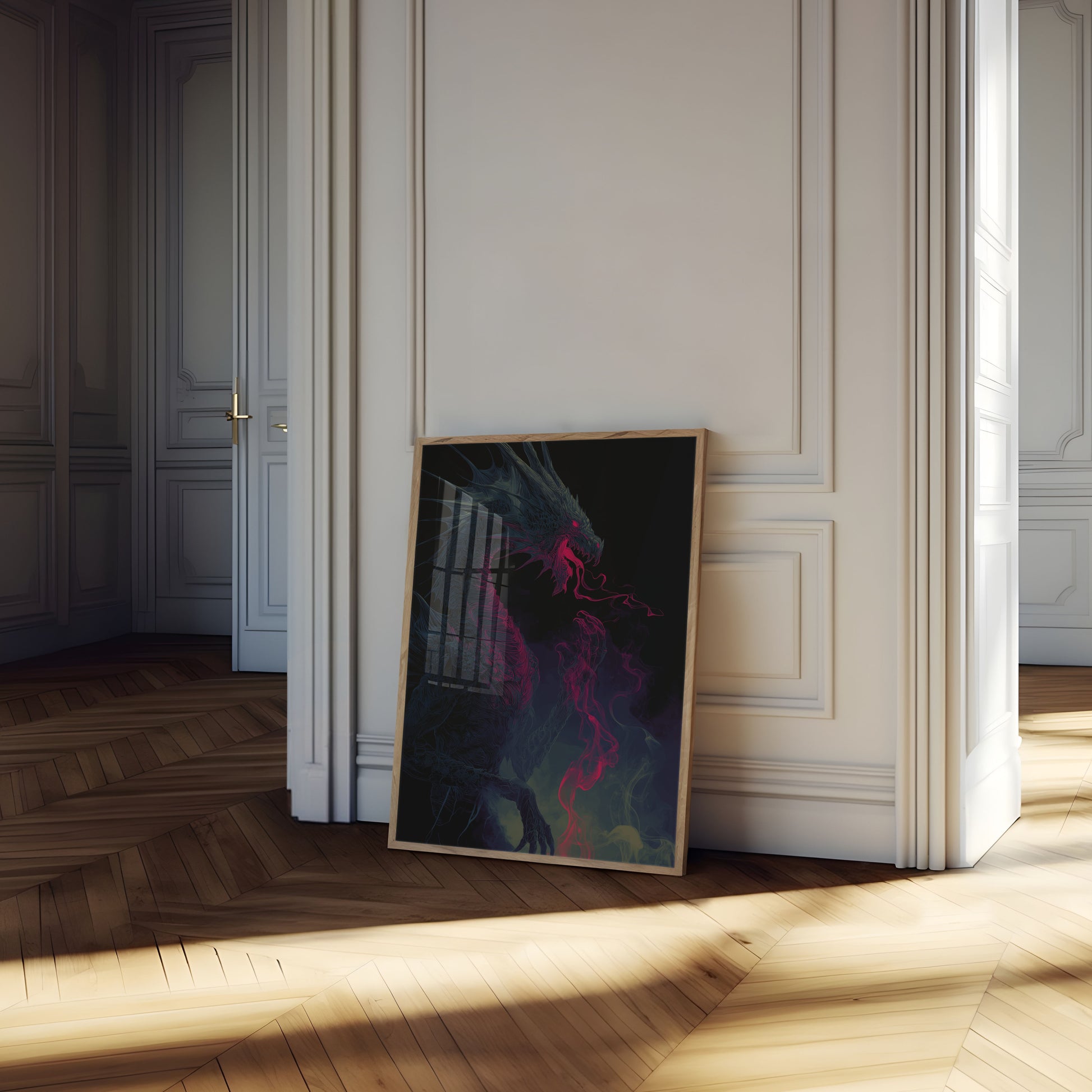 Unleash the dark and mesmerizing power of this stunning dragon artwork, where shadowy blues collide with intense crimson flames. The intricate, almost biomechanical design captures a mythical creature emerging from darkness, its glowing red eyes and ethereal smoke creating an atmosphere of raw, primal energy. This piece transforms any space into a portal of fantastical mystery and supernatural intensity.