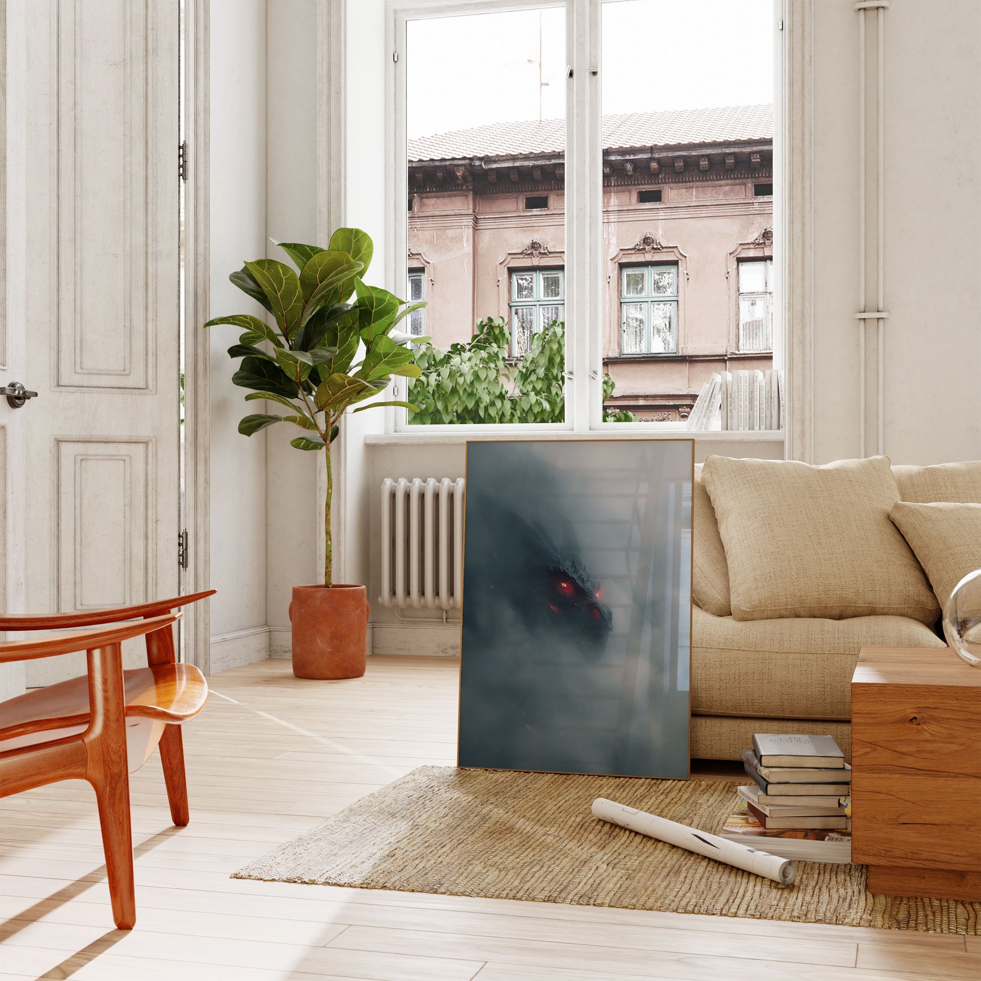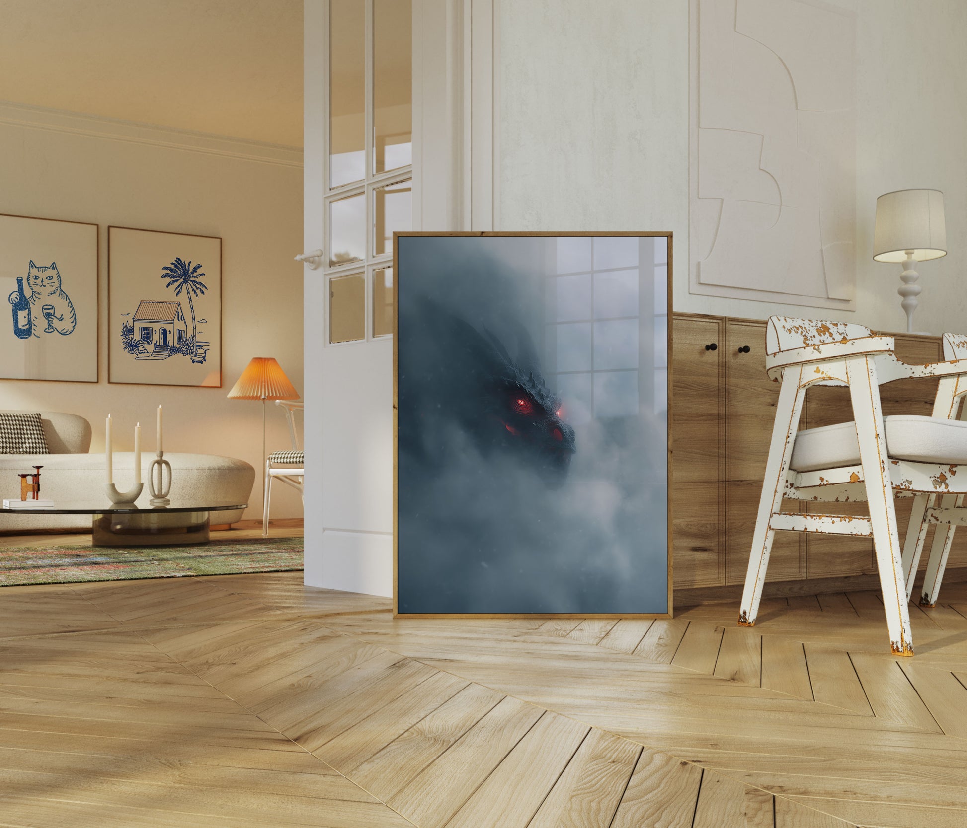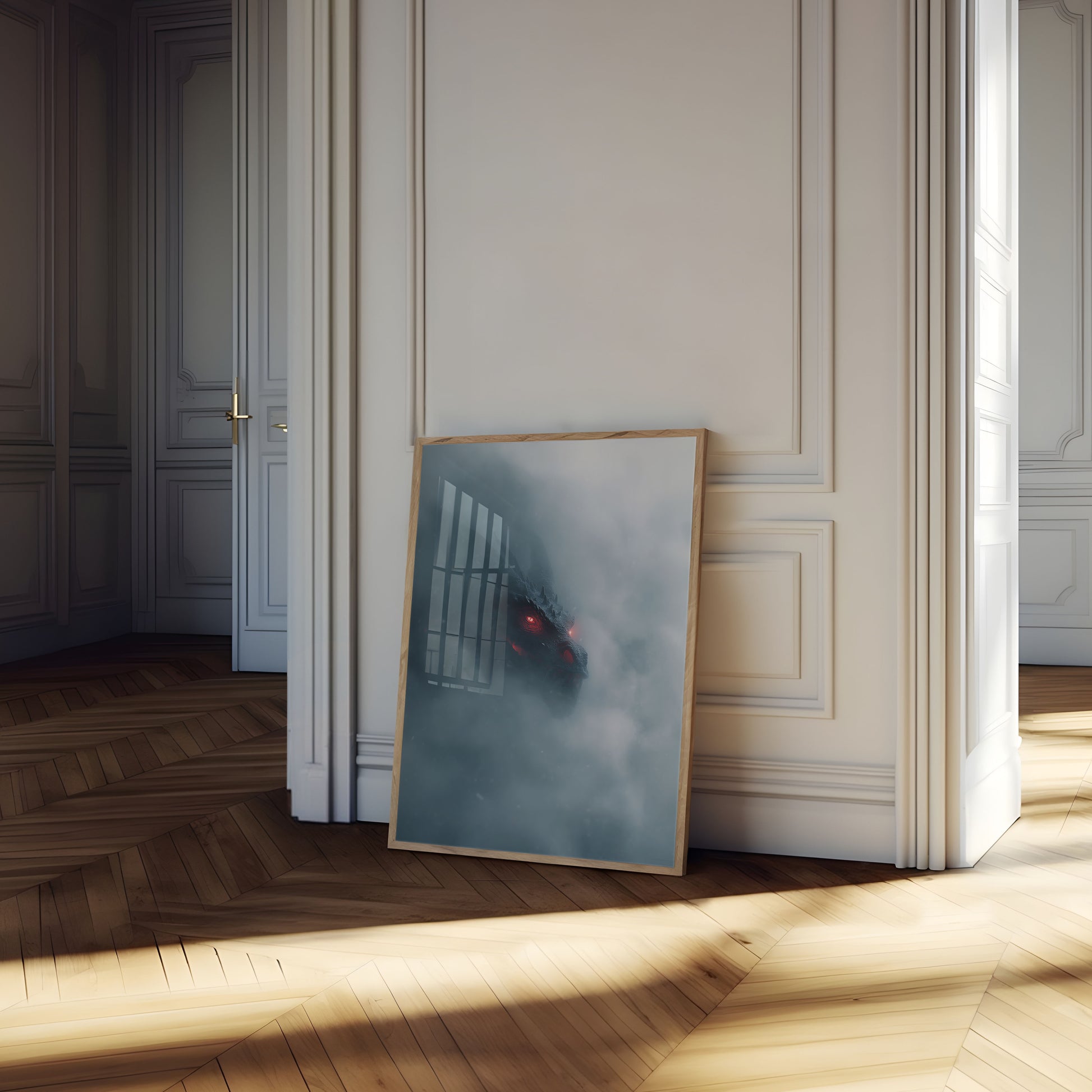 Emerge into a world of mystical darkness with this haunting dragon portrait, where steely scales and blazing red eyes pierce through a misty, ethereal landscape. The creature's silhouette looms with primordial power, its menacing gaze promising ancient secrets and untold legends hidden within swirling gray clouds. This mesmerizing artwork captures the raw, primeval essence of mythical beast emerging from shadowy depths.