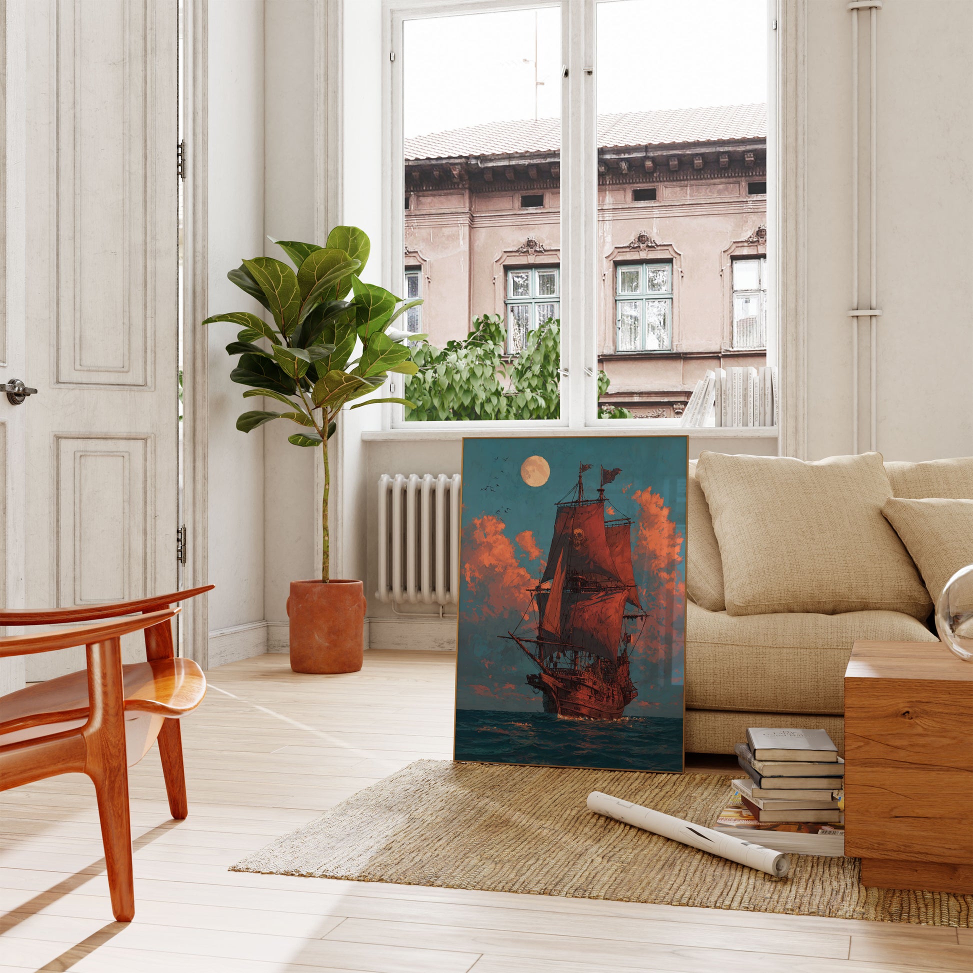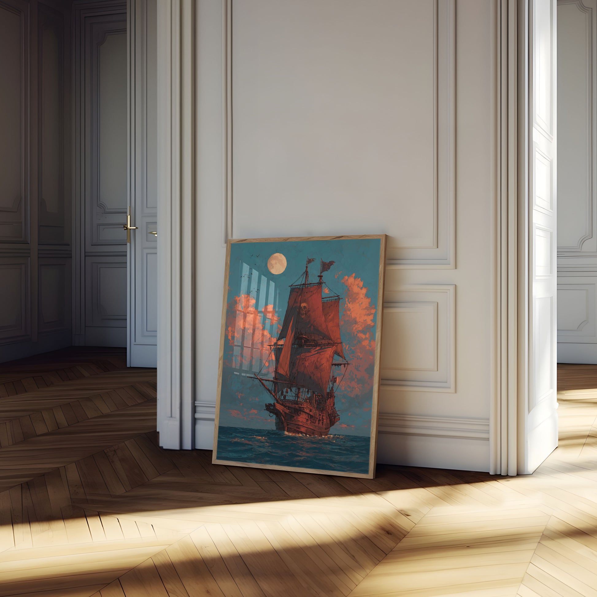 Drift into a world of maritime mystery with this hauntingly beautiful pirate ship artwork. Bathed in deep crimson and teal, the tall-masted vessel cuts through moonlit waters, its ragged sails emblazoned with a spectral skull emblem. The full moon hangs like a silent witness, while dramatic orange clouds frame this breathtaking nautical scene of maritime adventure and supernatural intrigue.