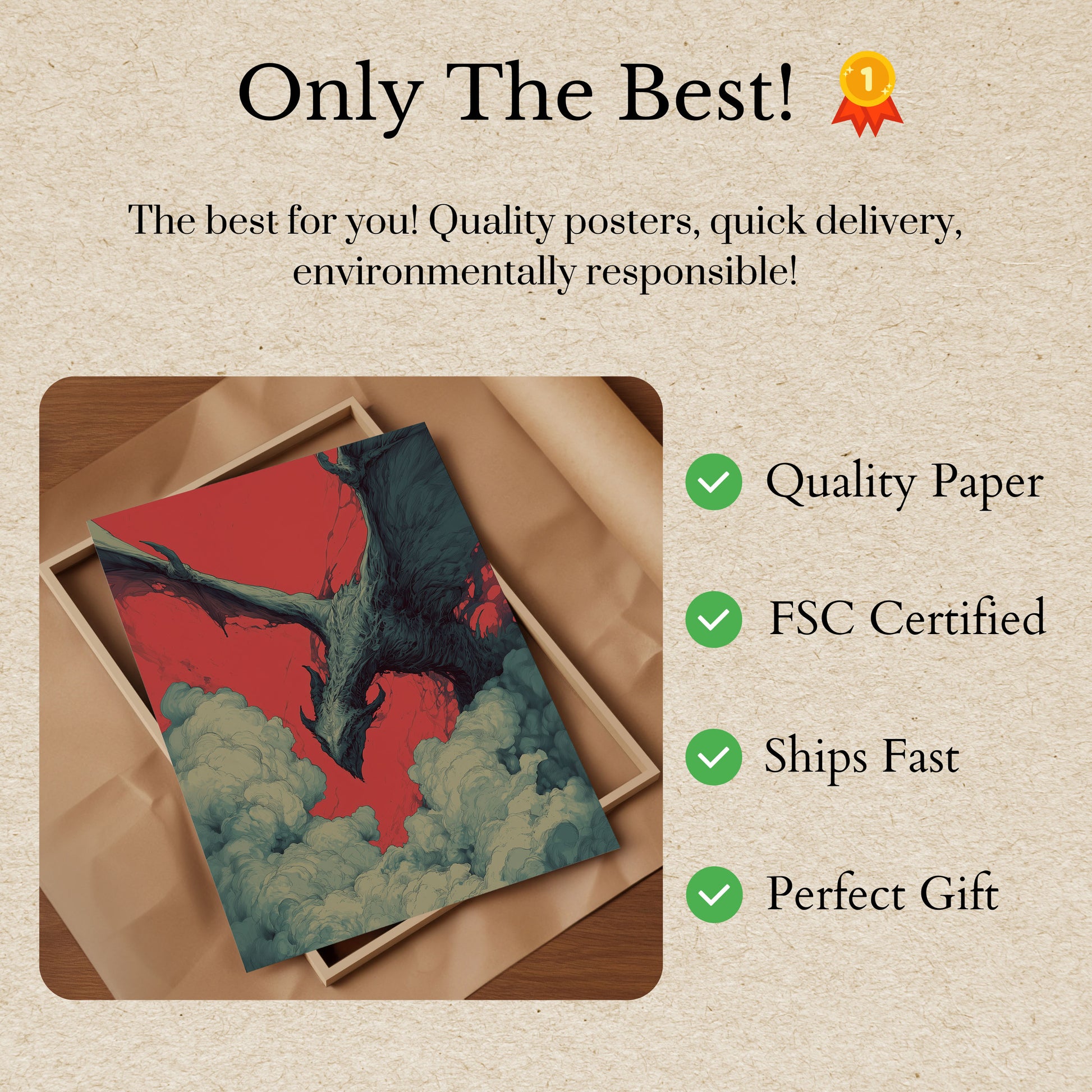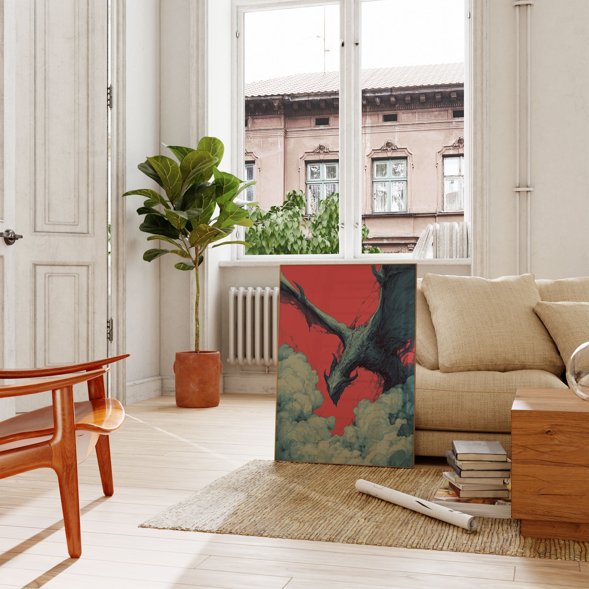 Immerse yourself in the breathtaking drama of this intense dragon artwork, where a menacing, otherworldly creature emerges from billowing clouds against a fierce crimson backdrop. The intricate, textured dragon seems to slice through the turbulent atmosphere with sharp, razor-like edges, creating a mesmerizing sense of power and mystique. Rendered in deep teals and slate grays, contrasted by a burning red background, this poster captures the raw, primal essence of mythical fantasy.