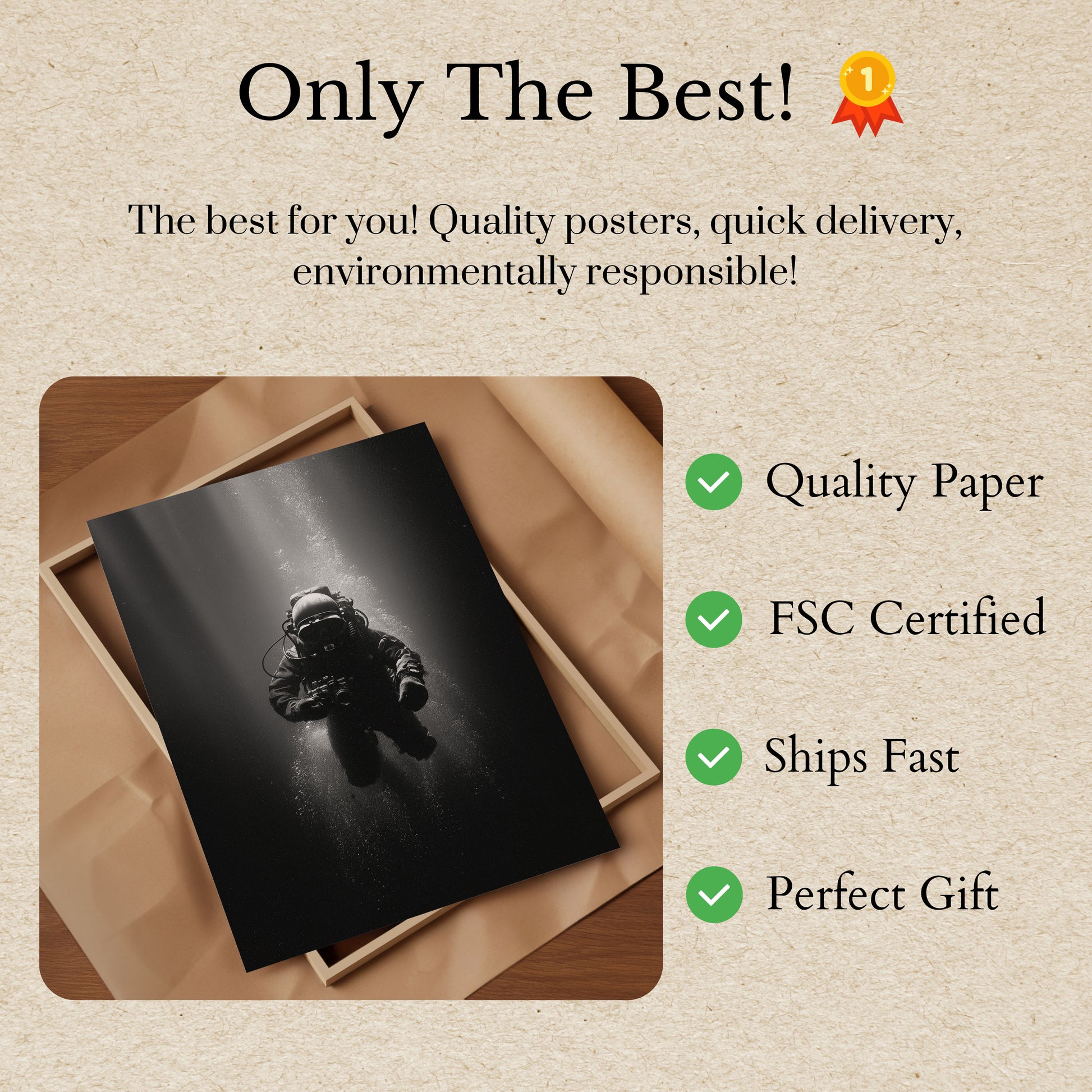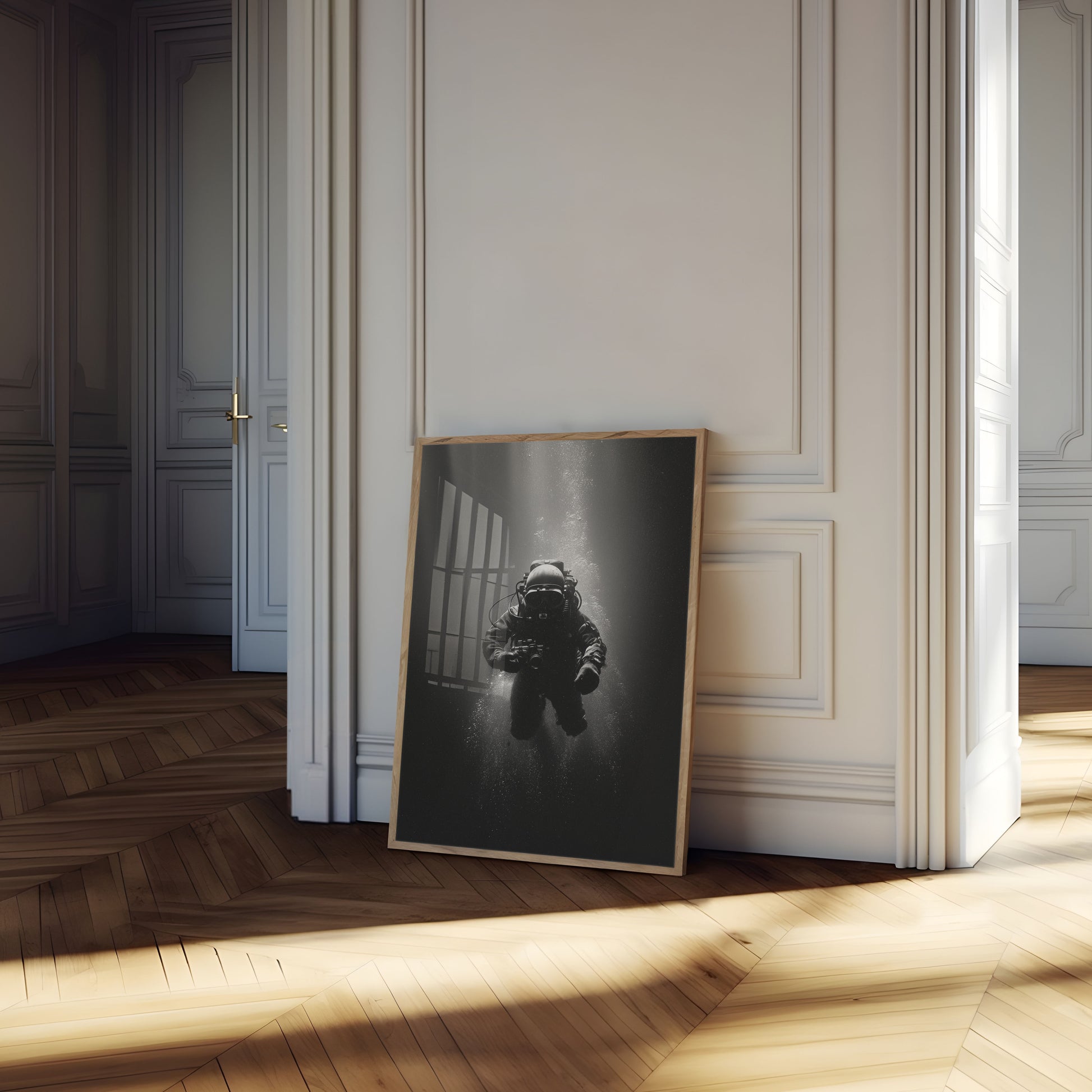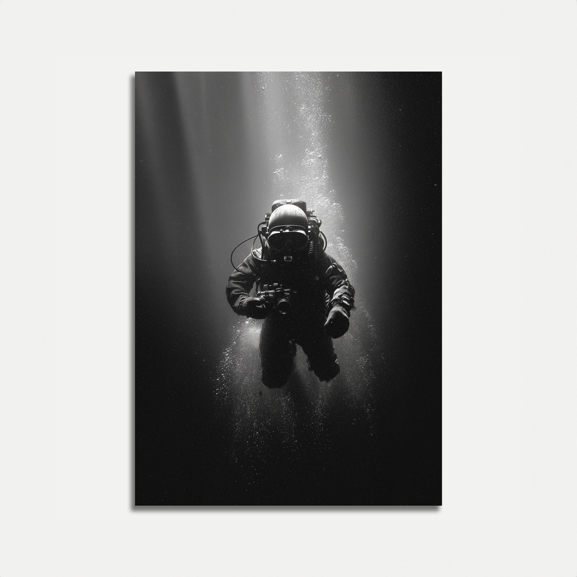 Dive into the mesmerizing world of underwater exploration with this stunning black and white photograph. A scuba diver emerges from the dark depths, surrounded by a luminous halo of bubbles and light, creating a dramatic and intense visual experience. The monochromatic image captures the solitude, mystery, and ethereal beauty of underwater adventures, inviting viewers to explore the unknown.