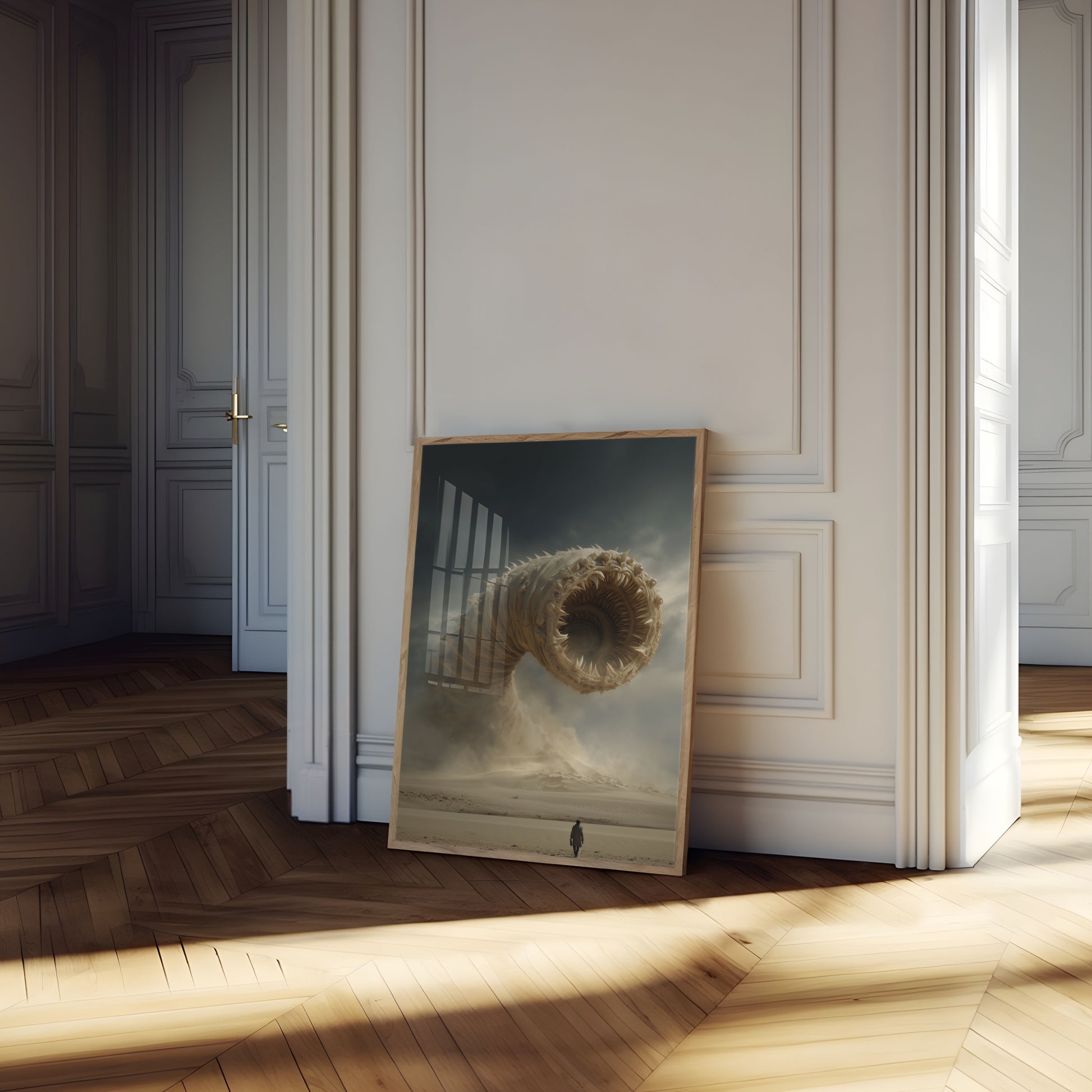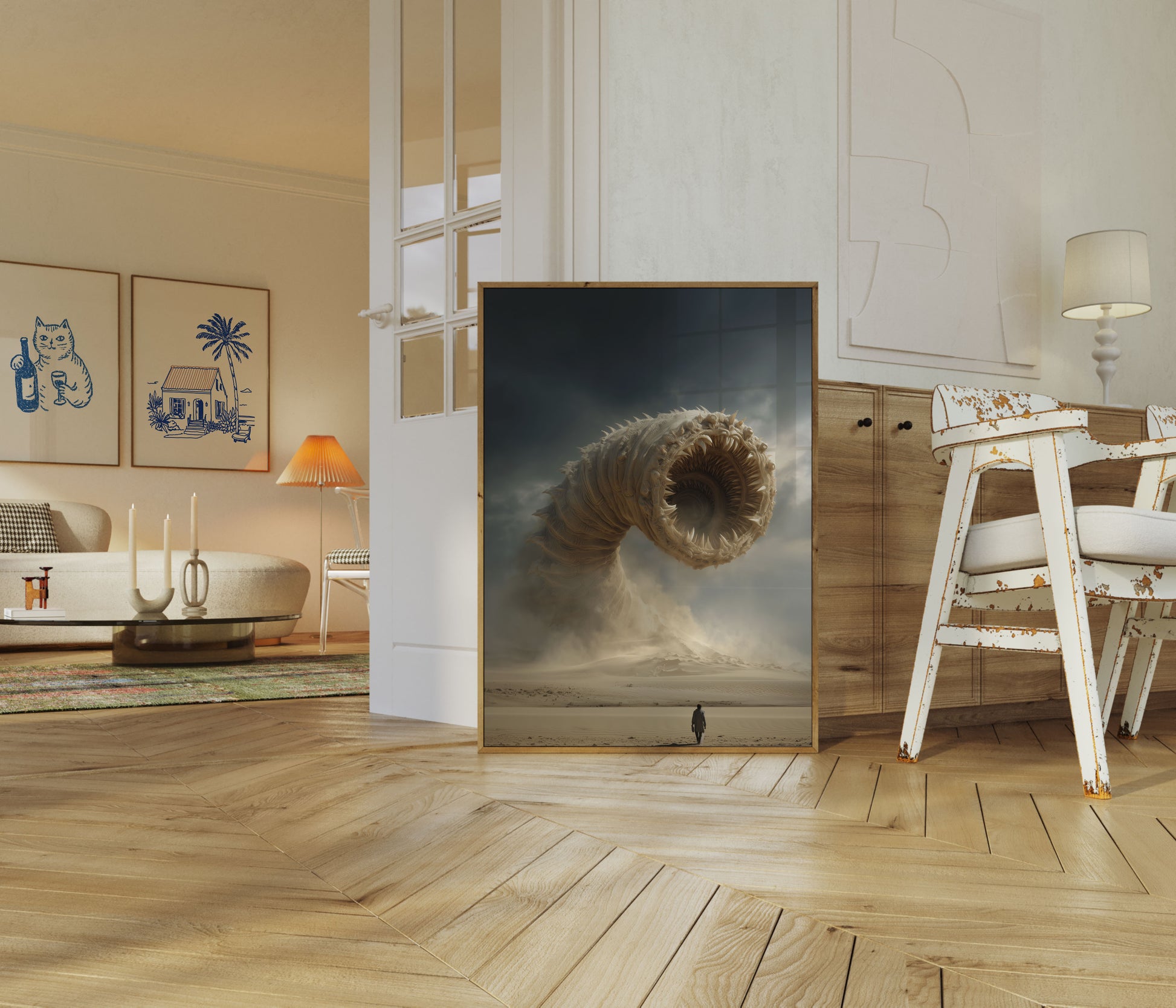 Immerse yourself in the breathtaking world of a massive sandworm rising from a desolate desert landscape. This stunning artwork captures the raw power and alien beauty of a colossal creature towering over a solitary figure, creating an awe-inspiring scene of scale and mystery. The muted sandy tones and dramatic clouded sky evoke the epic atmosphere of a science fiction masterpiece.