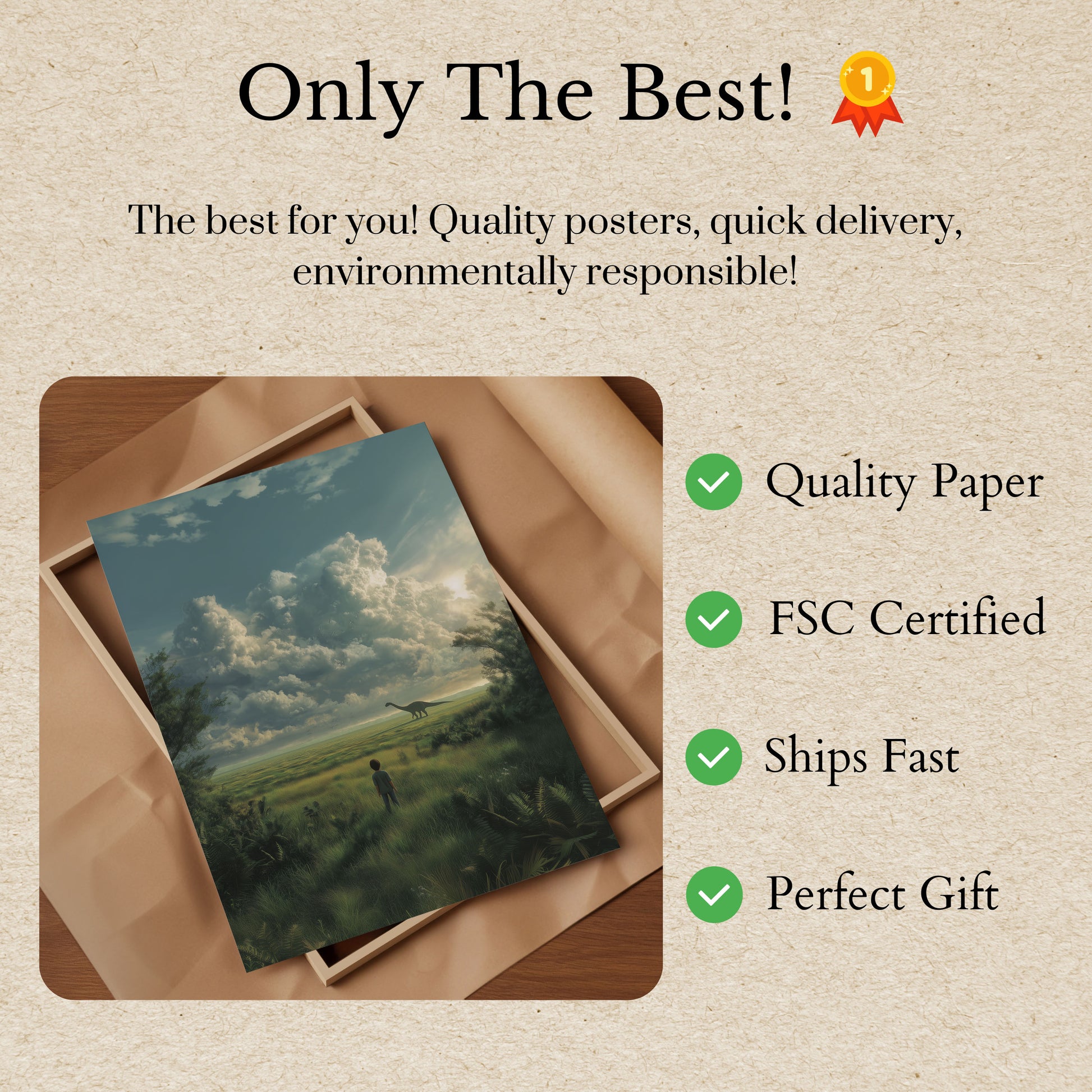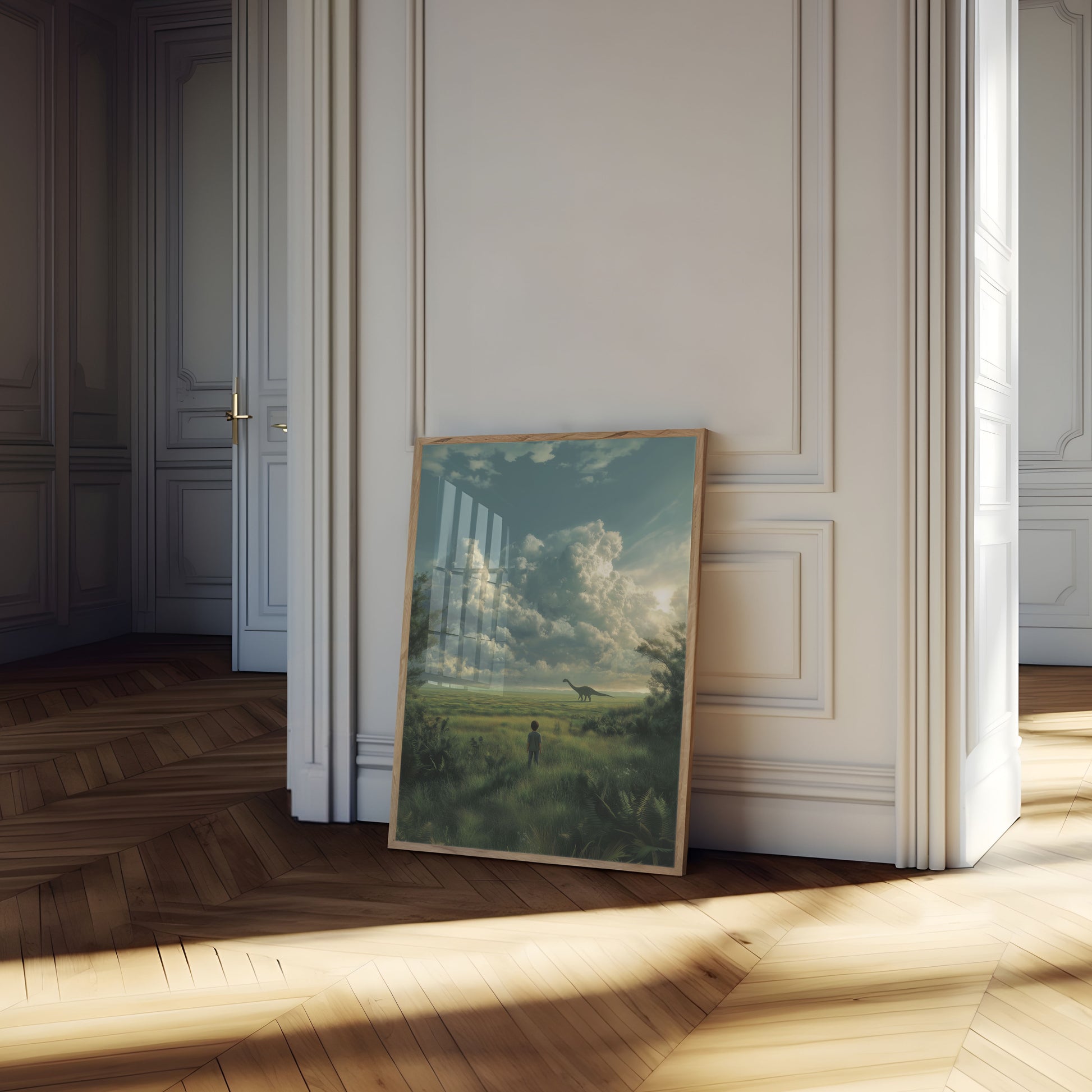 A breathtaking landscape where imagination meets prehistoric wonder, this poster captures a solitary figure gazing across a lush green meadow at a majestic brontosaurus silhouetted against towering cumulus clouds. The soft, dreamy color palette and dramatic sky create a sense of infinite possibility, inviting viewers to step into a world where childhood wonder and ancient earth collide. Immerse yourself in this stunning scene that blends reality and fantasy with ethereal beauty.