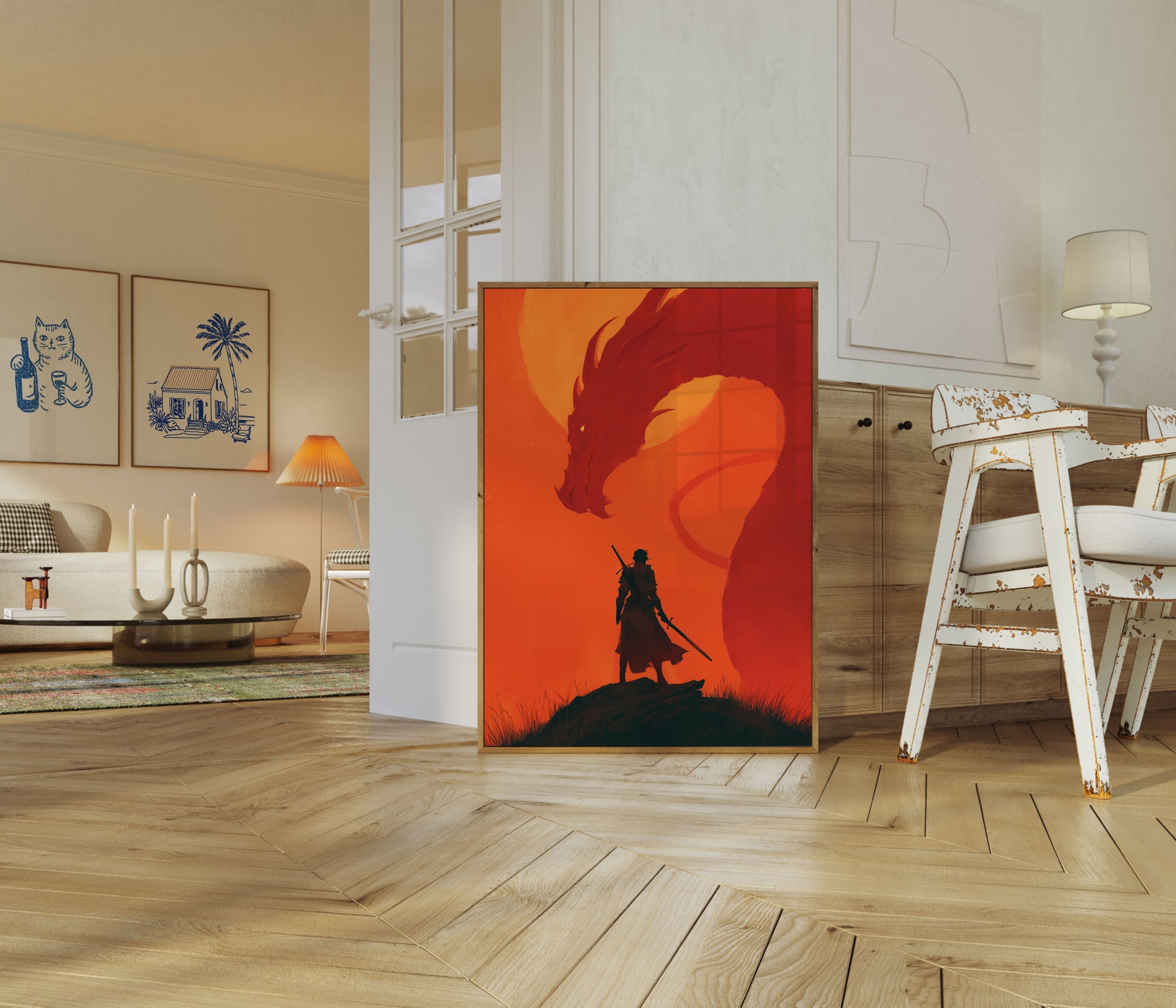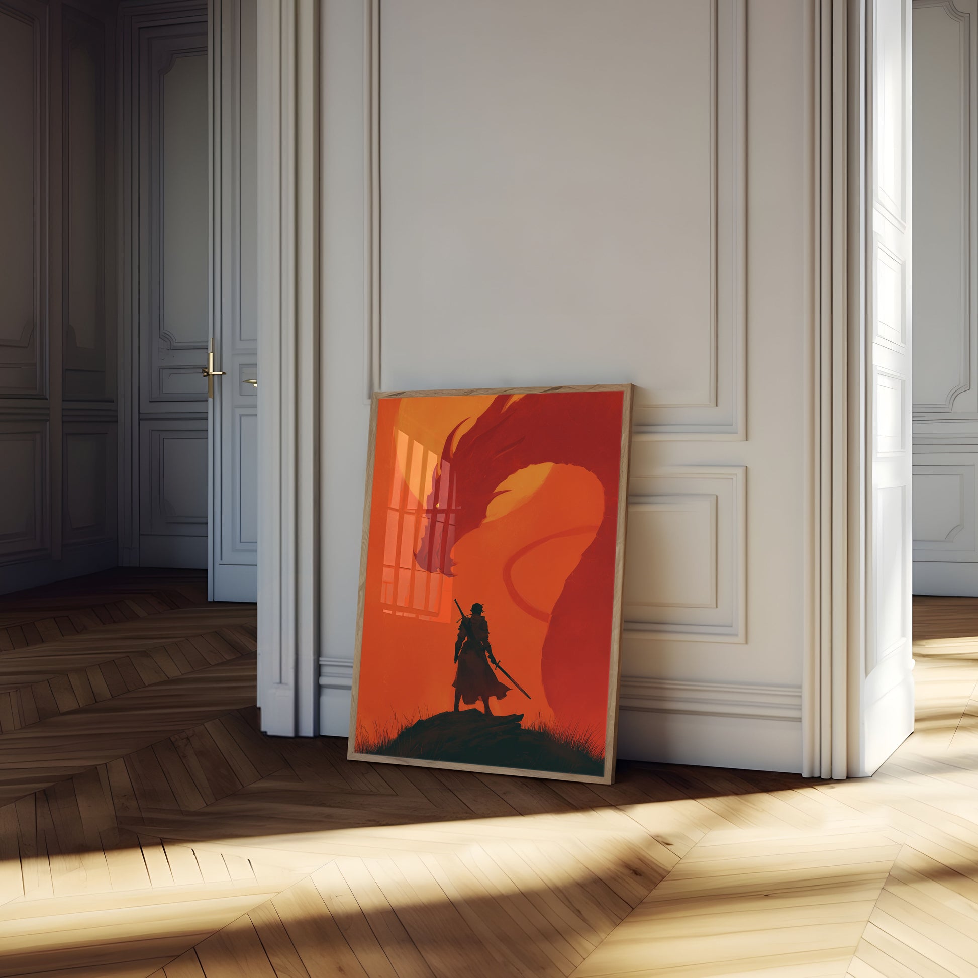A breathtaking silhouette artwork capturing an epic moment of tension between a lone warrior and a massive dragon against a fiery orange and red backdrop. The image pulses with dramatic energy, showcasing the warrior standing resolute on a rocky outcrop, sword in hand, facing an enormous serpentine dragon whose form dominates the sunset-like sky. Every element speaks to courage, challenge, and the mythical confrontation between human determination and legendary power.